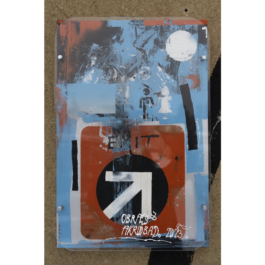 Středem obrazu je přepracovaná dopravní značka se šipkou a nápisem EXIT, přes kterou se překrývají škrábance, otisky a modré i červené plochy. Jakoby snad strávila roky na rušné křižovatce. V horní části se objevují drobné figury a kruh připomínající měsíc, což dodává dílu lehce snovou atmosféru. Hrubší struktura a patrné stopy po zásazích barvou odkazují k ulici a ke kultuře recyklace nalezených objektů (upcyklaci). Obraz ocení každý, kdo má rád výraznou vizuální zkratku a hledá symbol změny, směru a osobního „východu“ z rutiny.