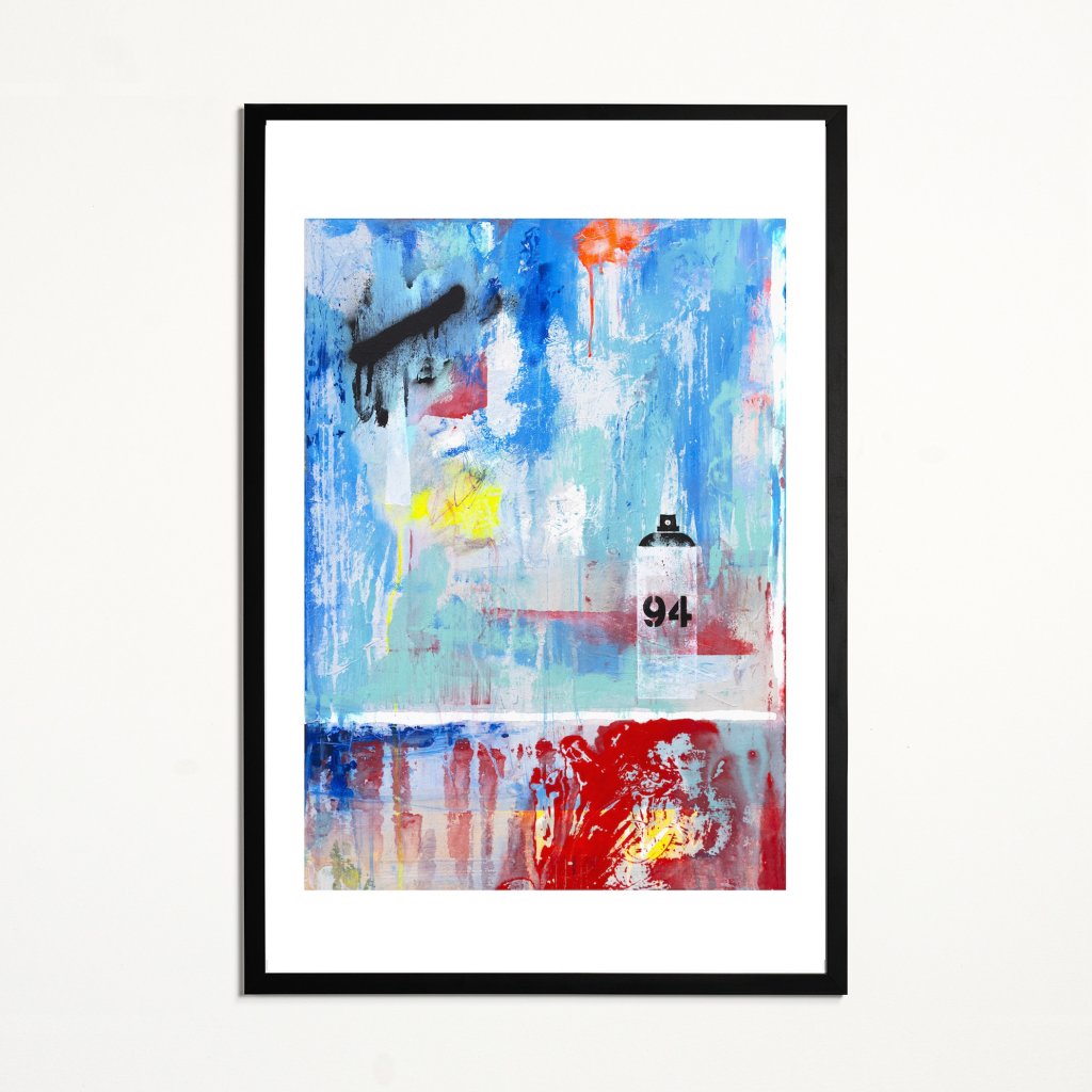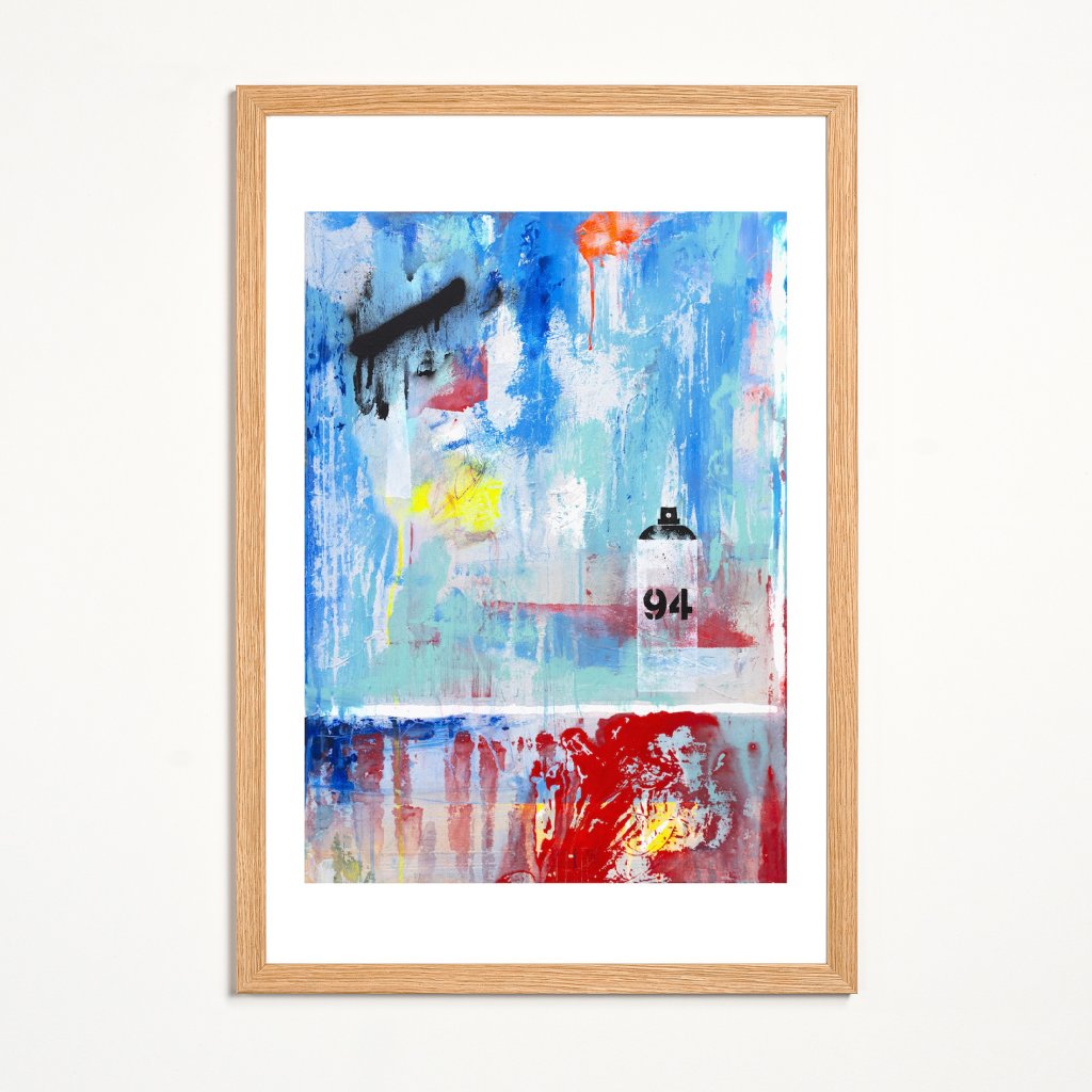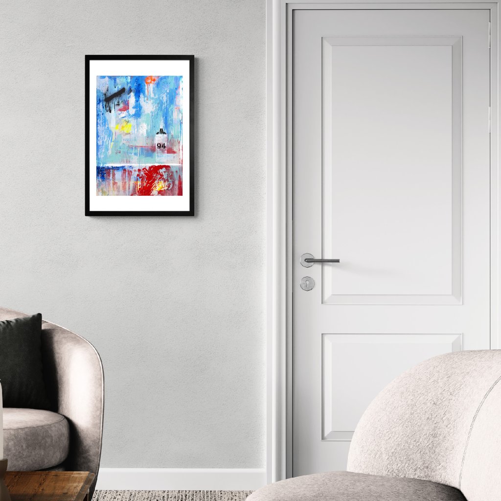 Obraz staví na volně stékajících vrstvách modré, tyrkysové a červené, které vytvářejí dojem oprýskané zdi proměněné v poetickou abstrakci. Malý motiv spreje s číslem „94“ připomíná kořeny ve street artu a nechává tušit, že barva je nástroj svobody a sebevyjádření. Kontrasty mezi jemnými přechody a ostrými stopami černé dodávají plátnu živost i hloubku. Dílo dobře doplní prostory, které chtějí zůstat vzdušné a zároveň mít výrazný, ale neokoukaný vizuální prvek.