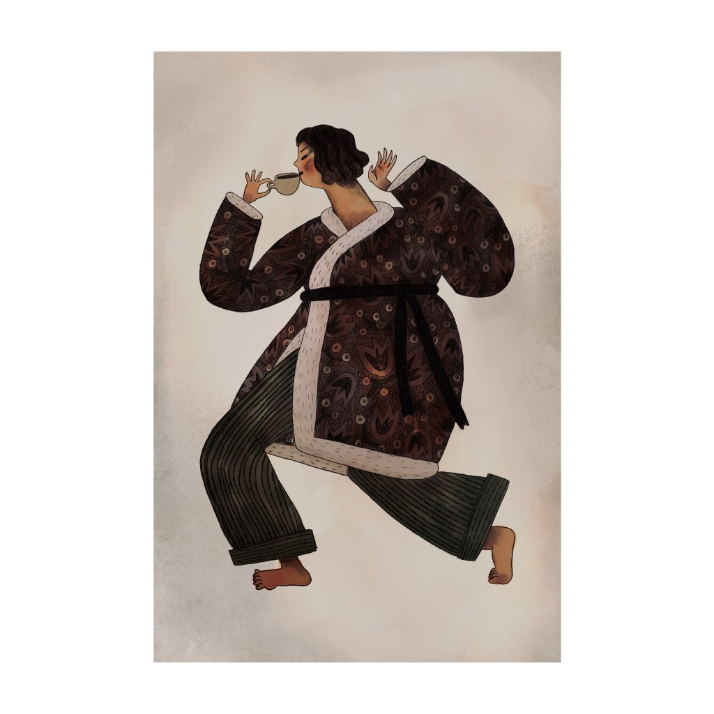 Ilustrace zachycuje ženskou postavu s bosýma nohama, v pruhovaných kalhotech a měkkém županu s výrazným vzorem. V ruce šťastně drží šálek s čerstvou kávou, který se stává středem celého okamžiku. Scéna působí spontánně, téměř tanečně, jako by šlo o krátký záběr z rána, kdy den ještě nezačal naplno a je možnost si v klidu vychutnat svůj oblíbený nápoj.