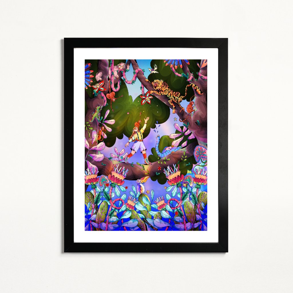 Magická džungle, kde se mezi rozkvetlými rostlinami a exotickými zvířaty odehrává příběh velkého dobrodružství. Styl s jemnými přechody, výraznými konturami a zářivou paletou barev vytváří pocit radosti a bezpečného napětí. Každý detail zve k objevování a podporuje dětskou fantazii i dospělou touhu vrátit se k hravosti. Print se stane dominantním prvkem dětského pokoje i rodinného obýváku.