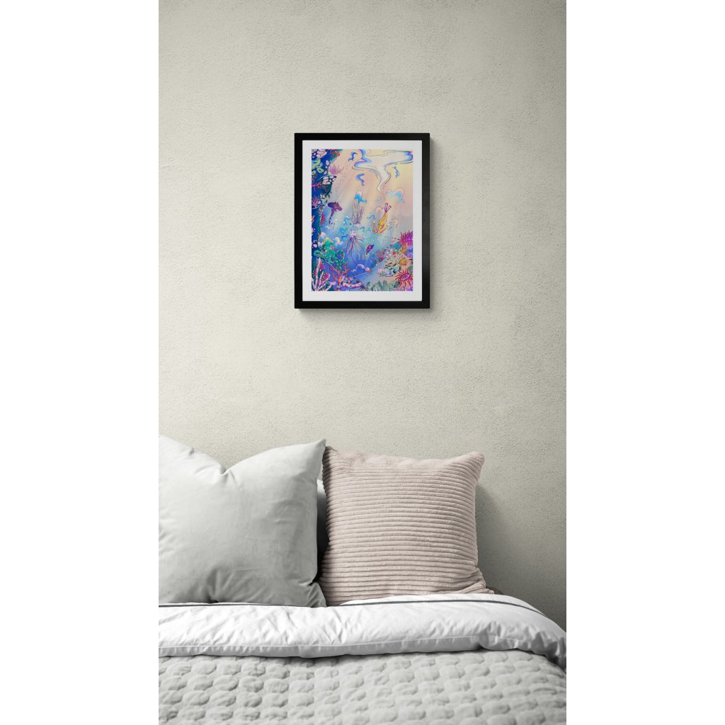 Nechte se vtáhnout do barevného podmořského světa plného korálů, ryb a tajemných mořských tvorů. Postava potápěče dodává scéně příběh a pocit lidské zvědavosti. Pastelové tóny modré, růžové a fialové vytvářejí harmonickou atmosféru, která působí uklidňujícím dojmem a přitom si zachovává hravou energii. Ideální volba do dětského pokoje, ložnice nebo relaxační zóny.