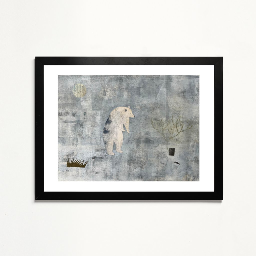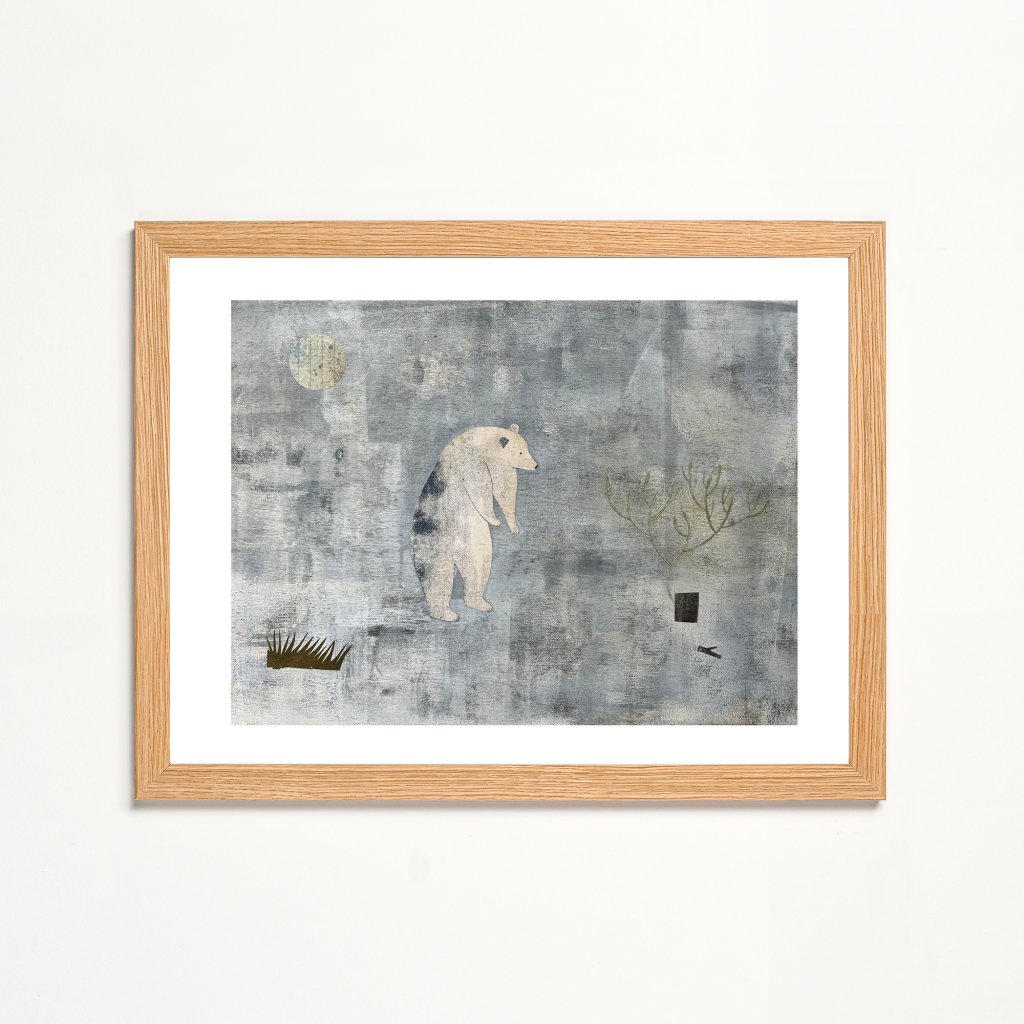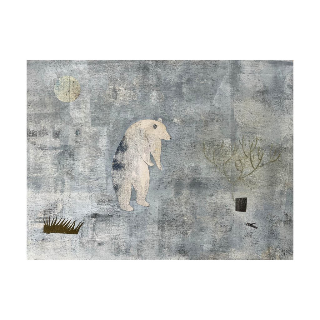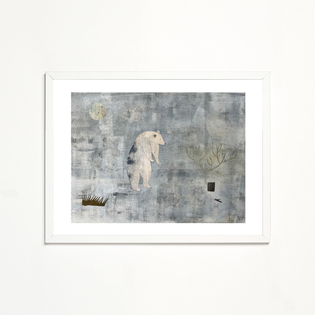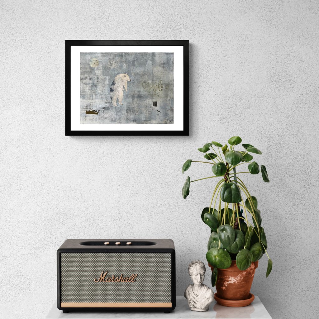 Postava medvěda je zde zbavena dramatu i agrese a funguje spíše jako tichý symbol. Strukturované pozadí a omezená paleta barev dávají vyniknout jednoduchému tvaru a náladě obrazu. Dílo má uklidňující charakter a přirozeně zapadne do interiérů, které pracují s tlumenými tóny, dřevem nebo přírodními materiály.