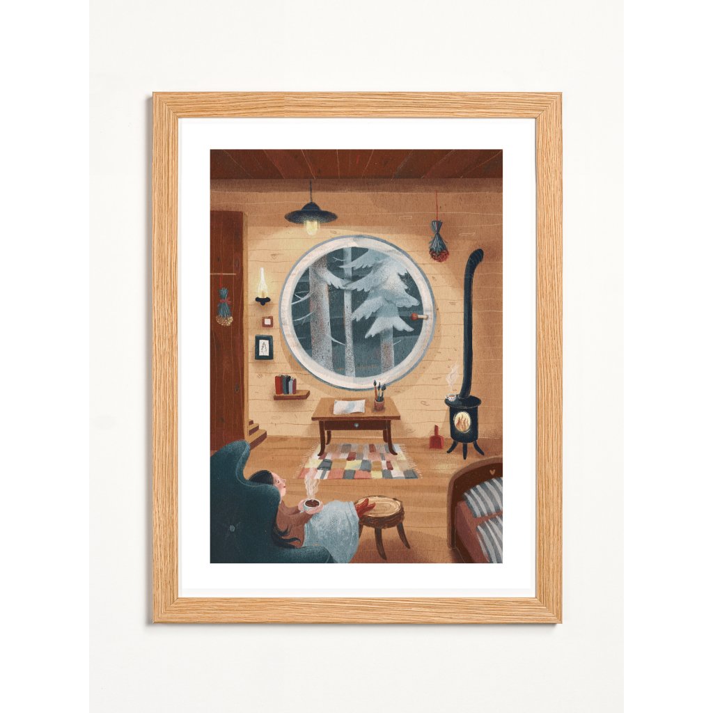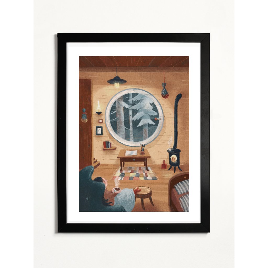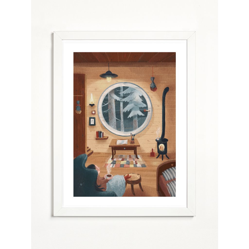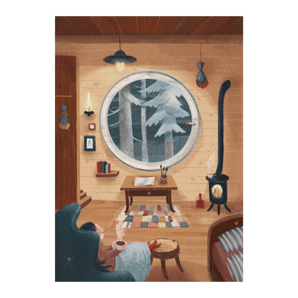 Anežka Doležalová v tomto díle mistrně pracuje s atmosférou „hygge“. Kompozici dominuje kruhové okno s výhledem do zasněženého lesa, které tvoří přirozený středobod obrazu. Interiér v hřejivých dřevitých tónech je zaplněn detaily, které vyprávějí příběh: praskající oheň v kamnech, sušené bylinky, rozložené štětce na stole a police s knihami. Postava ženy odpočívající v měkkém křesle s nohama nahoře a kouřícím nápojem podtrhuje pocit absolutního klidu a přítomného okamžiku. Celé dílo působí jako konejšivé objetí, které do interiéru vnese harmonii a pocit, že tady je svět v pořádku.