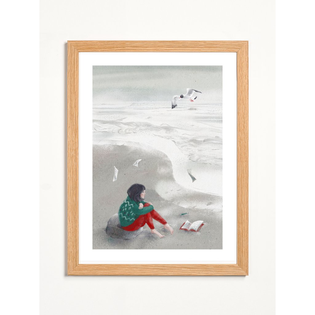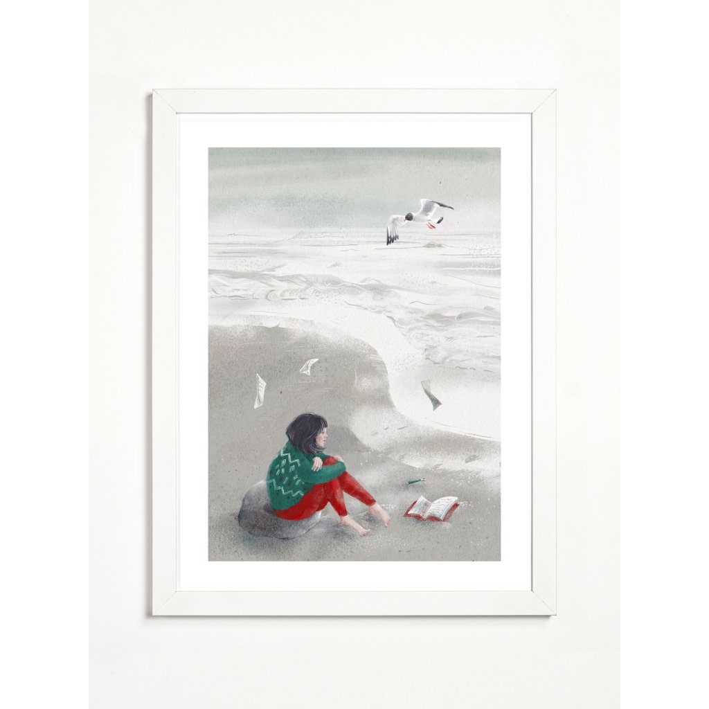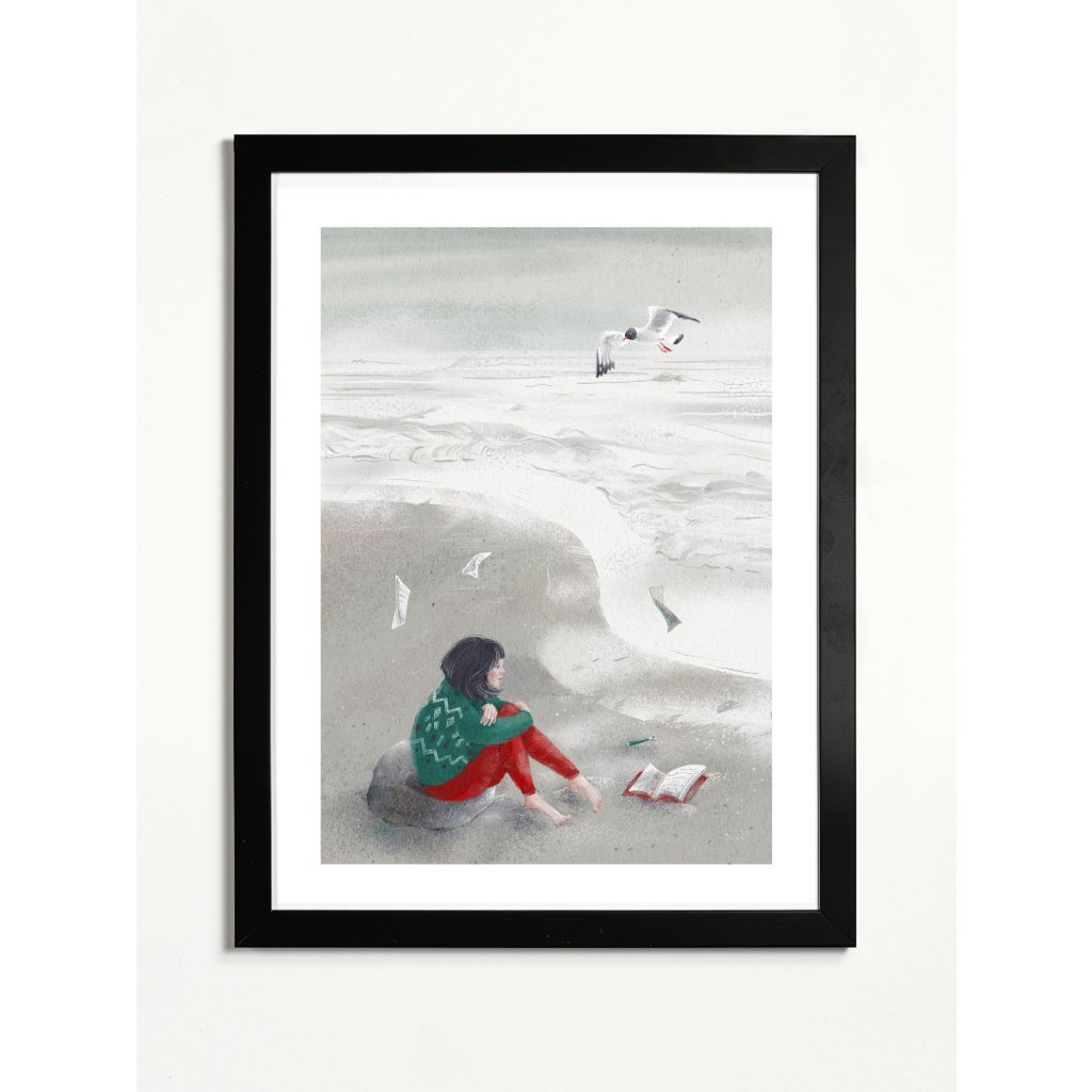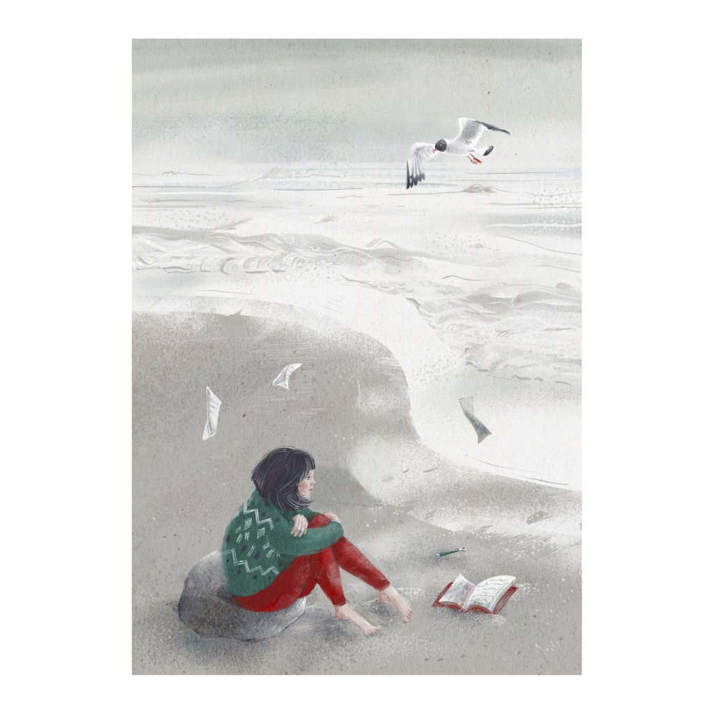 Anežka Doležalová nás v tomto díle přenáší na šedivou písčitou pláž, kde postava dívky v pleteném svetru pozoruje nekonečný horizont. Rozečtený deník a odložené pero v písku naznačují chvíli hlubokého zamyšlení, kdy slova přestávají stačit a mění se v papírové vlaštovky unášené mořským příbojem. Dominantním prvkem je racek vznášející se nad rozbouřenou hladinou, který symbolizuje nespoutanost a volnost lidské mysli. Jemná textura papíru a tlumené tóny šedé, zelené a cihlové vytvářejí atmosféru, která je sice chladná jako mořský břeh, ale zároveň hřejivá svou upřímností a intimitou.