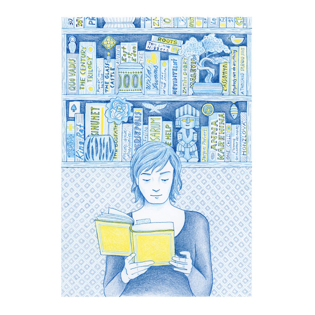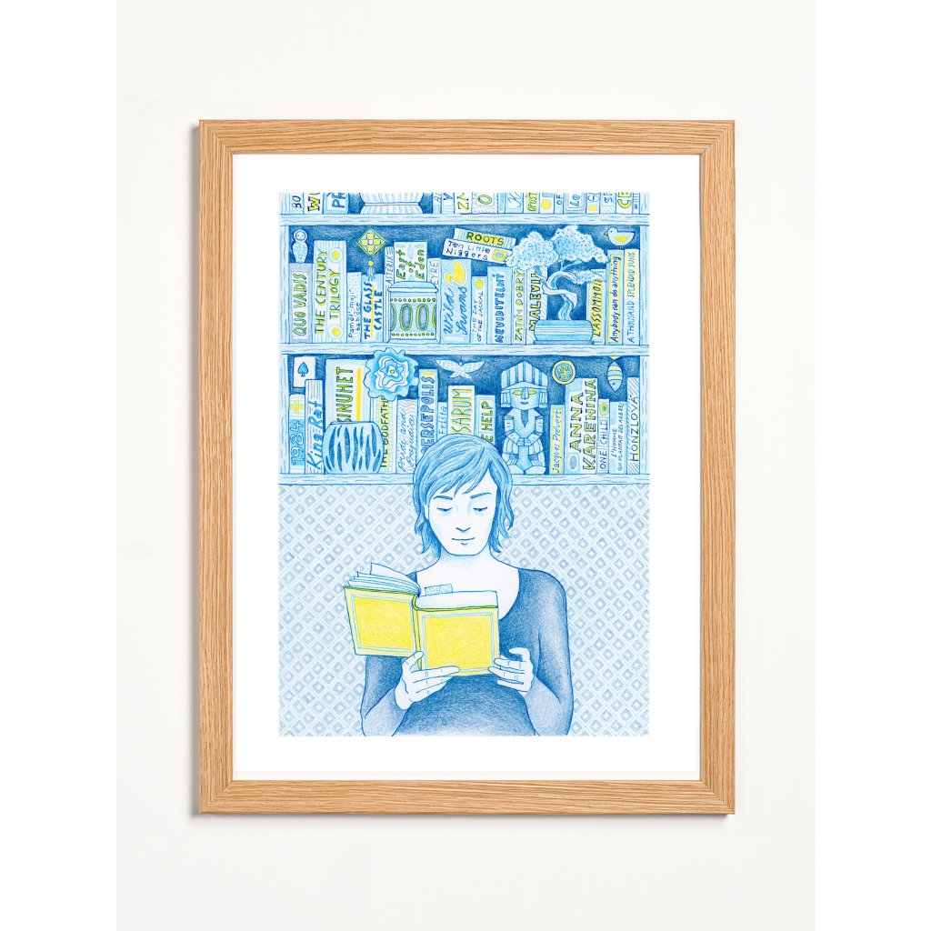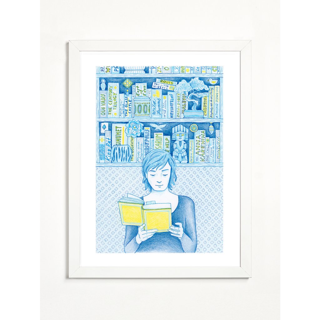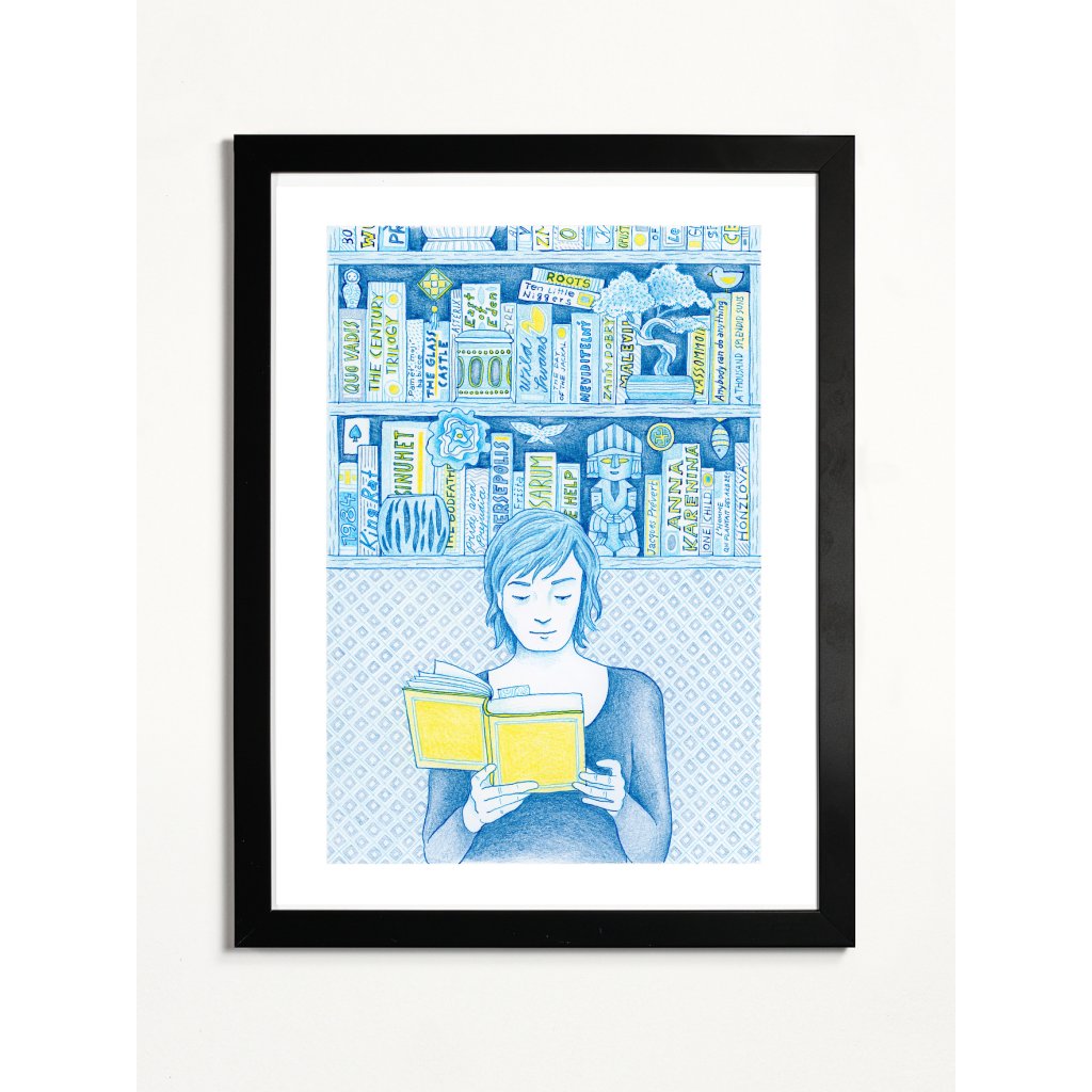 Celá ilustrace působí jako uklidňující modravý sen, který prozařují žluté akcenty jako paprsky slunce dopadající na rozečtenou kapitolu. Jemná kresba a detailní ornamenty na pozadí dodávají obrazu texturu, na kterou se vydržíte dívat stejně dlouho jako na hřbety knih ve své vlastní poličce. Je to pocta všem knihomolům, tichým chvílím a radosti z objevování příběhů.
