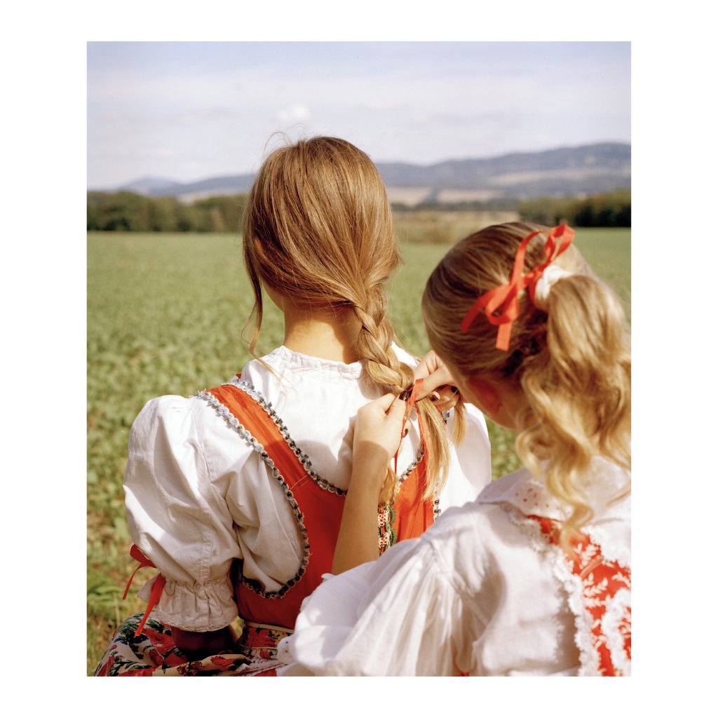Fotografie sleduje dvě dívky v tradičních krojích, jak stojí na poli a soustředěně si zaplétají cop, jako by šlo o jakýsi rozhovor beze slov. Měkké světlo a rozostřené kopce v pozadí dodávají scéně nostalgickou atmosféru. Kontrast bílých rukávců a oranžovo-červených živůtků odkazuje k lidové kultuře, která je stále živá, i když se na ni často jen vzpomíná. Fotografie osloví každého, kdo hledá vizuální připomínku sesterství, péče a pomalého času.
