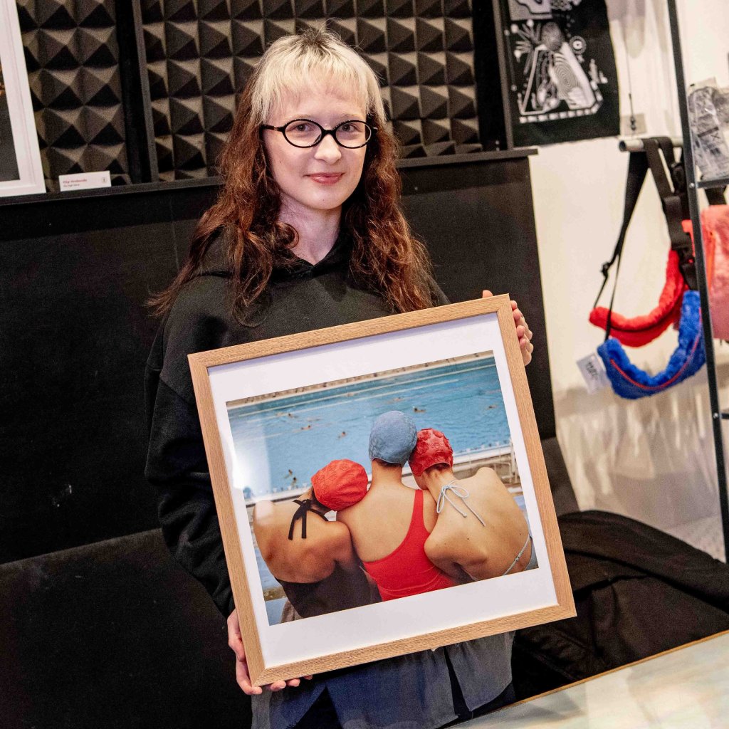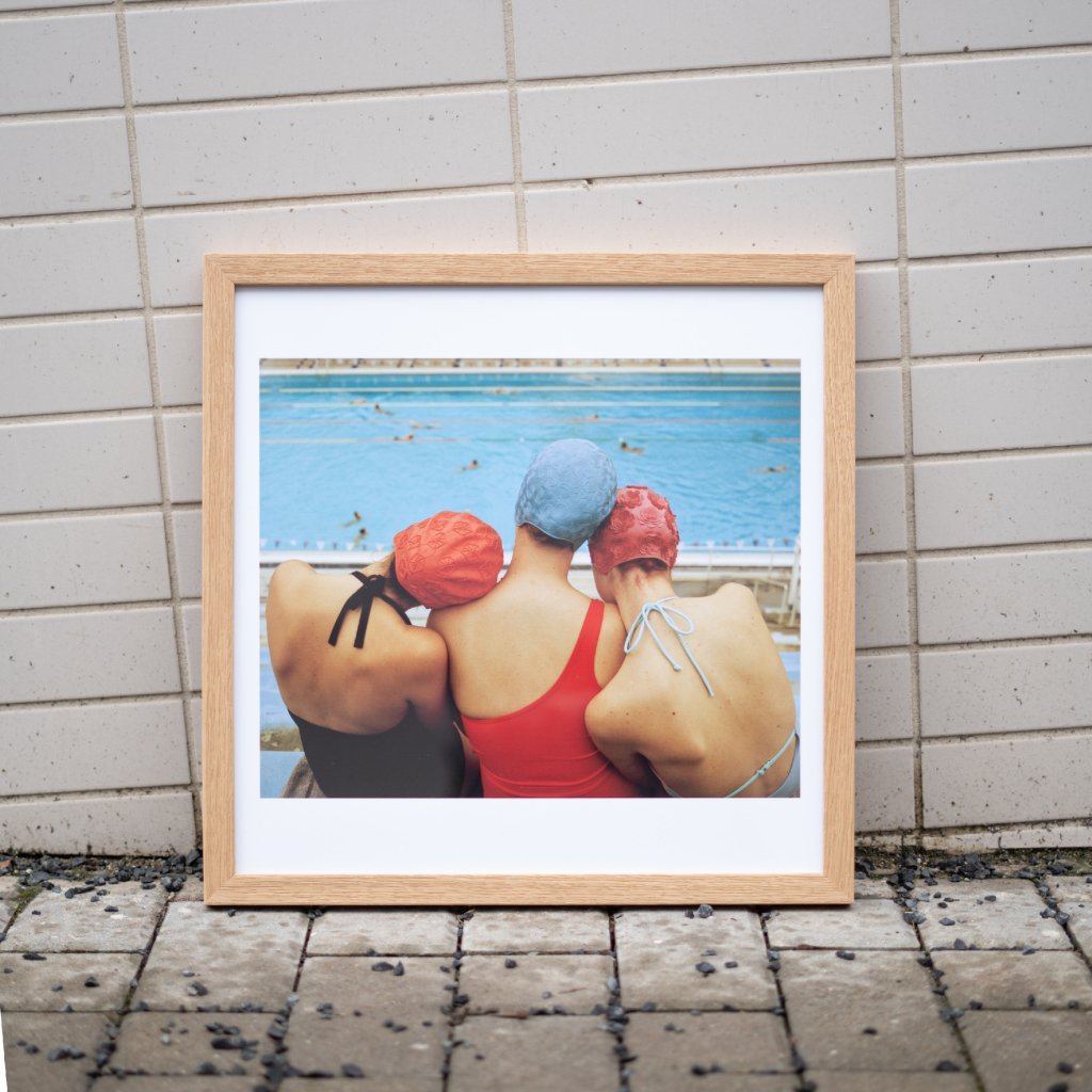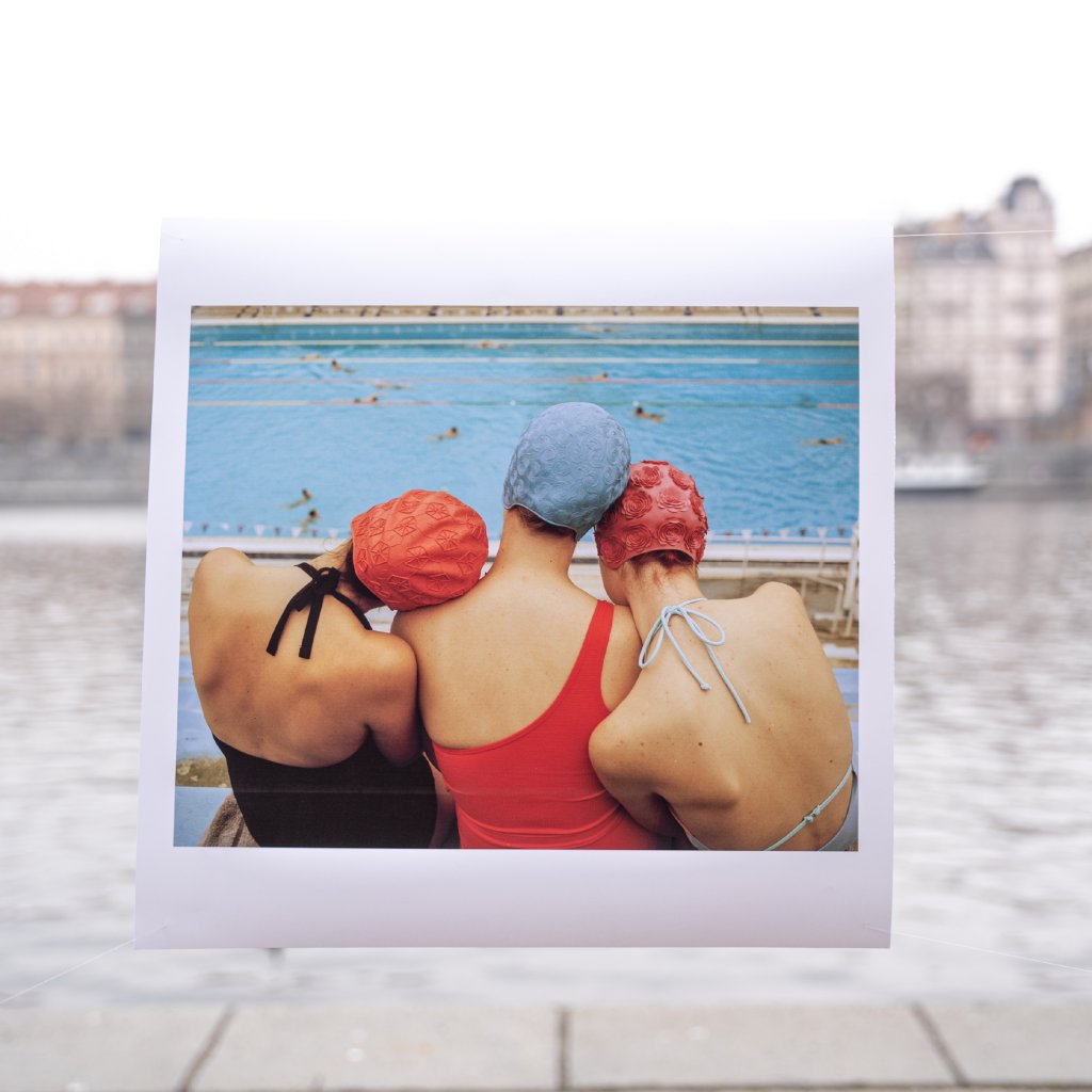 Tři plavkyně zády k objektivu, spojené opřenými rameny a barevnými plaveckými čepicemi, které vytvářejí jemný rytmus tvarů nad modrou hladinou bazénu. Kompozice působí klidně, jako by zachycovala chvíli mezi dvěma závody, kdy si tělo i hlava konečně oddechnou. Detailní textura gumových čepic a odlesky na vodní hladině dodávají snímku haptickou kvalitu, na kterou si můžete takřka sáhnout.