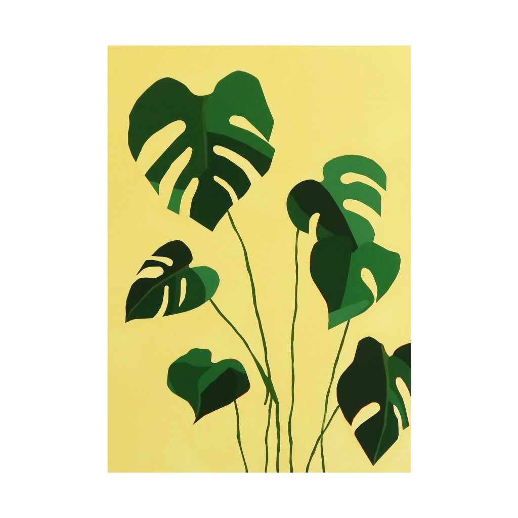 Ilustrace pracuje s ikonickým motivem listů monstery, zpracovaných ve zjednodušených, geometricky čistých tvarech. Barevná paleta stojí na různých odstínech zelené, které se výrazně, ale harmonicky vymezují vůči jemně zářivému žlutému pozadí. Díky tomu působí dílo svěže, optimisticky a velmi klidně. Minimalistická kompozice a absence zbytečných detailů dávají vyniknout tvaru a rytmu listů, což z ilustrace dělá nadčasový kousek, který se snadno kombinuje s moderním i přírodně laděným interiérem.