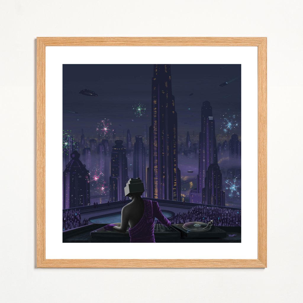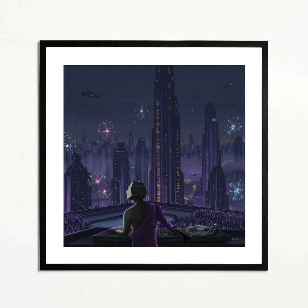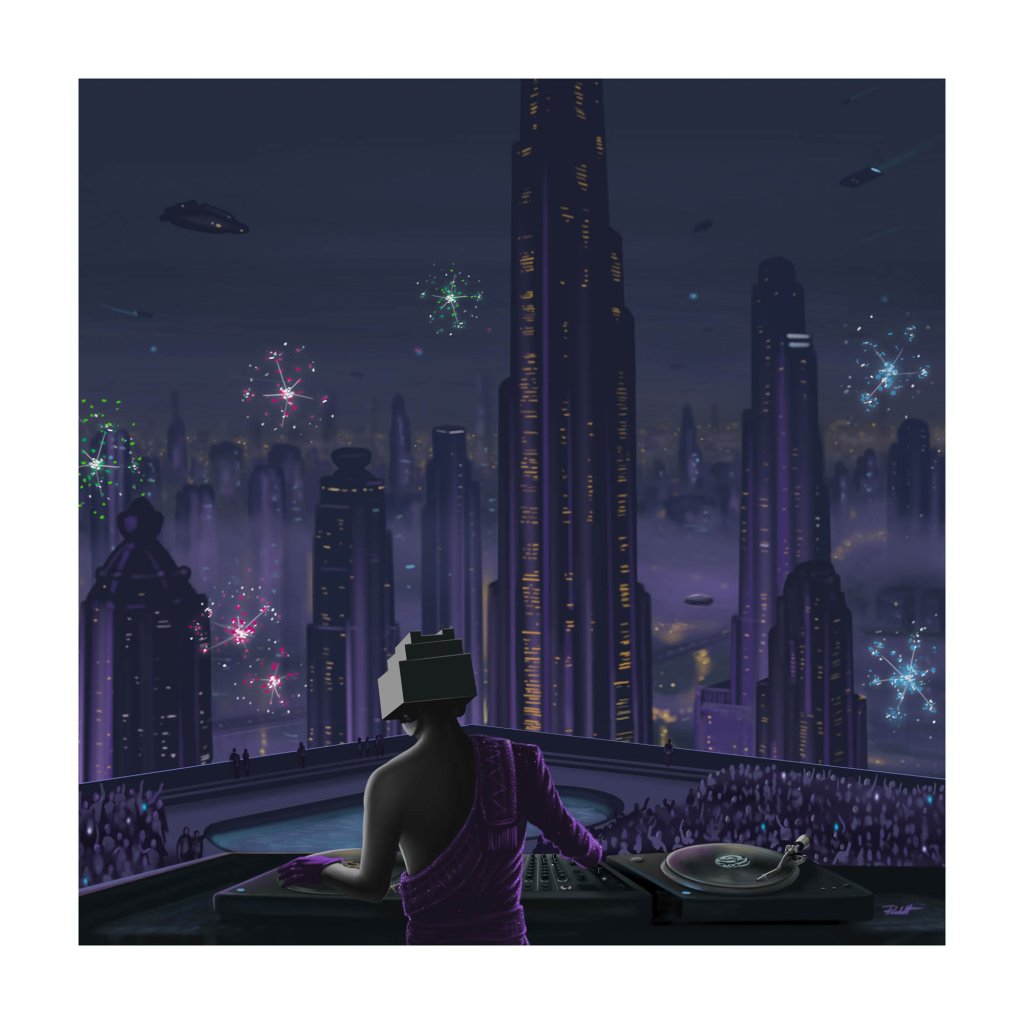 DJ v dlouhé róbě a kostkové helmě (autorově oblíbeném prvku) stojí za mixážním pultem před davem nadšených lidí a shlíží na nekonečnou futuristickou megalopoli. Nebe ozařují drobné ohňostroje, světla obřích mrakodrapů, a křižují létající dopravní prostředky. Futuristická scéna z noční rooftop party, která je o euforii z hudby a zároveň nese své hlubší poselství o možné budoucnosti.