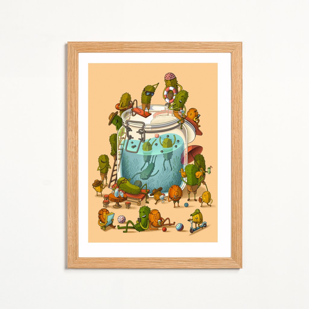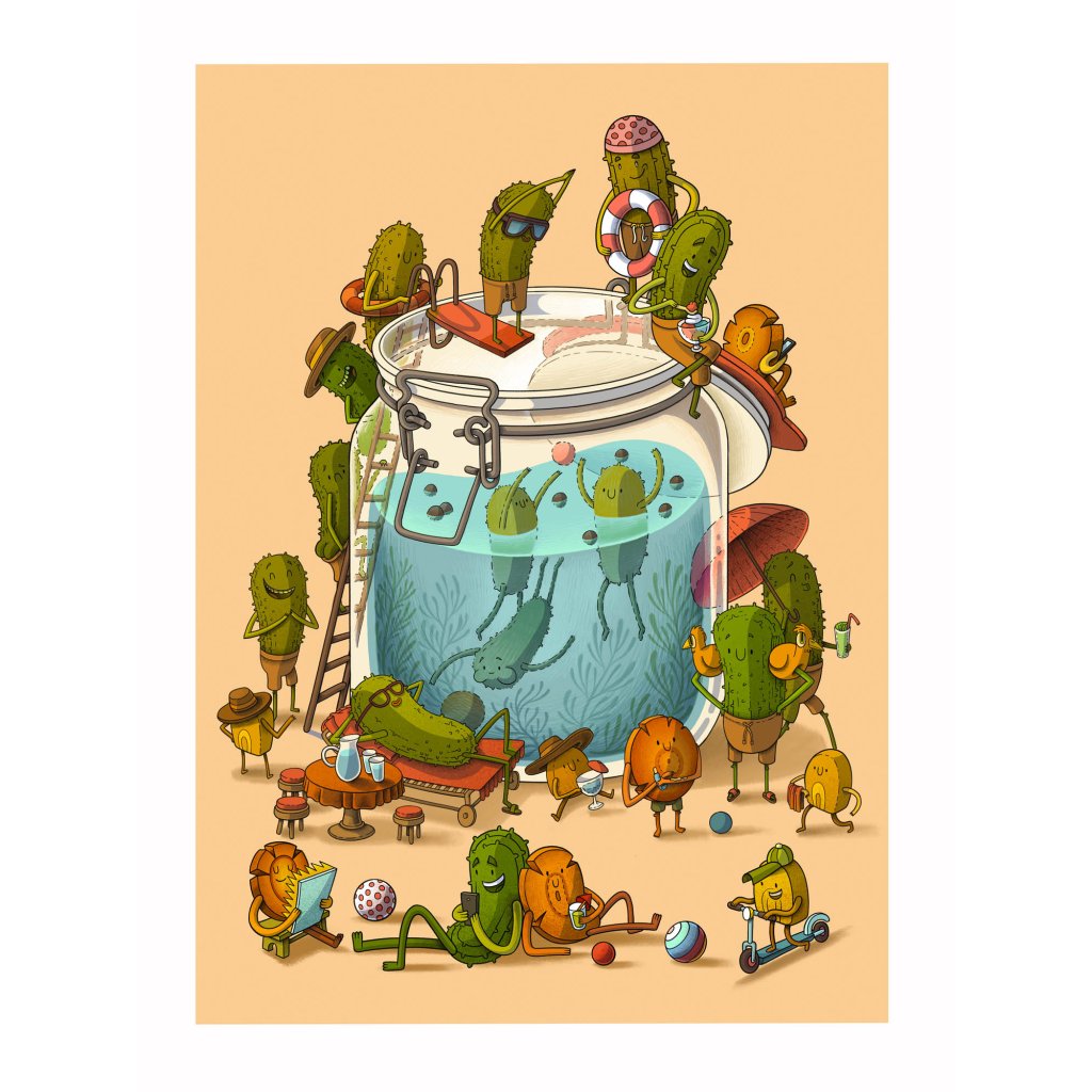 Zavařovací sklenice s nálevem se mění v bazén plný okurčiček, které odpočívají, baví se, žijí vlastním mikrosvětem a určitě neplánují skončit jako příloha k nedělnímu řízku. Hravá a ryze pozitivní ilustrace pracuje s humorem, nadsázkou a vyprávěním, kde každý detail nabízí svůj vlastní příběh. Dokonalé na zeď do bistra, restaurace, kuchyně i jakéhokoliv prostoru, který chce zlepšit náladu.