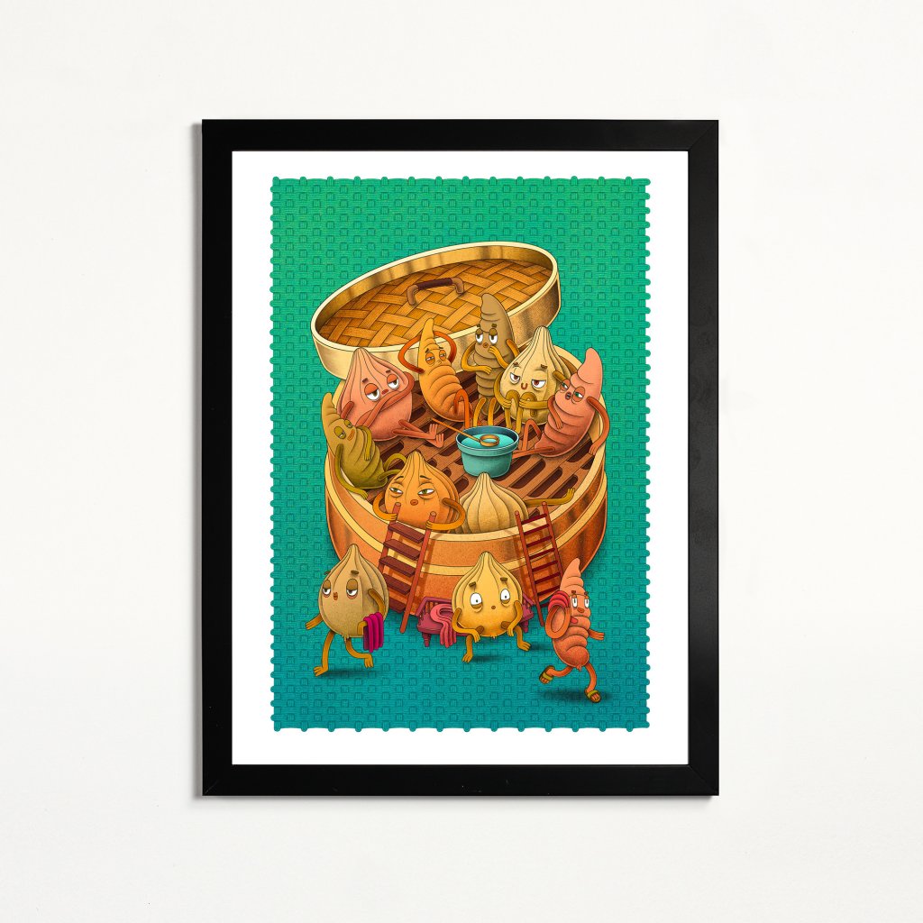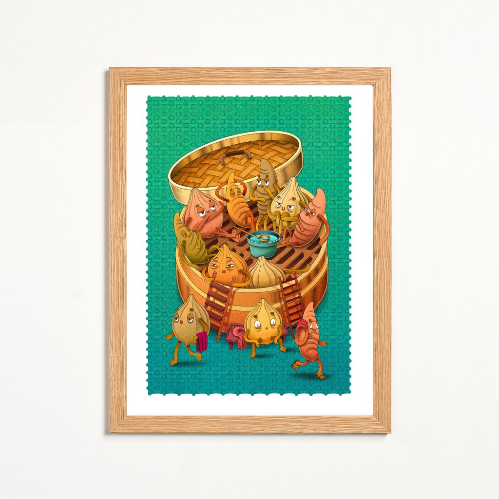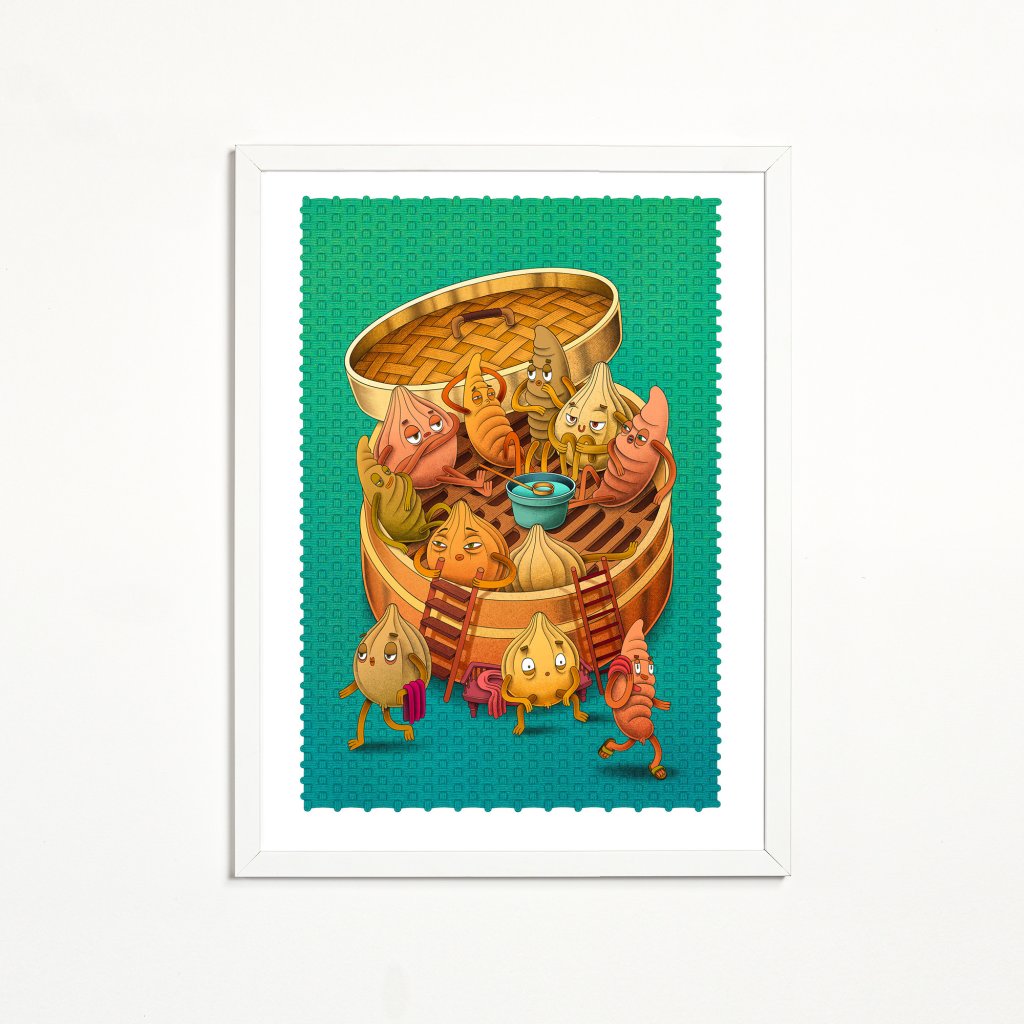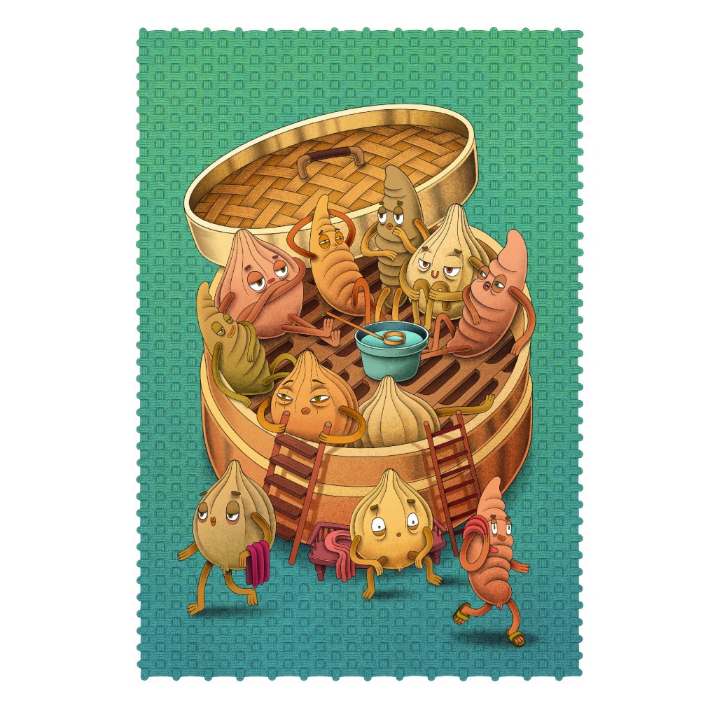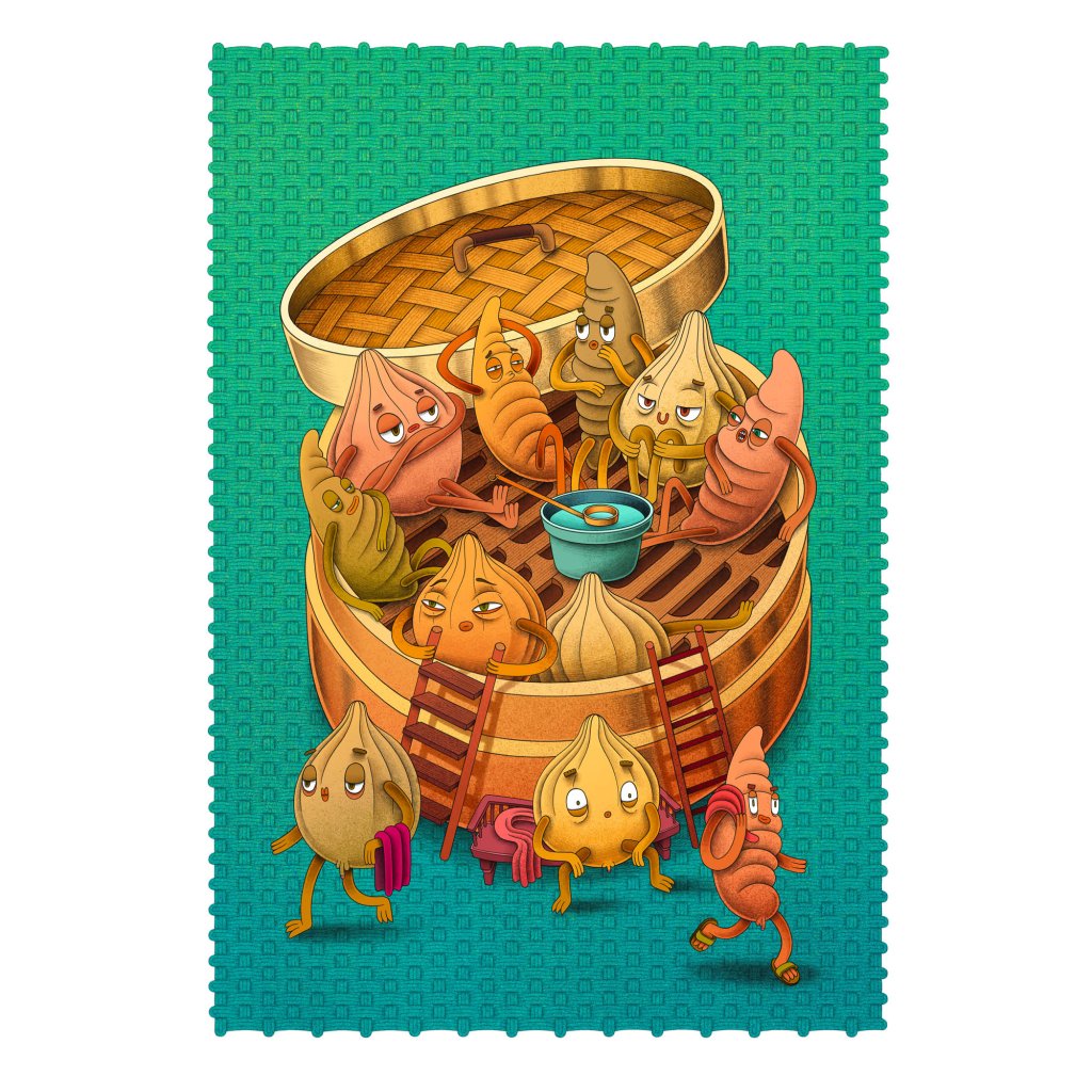 Postavičky zrelaxovaných čínských knedlíčků, kteří si z tradiční servírovací nádoby udělali saunu. Téma je trochu o jídle, trochu o odpočinku a hodně o nadsázce a vtipu, když se věci podávají z nových úhlů. Ilustrace je uklidňující i svou barevnou paletou, která působí vizuálně teple a příjemně. Výborně se hodí do kuchyně, jídelny, restaurace či bistra (nejen s wonton knedlíčky).