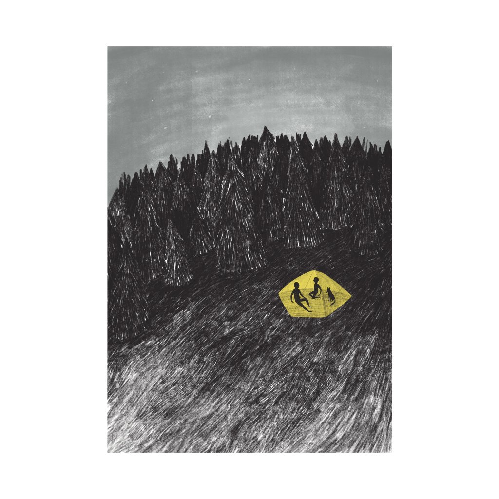 Obraz pracuje s výrazným kontrastem temné, hutné kresby lesa a malého světelného pole stanu, ve kterém se odehrává lidská přítomnost. Minimalistická barevnost a hrubší struktura kresby vytvářejí pocit chladu, ticha a soustředění. Osvětlený stan zde není dekorace, ale symbol sdíleného bezpečí a lidského spojení. Dílo se hodí do klidných interiérů nebo pracoven.