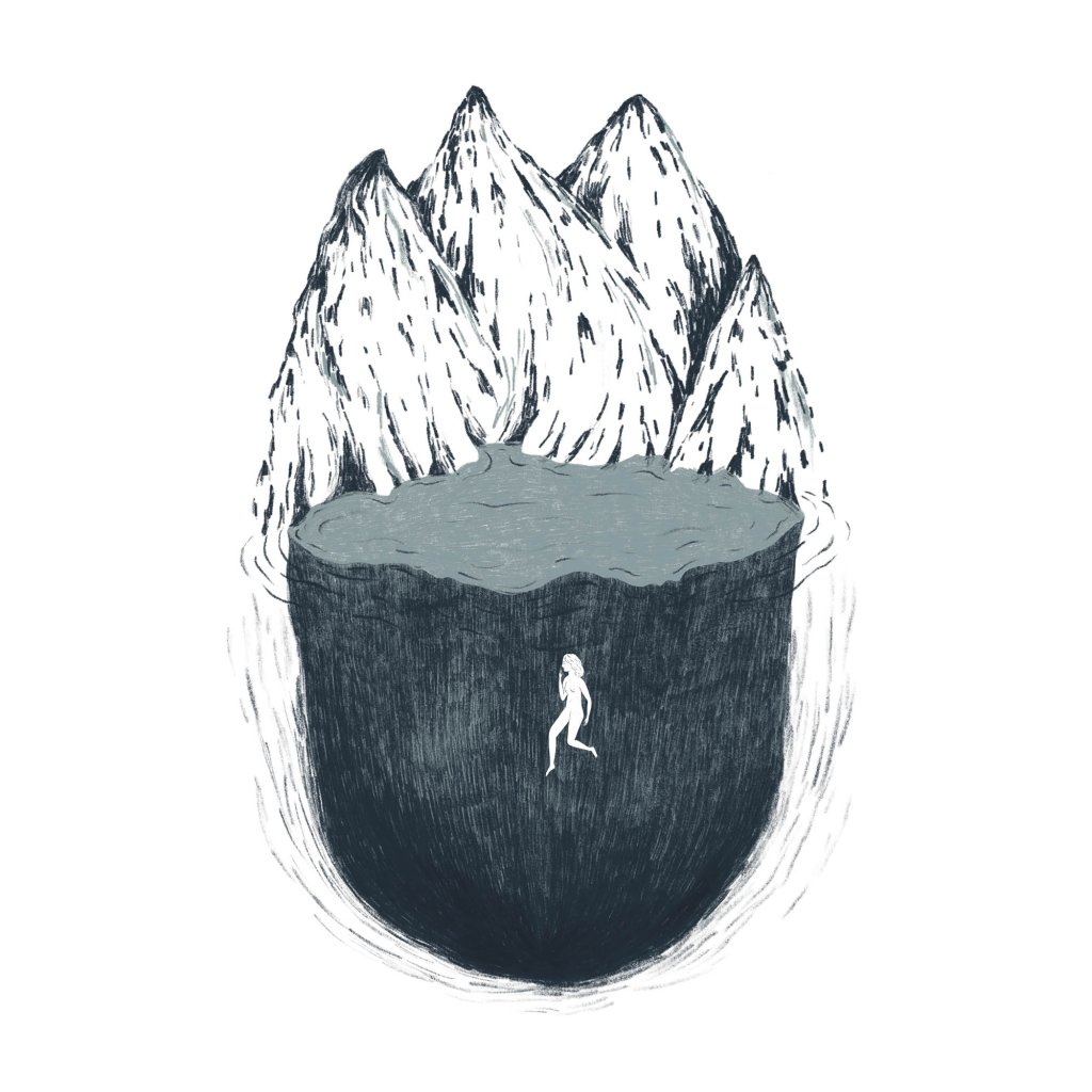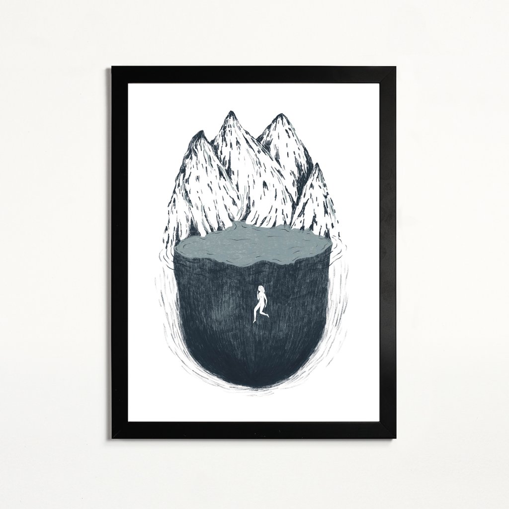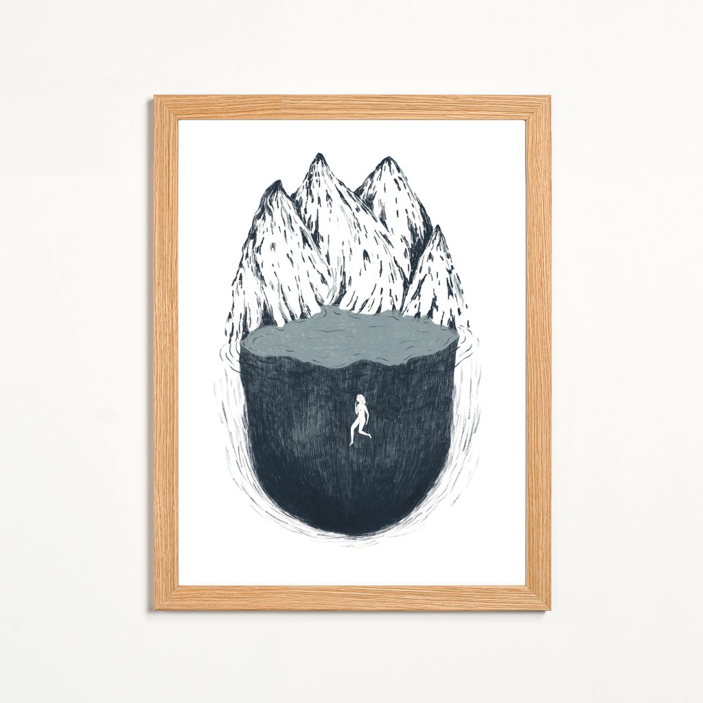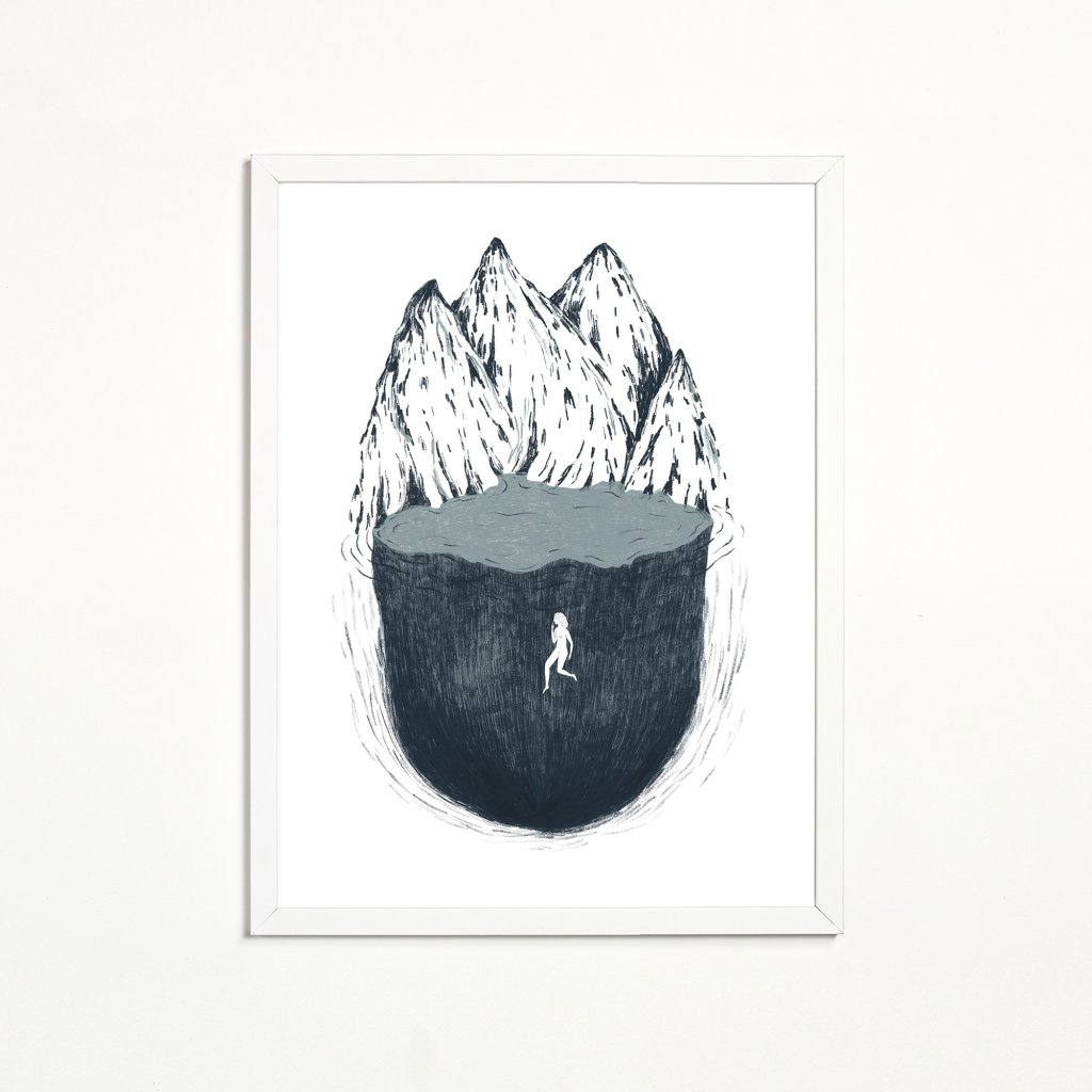 Ilustrace pracuje s kontrastem masivní, téměř tíživé formy a křehké lidské siluety, která se v ní pohybuje. Hora a voda splývají v jeden celek a vytvářejí metaforu vnitřní hloubky, ticha a izolace. Minimalistická barevnost a výrazná kresba podporují meditativní charakter díla. Hodí se do klidných interiérů, ložnic a míst, kde má dílo nechat prostor zpomalit.