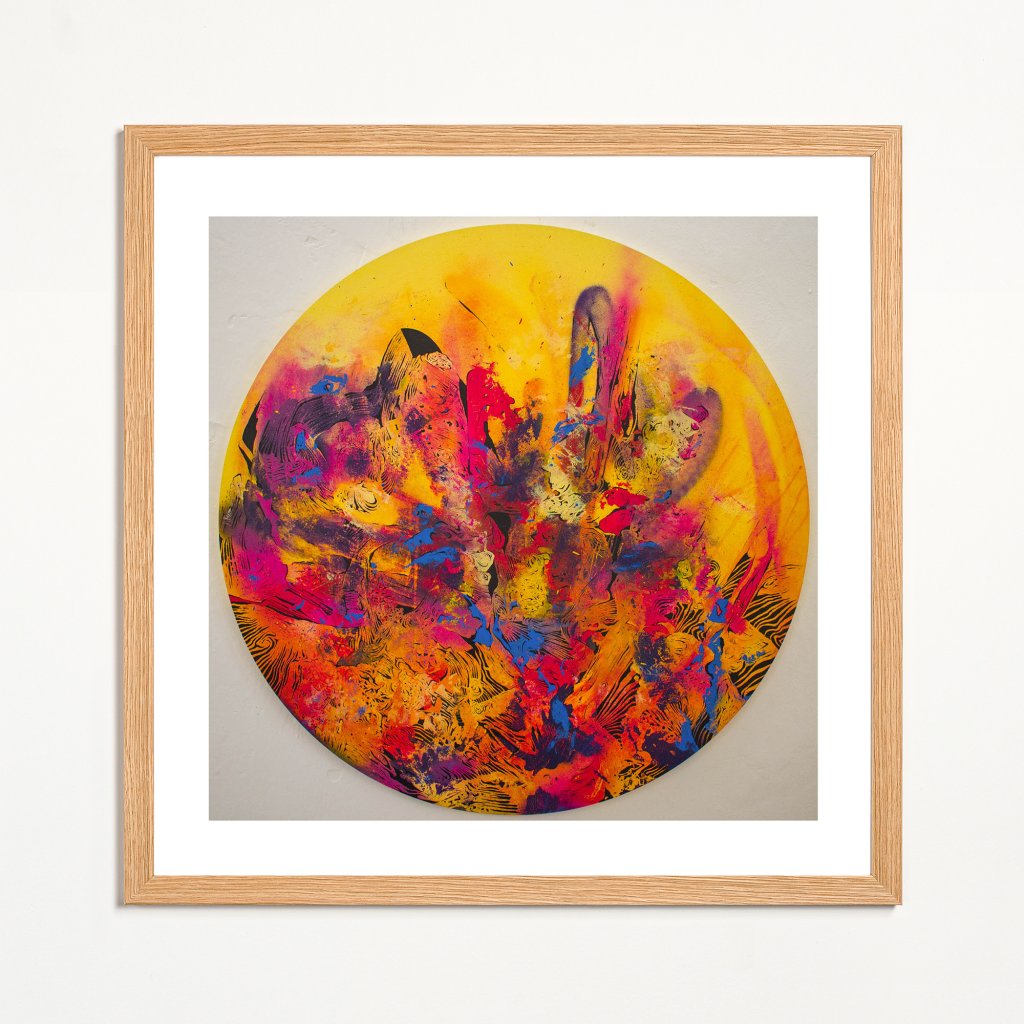 Dílo pracuje s formátem kruhu jako uzavřeného prostoru, uvnitř kterého se odehrává bohatá hra barev, struktur a rytmických stop. Dominantní žlutý podklad vytváří pocit světla a energie, do nějž vstupují vrstvy růžové, modré, červené a černé v expresivních tazích a otiscích. Textury působí fyzicky a vrstevnatě, jako záznam pohybu a proměny v čase. Celek vyvolává dojem zrodu a napětí a v interiéru přitáhne pozornost a ponese vlastní, otevřený význam.
