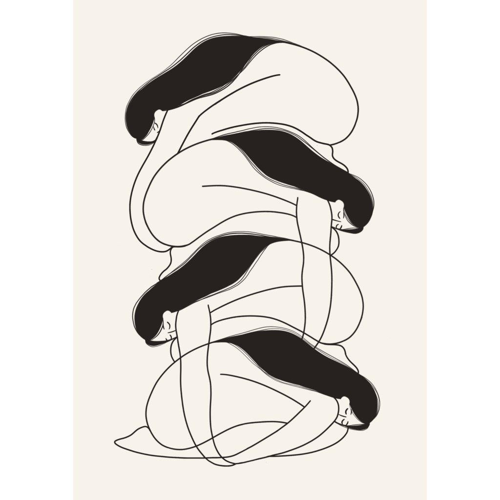 Ilustrace pracuje s jednoduchou linií a opakováním tvaru ženského těla, které se vzájemně prolíná a navazuje. Absence barev a detailů soustřeďuje pozornost na pohyb, rytmus a vztah jednotlivých postav, jež mohou být vnímány jako různé podoby jedné identity nebo jako symbol cykličnosti a vnitřních procesů. Ilustrace působí meditativně a současně velmi nadčasově. Hodí se do moderních, minimalistických interiérů nebo pracovních prostor, kde vynikne její čistota a konceptuální charakter.