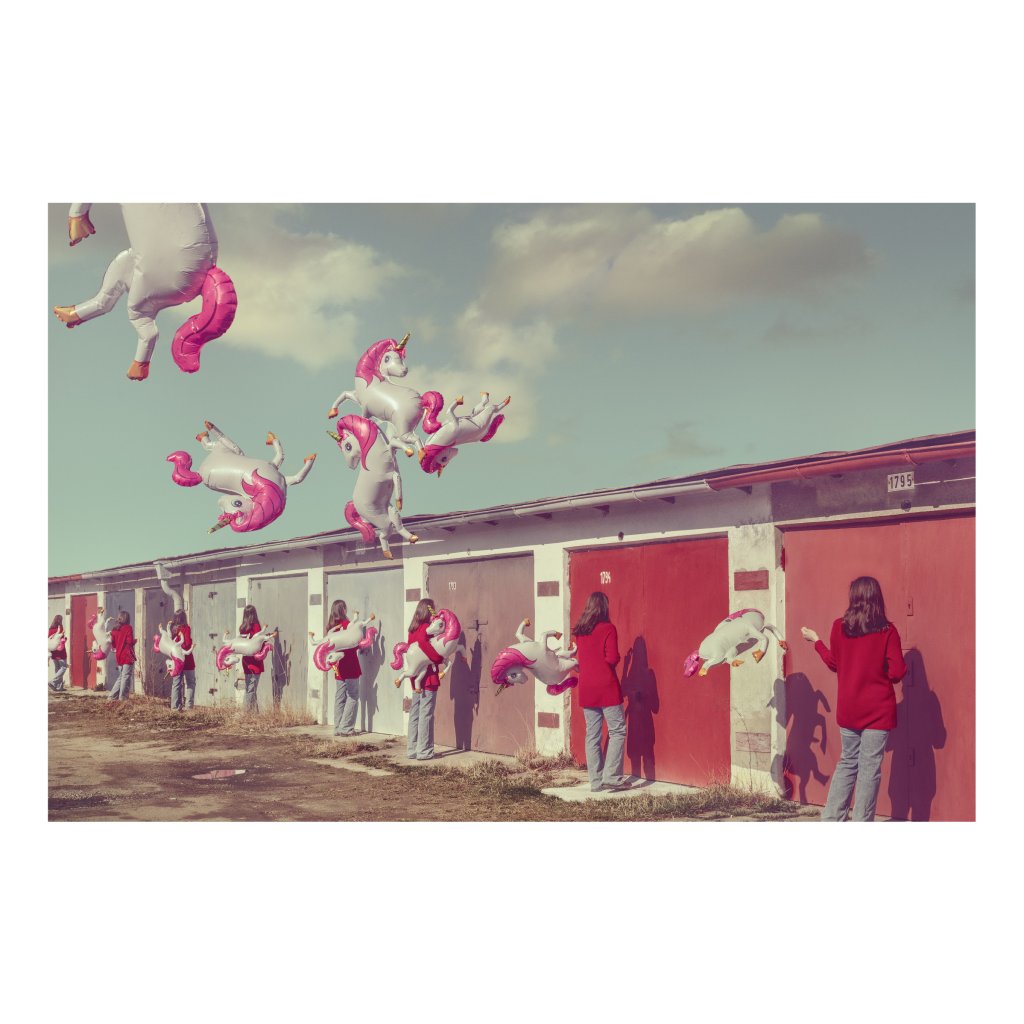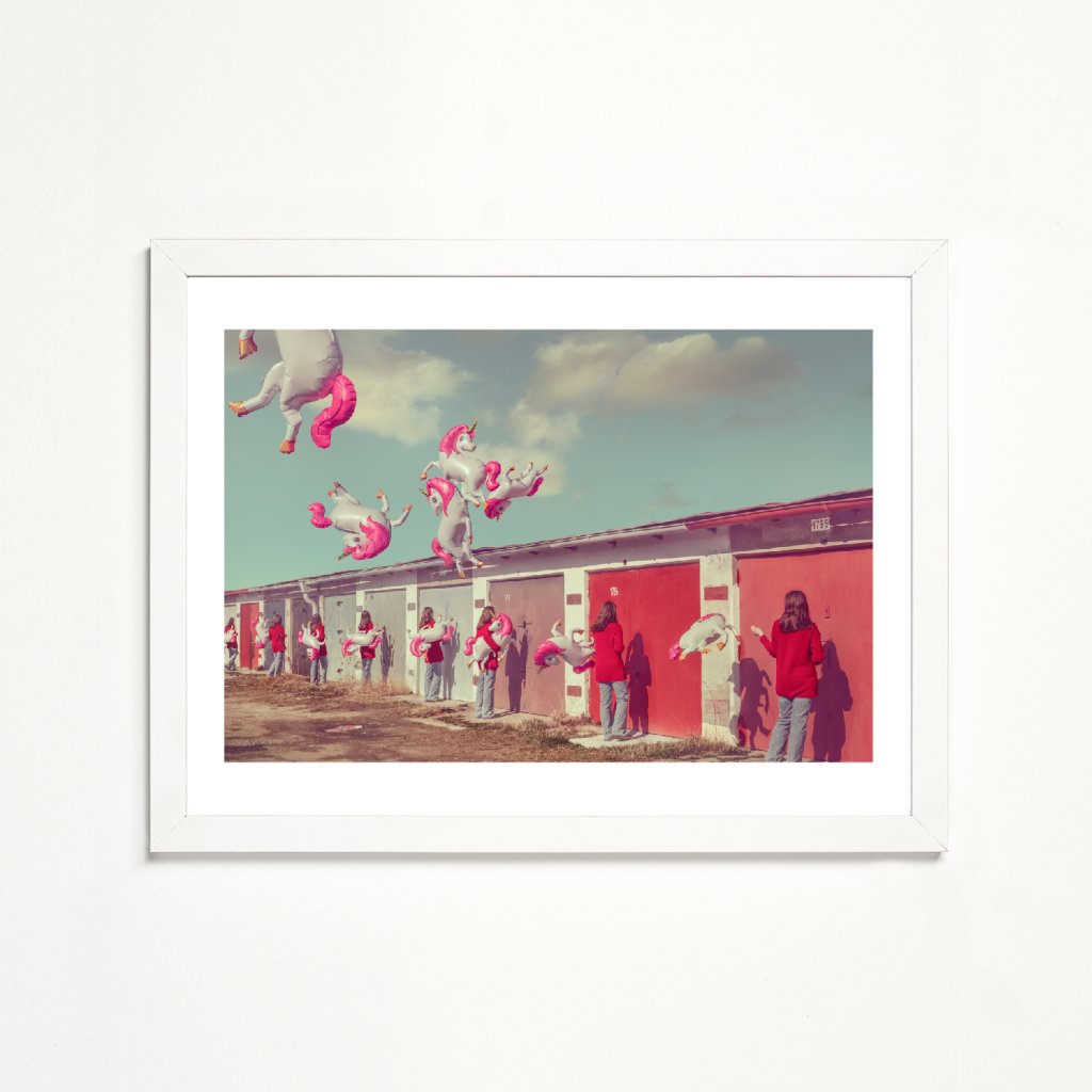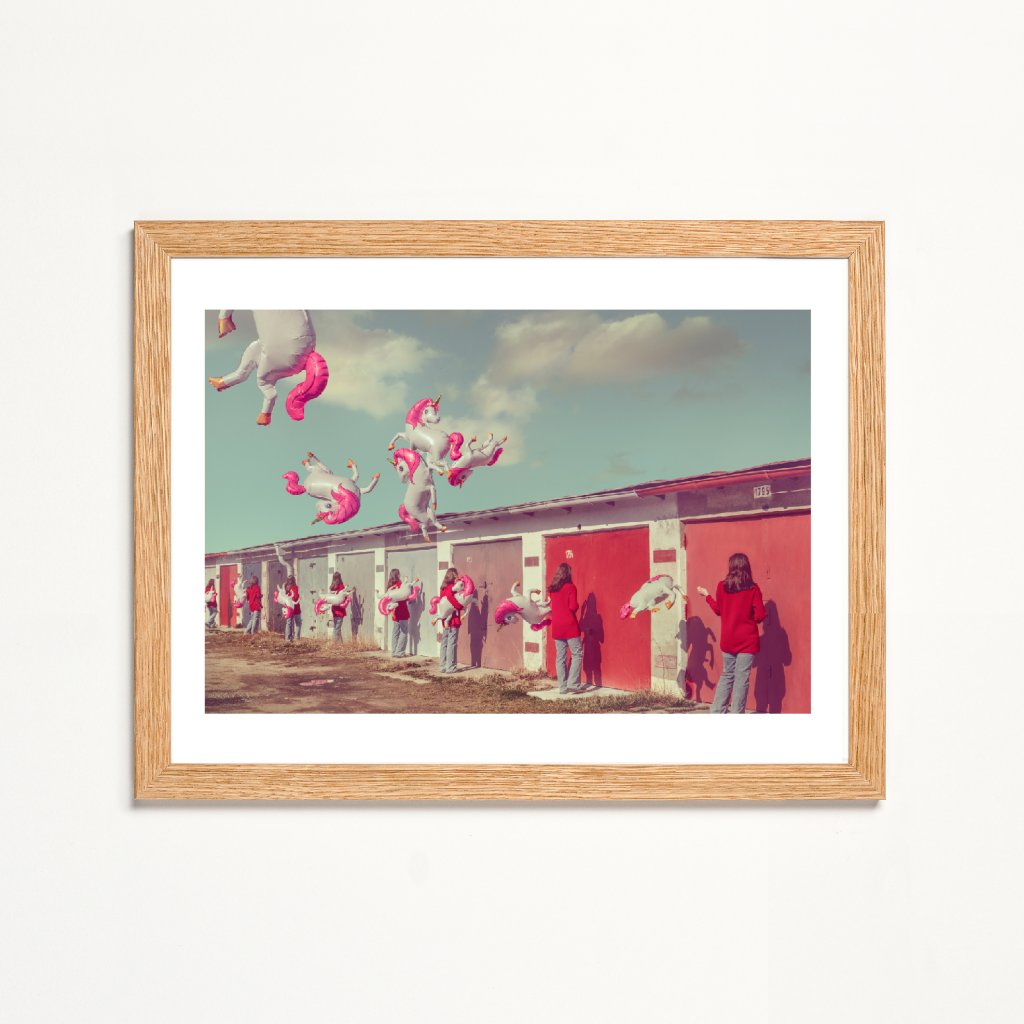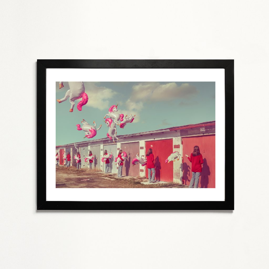 Opakující se motiv postav v červeném kabátu a růžových nafukovacích jednorožců vytváří obraz, který balancuje mezi absurditou a melancholií. Scéna působí jako záznam tiché vzpoury proti šedi každodennosti, kdy je všední prostor je narušen něčím nepatřičným, hravým a křehkým. Jemně vybledlé barvy a statická kompozice dávají celé situaci snový, lehce znepokojivý nádech. Dílo bude silně fungovat v interiéru, který chce narušit rutinu: třeba v moderním obývacím prostoru, ateliéru nebo kanceláři.