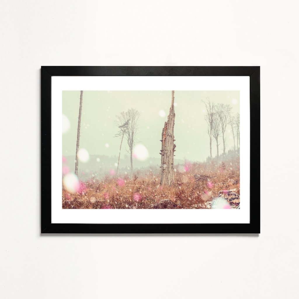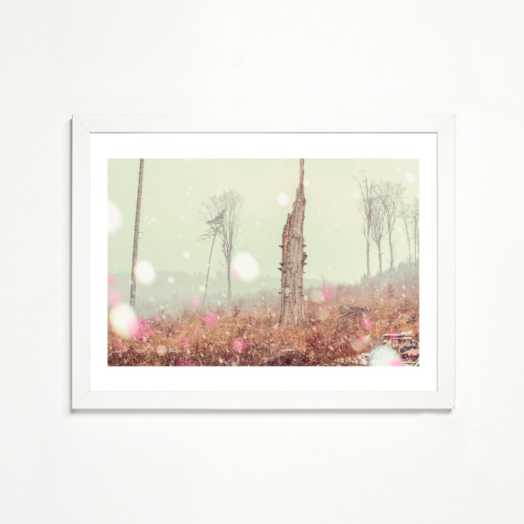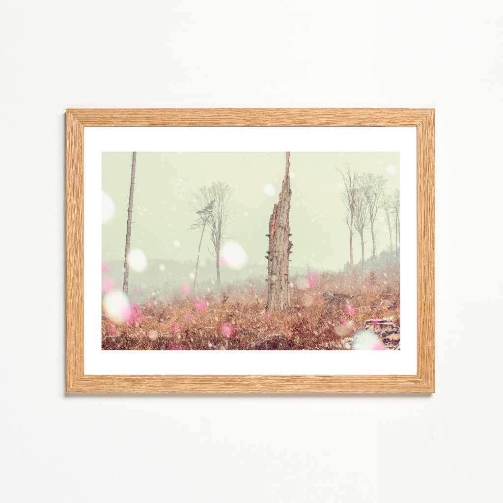 Minimalistická kompozice staví do středu pozornosti torzo stromu obklopené prázdným prostorem a nečekanou sněhovou přeháňkou. Fotografie stylizovaných barev působí jako zastavený okamžik mezi zánikem a trváním. Měkké světlo a pastelové tóny dodávají scéně éterickou atmosféru, která nás nechává zpomalit a vnímat ticho. Ideální do místností určených ke klidu a k soustředění.