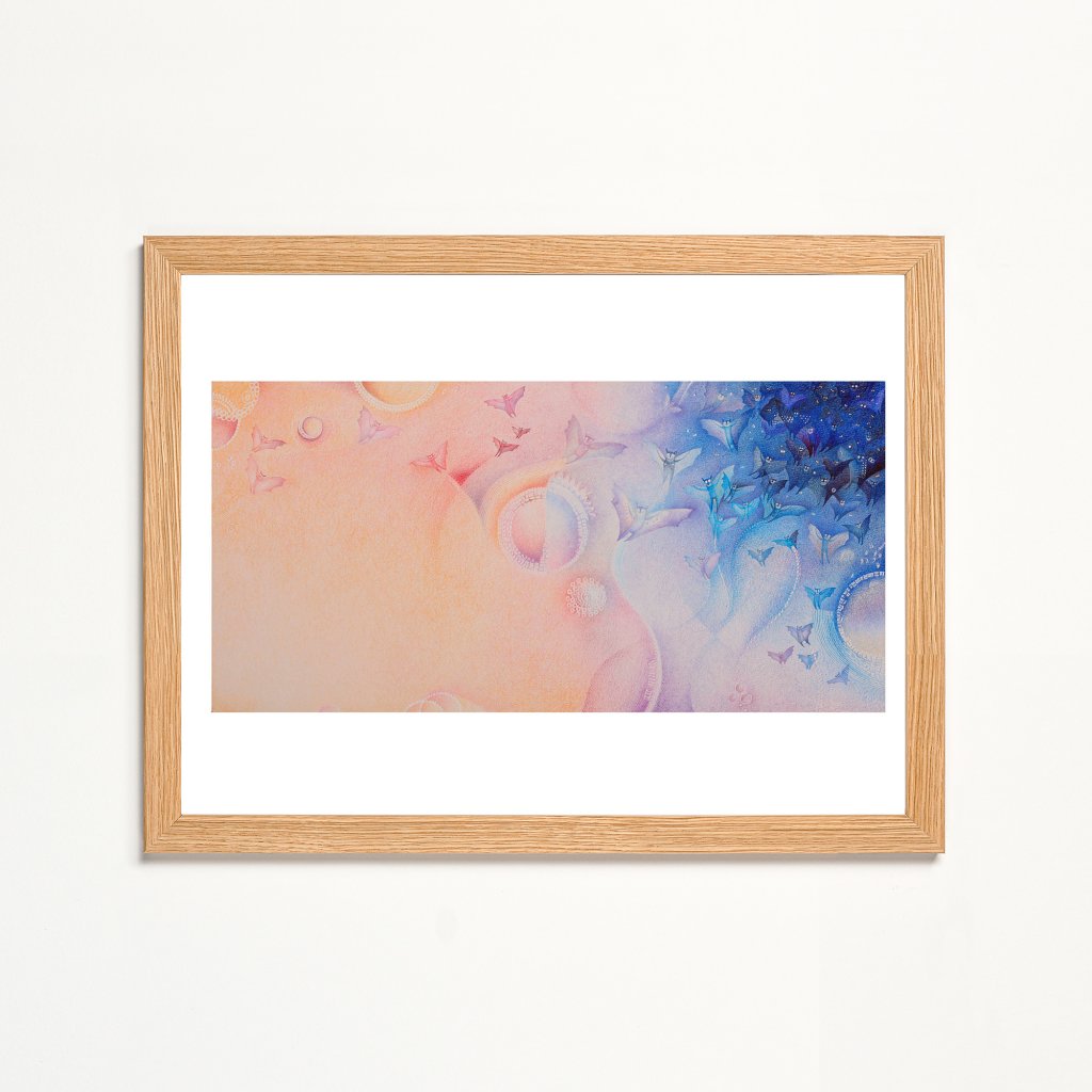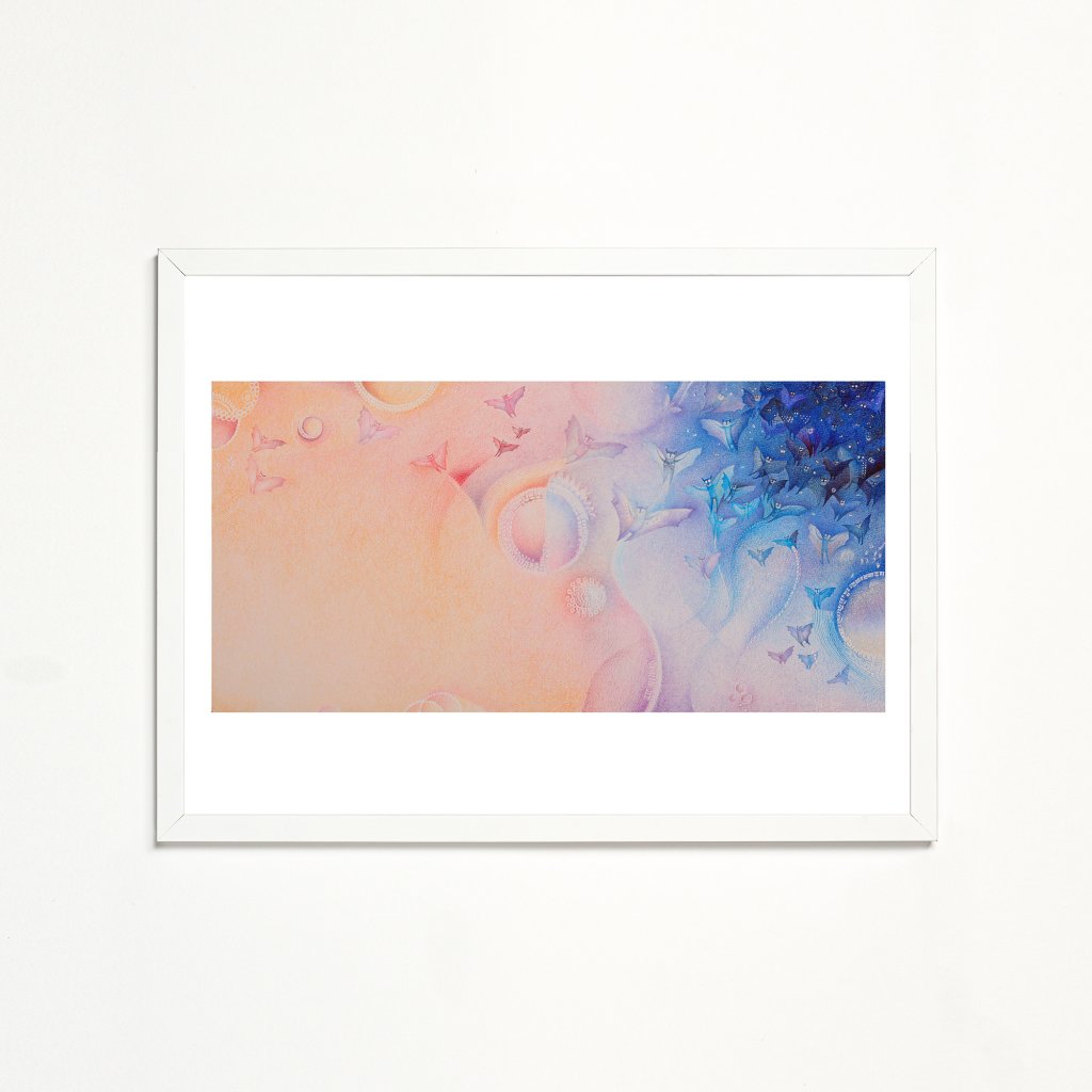 Temně modrá noc je přinucena k ústupu narůžověle oranžovým ránem a novým dnem. Noc následuje i velké hejno kaloňů, a většina jeho členů se teď tísní v malém prostoru, kde ještě vládne tma. Jemné tvary netopýrů a organických prvků vábí k proměně a transformaci v něco nové. Dílo rezonuje s touhou po fantazii a objevování nových příběhů.