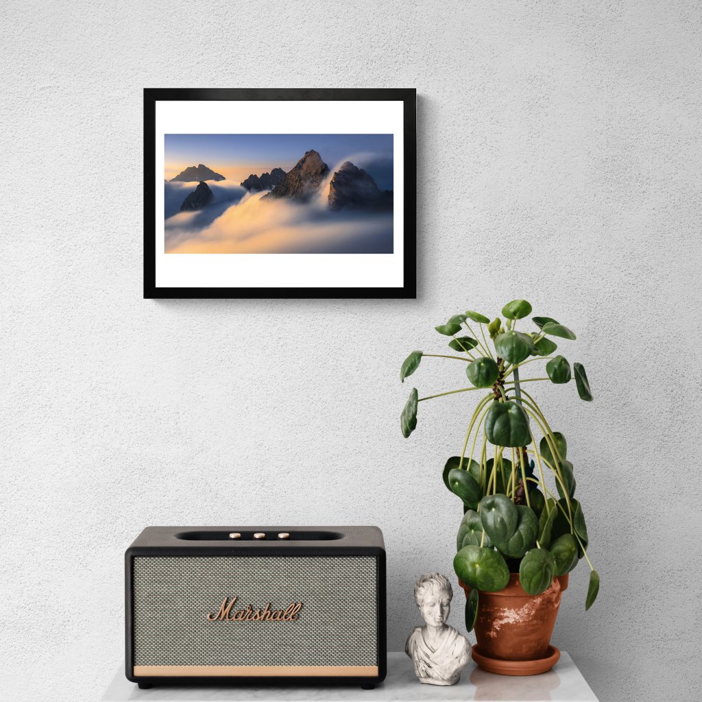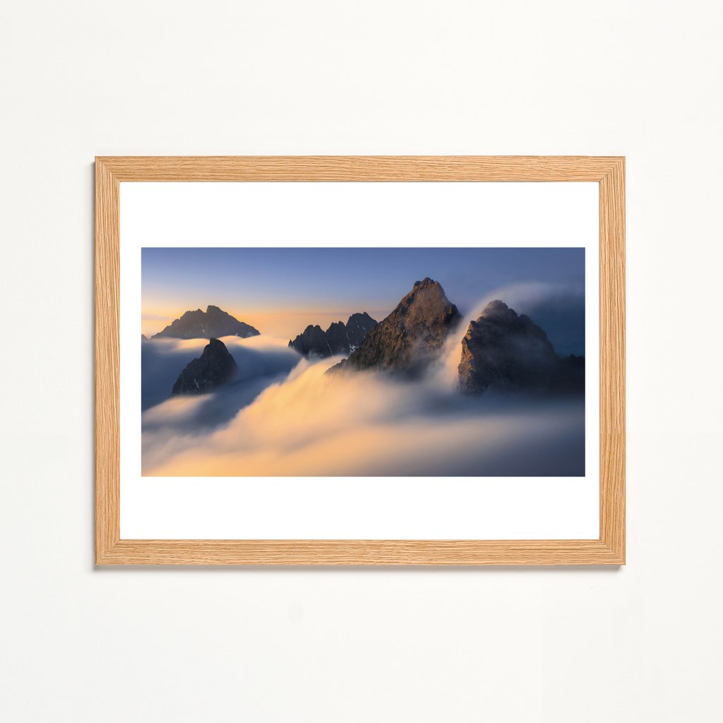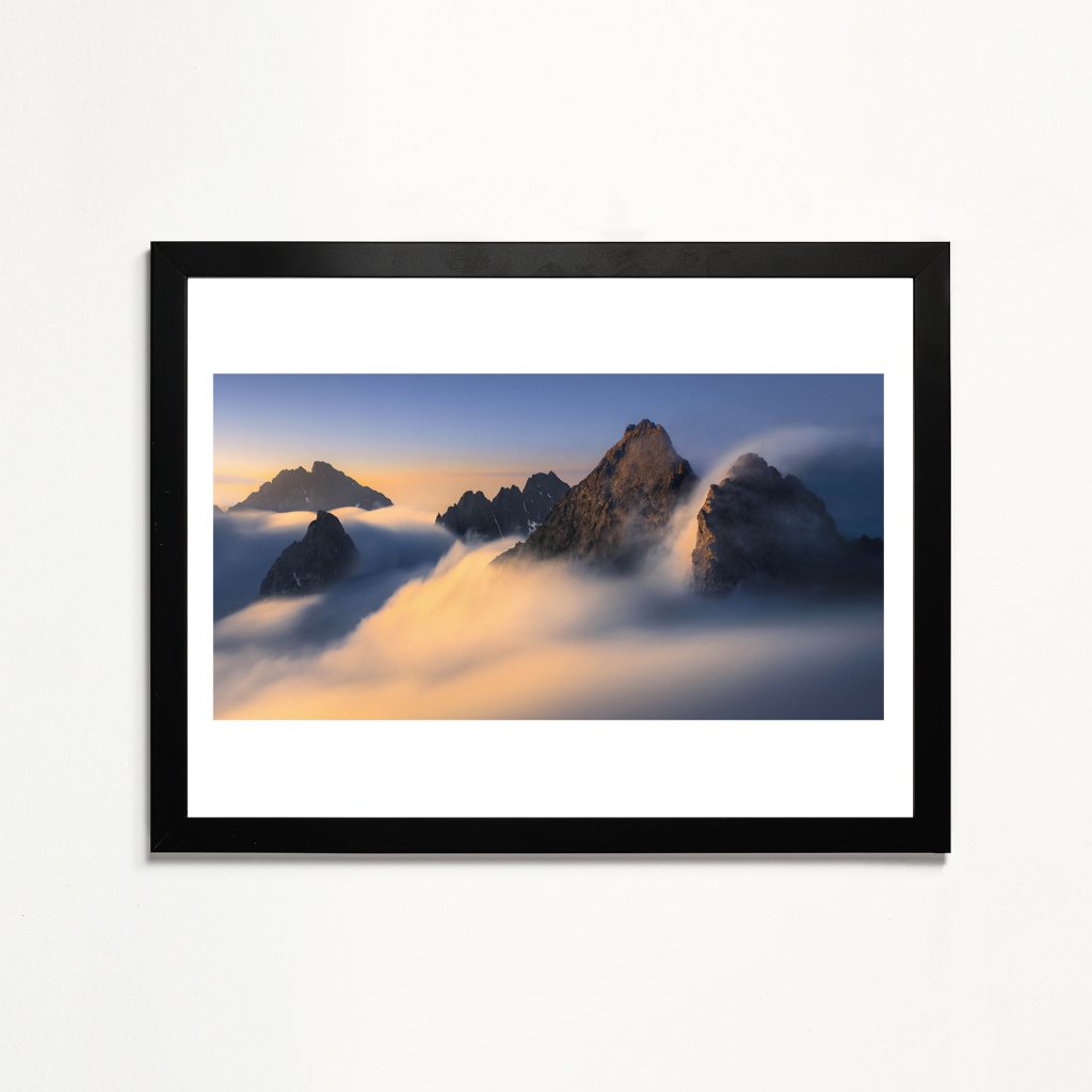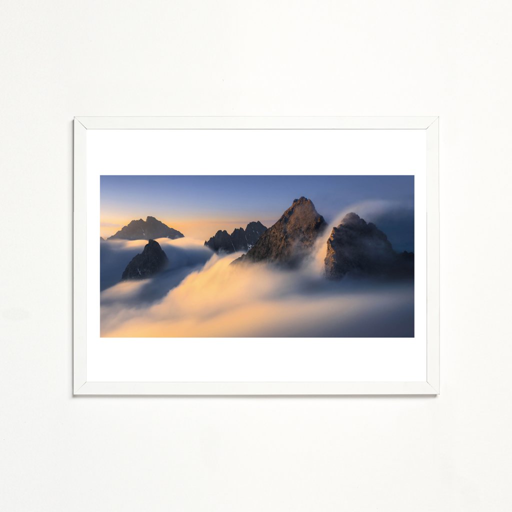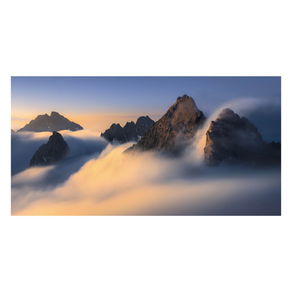 Řada vrcholů se vynořuje ze sametových mračen, která prořezávají zlaté sluneční paprsky. Modré a růžové tóny nebe kontrastují s teplými odlesky na skalách. Kompozice využívá vrstvení mraků pro atmosférickou perspektivu a dynamiku světla; je mistrovským zachycením přechodu mezi mlhou a jasem v horské krajině.