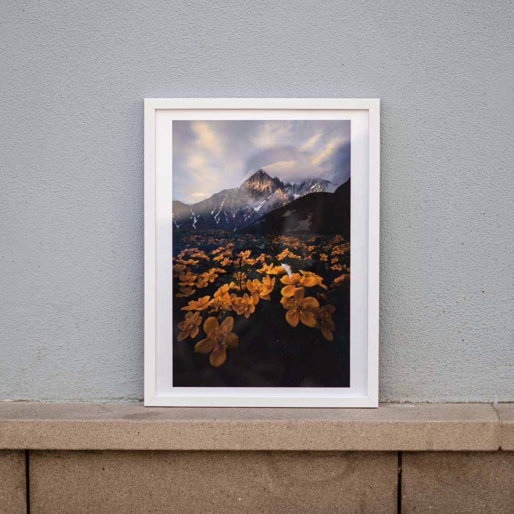 Popředí zaplavuje moře žlutých květů s výraznými okvětními laloky a tmavě zelenými listy, za nimi se zvedá ostrý, sněhem pokrytý vrchol obalený jemnou mlhou. Zlaté světlo prosvítá skrz mraky a vrhá dlouhé stíny přes svahy. Kompozice dává prostor jak detailům květin, tak celkové dramaturgii hory. Hra světla a stínů vytváří hloubku a pohyb, evokující přechod mezi údolím všednosti a výškami ambicí.
