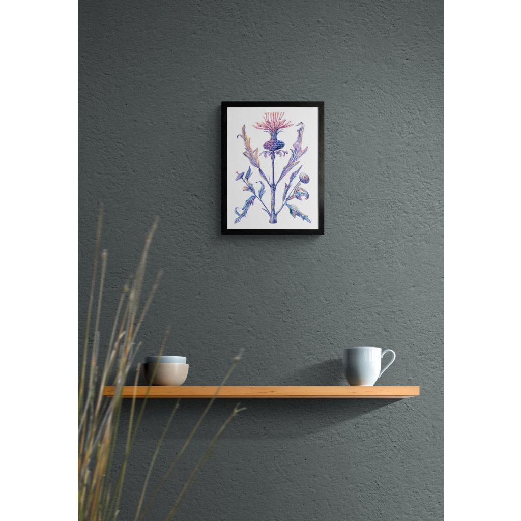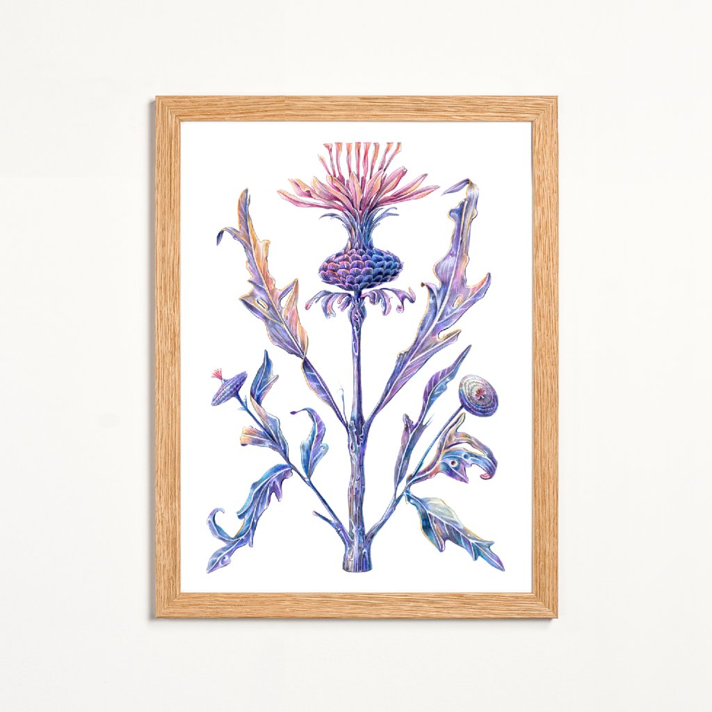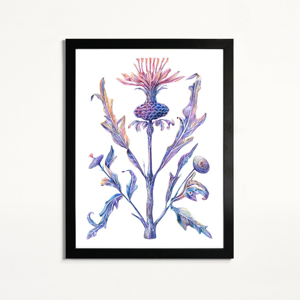 Obraz působí jako současná botanická ilustrace, která se od tradičního herbáře posouvá do snovější a osobitější roviny. Květ chrpy s výraznou strukturou, členitými listy a drobnými vedlejšími motivy vytváří kompozici, jež je precizní, ale zároveň živá a imaginativní. Obraz se krásně hodí do moderních i romanticky laděných interiérů, kde má umění působit klidně, sofistikovaně a neokoukaně.