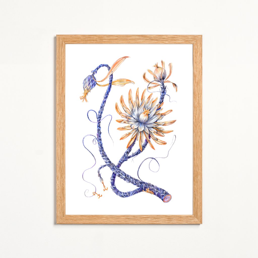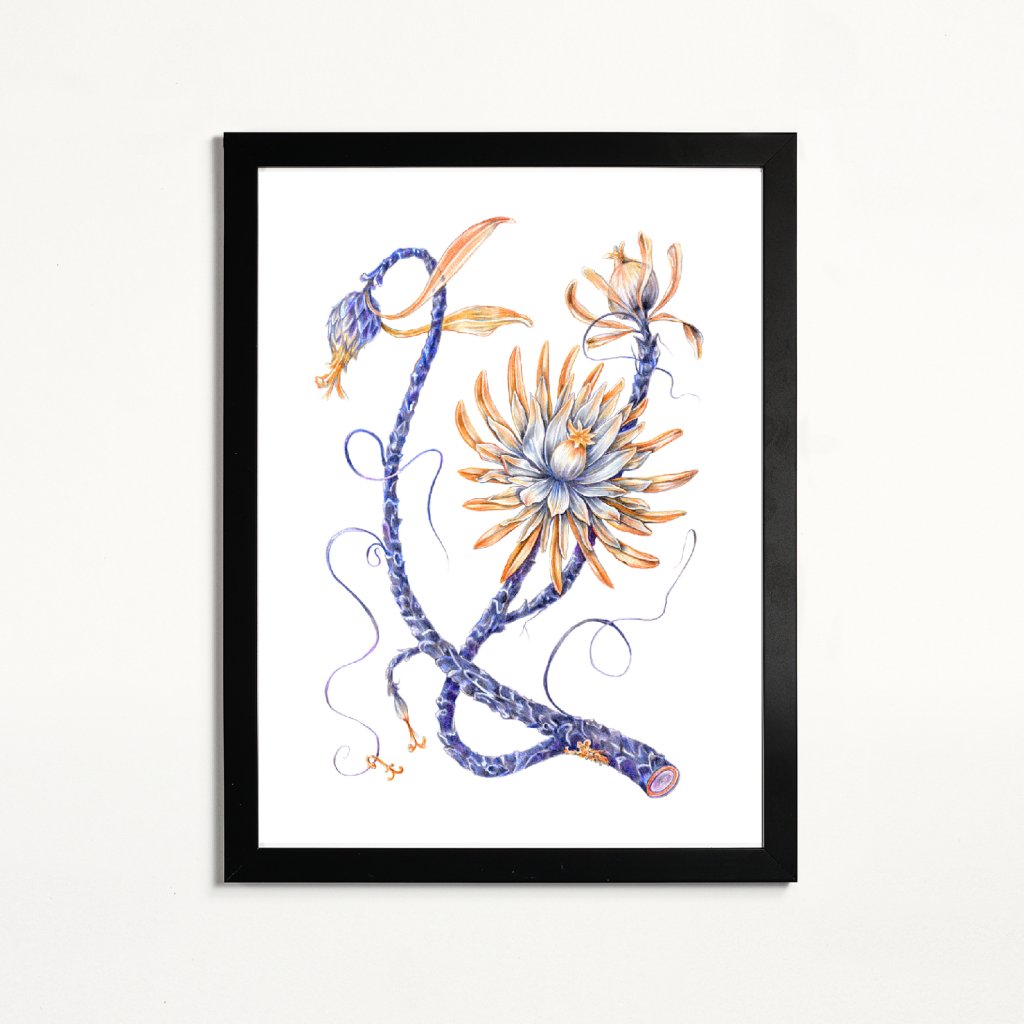 Dílo působí jako citlivé setkání pouštní strohosti a jemné květinové krásy, zachycené s mimořádnou přesností. Zakroucený stonek a otevřený květ vytvářejí kompozici plnou pohybu, křehkosti a nenápadné noblesy. Barevná paleta modré, fialové, krémové a teplé oranžové dodává dílu jemnou svěžest i dekorativní sílu.