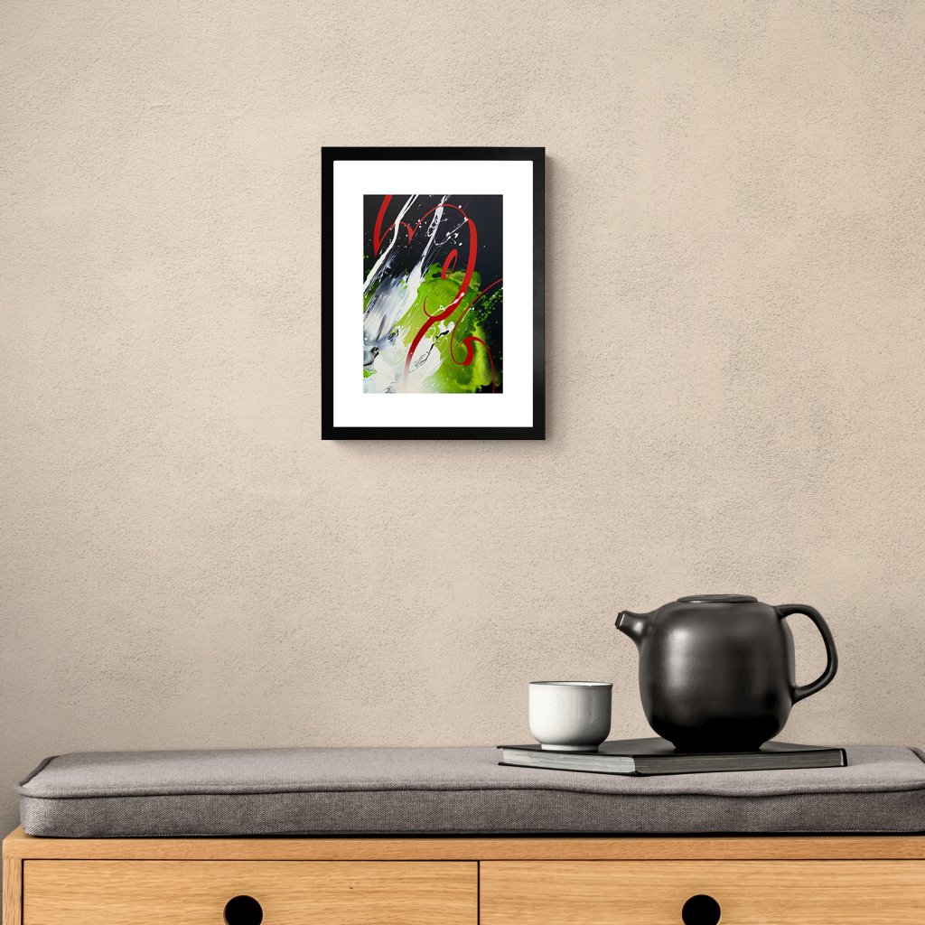 Obraz stojí na dramatickém kontrastu barev a výrazné vlnité linii, která kompozicí prochází jako padající stuha. Tekutá práce s barvou, stříkance a vrstvení vytvářejí pocit energie a neustálého napětí. Červený tah funguje jako hlavní nositel emocí, zatímco temné pozadí dodává hloubku a sílu. Skvělé do prostorů, které chtějí jasně komunikovat odvahu a současný vizuální jazyk.