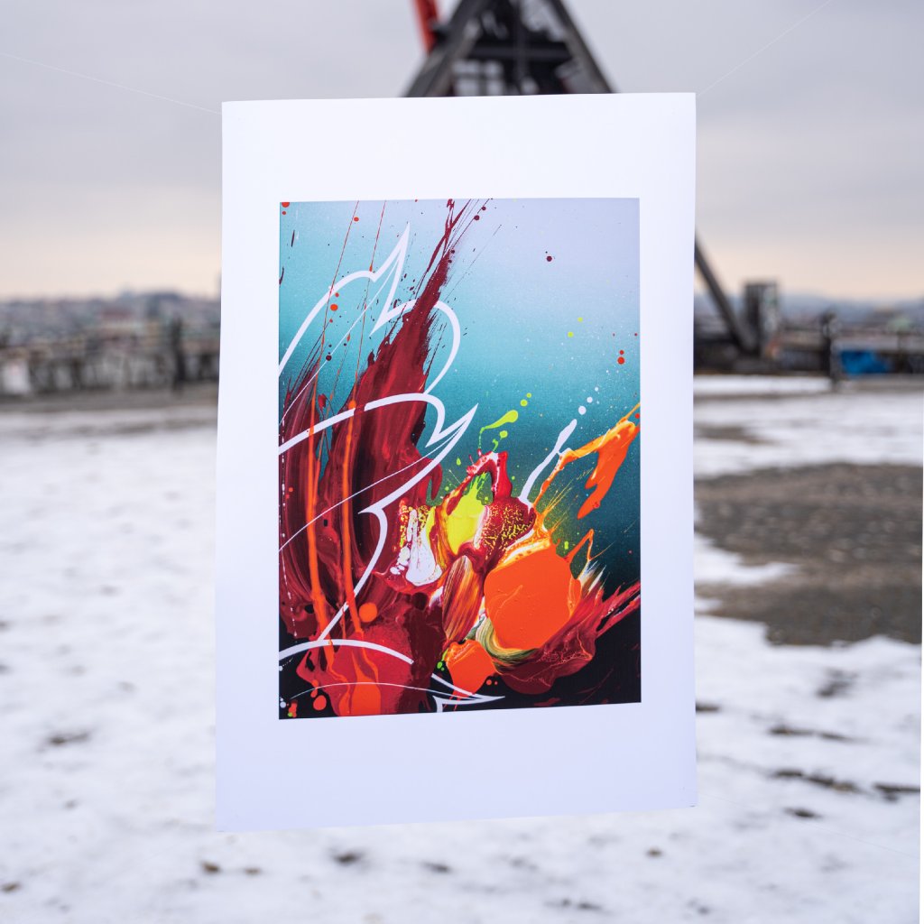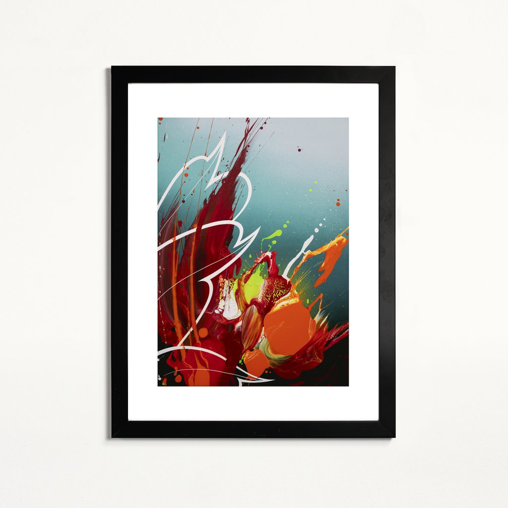 Obraz založený na kontrastu teplých červených a oranžových tónů proti chladnějšímu pozadí, čímž vytváří dojem pulzující vitality. Tekutá barva, stříkance a výrazné tahy působí spontánně a hravě, ale kompozice zůstává pevná a vyvážená. Ideální do moderních interiérů, otevřených prostor a míst, kde má obraz fungovat jako zdroj energie.