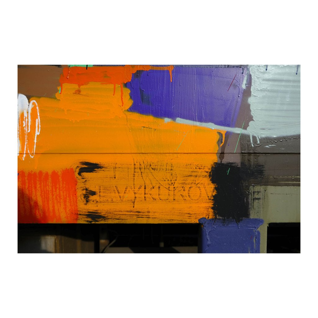 Široké oranžové plochy s vrstvami modrých, černých a zelených sprejů na starém vagonu. Ten se dá identifikovat pouze podle téměř nečitelného nápisu EL. VYKUROVANIE (elektrické vytápění). Syrové textury kovu a barev spojují industriální minulost s graffiti. Fotka zachycuje spontánní dílo na nepoužívaném a zapomenutém vagonu.