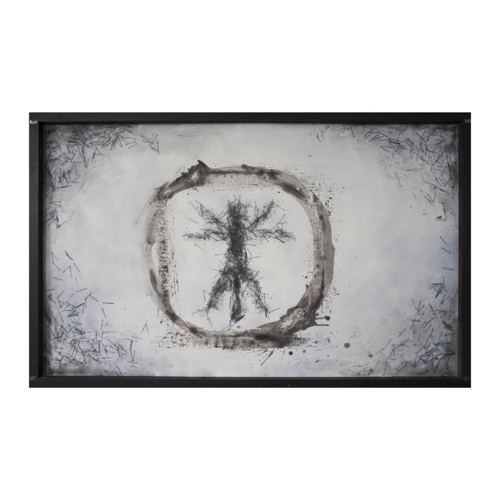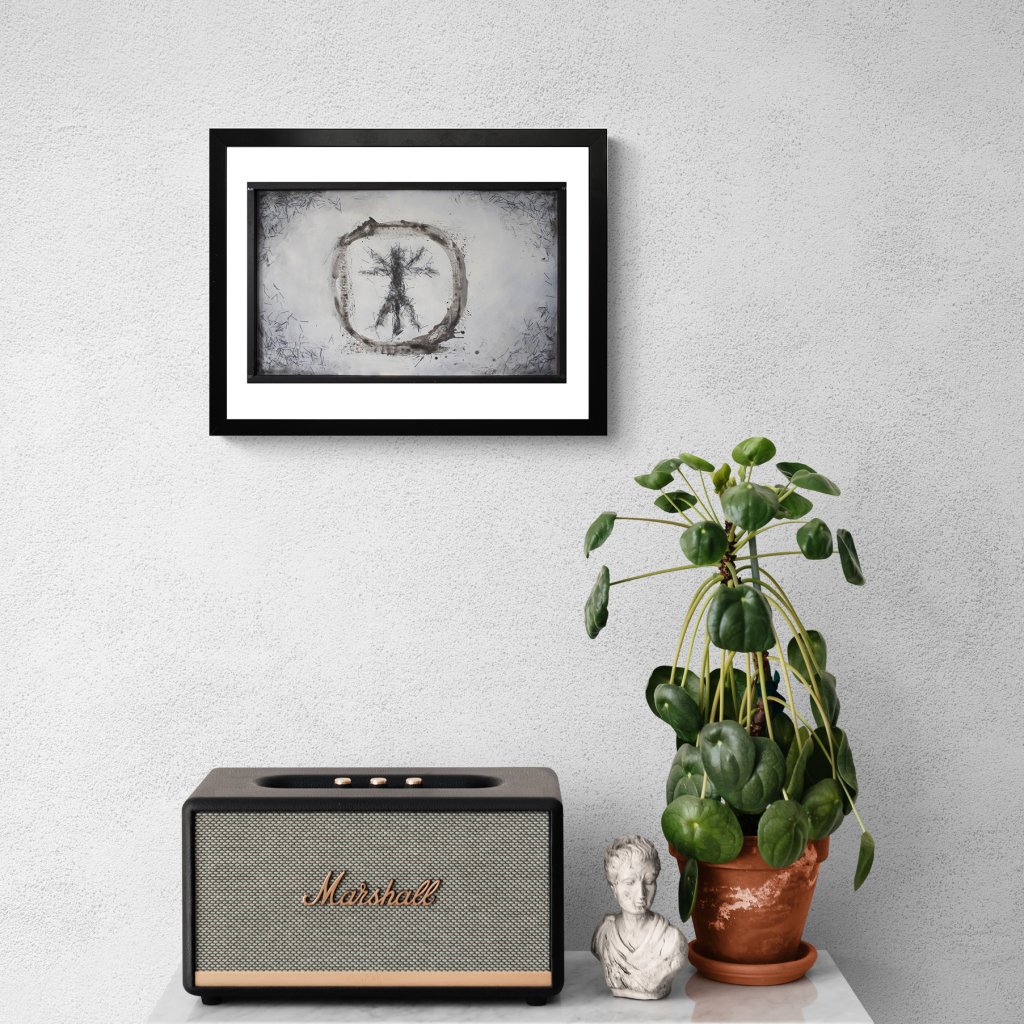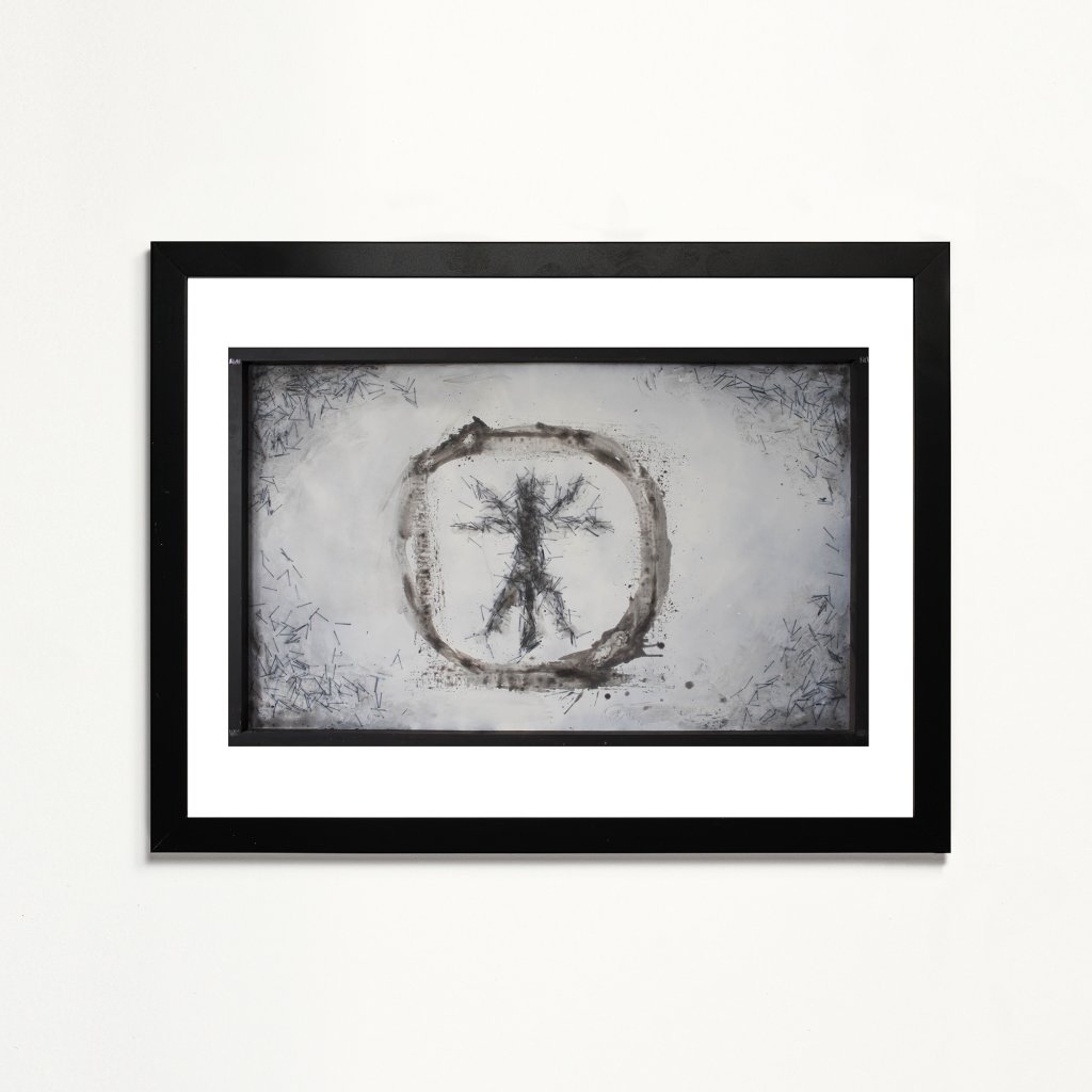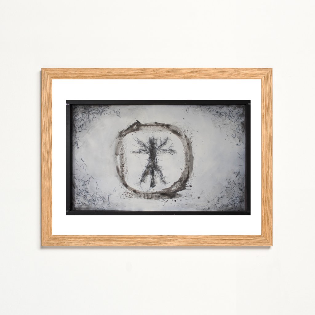 Dílo pracuje s jednoduchým symbolem a tlumenou černobílou škálou, která dává vyniknout struktuře a stopám práce ruky. Působí klidně, jako vizuální pauza s podprahovým napětím. Skvělý do pracovny, chodby a jakéhokoliv minimalistického prostoru.
