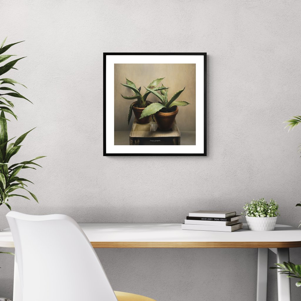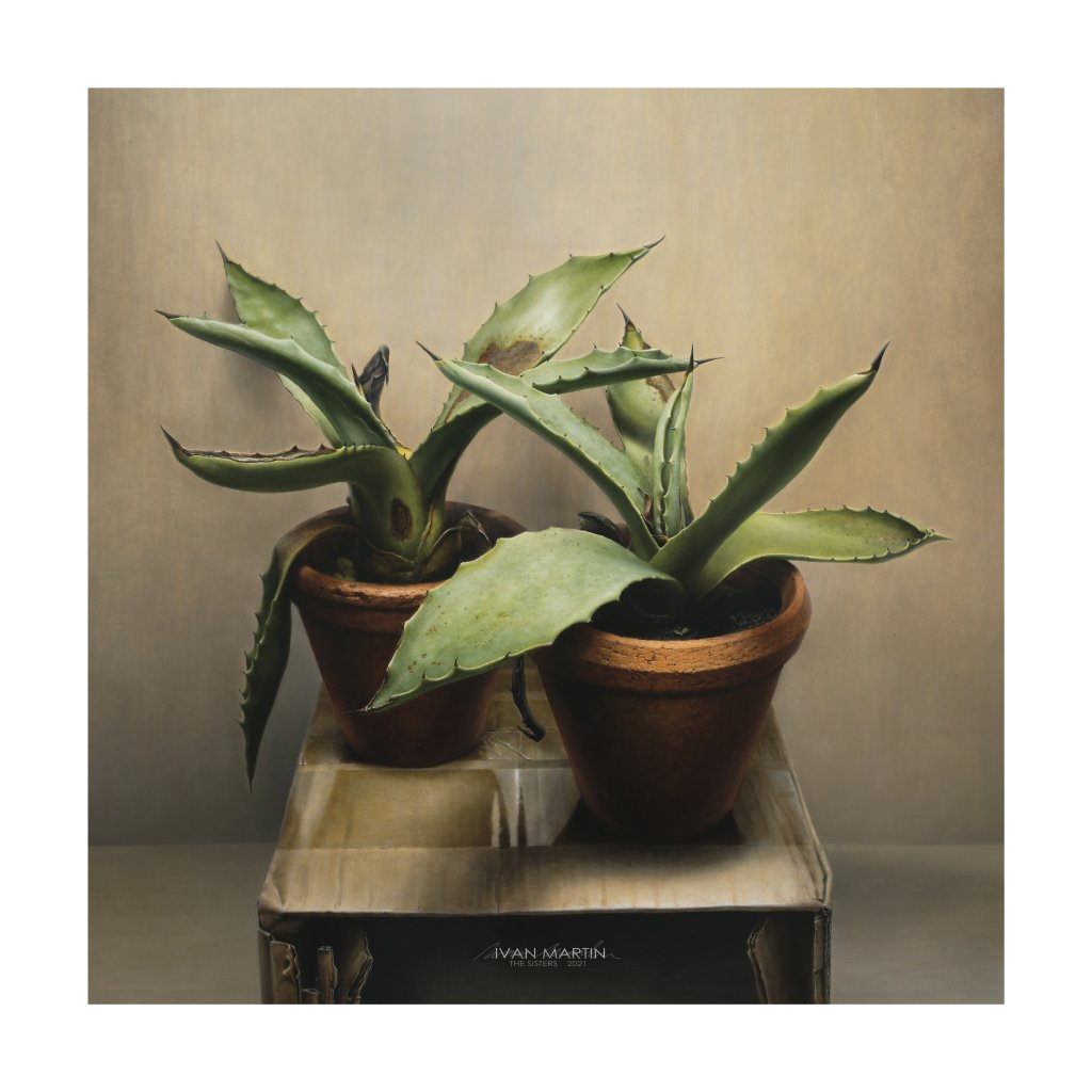 Dvě agáve americké s typicky ostrými, špičatými listy v odstínech zelené jsou umístěny na staré papírové krabici. Jedna z nich je nemocná, snad možná i umírá, stejně tak krabice nese známky rozkladu. Měkké boční světlo modeluje objem listů a šrámy, zatímco hnědé květináče s kovovým leskem přidávají materiálovou rozmanitost. Kompozice je symetrická a vycentrovaná, což zdůrazňuje harmonii jednoduchých forem a textur. Zátiší rezonuje s tématy přírody v uzavřeném prostoru, trvalosti a estetiky suchých pustin.