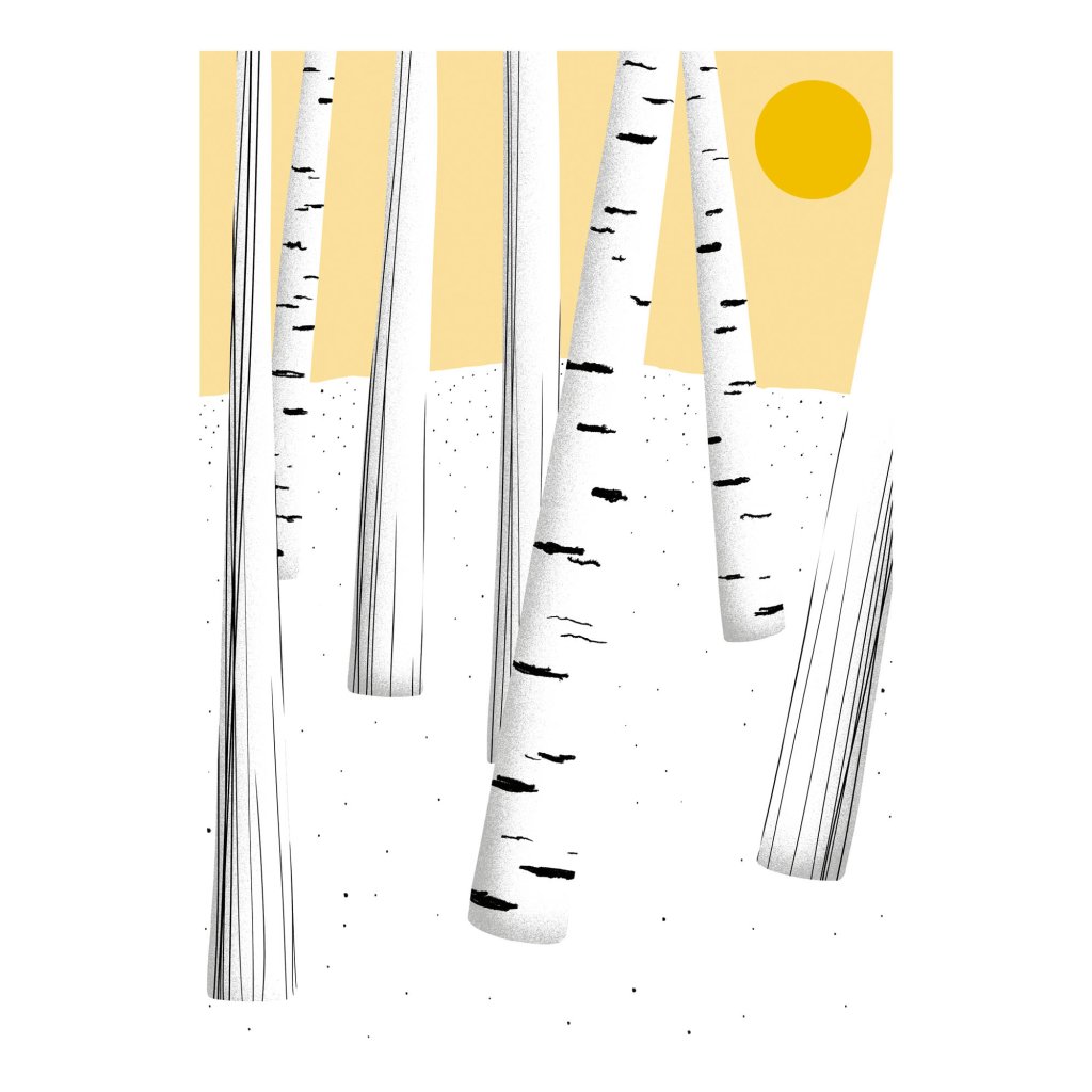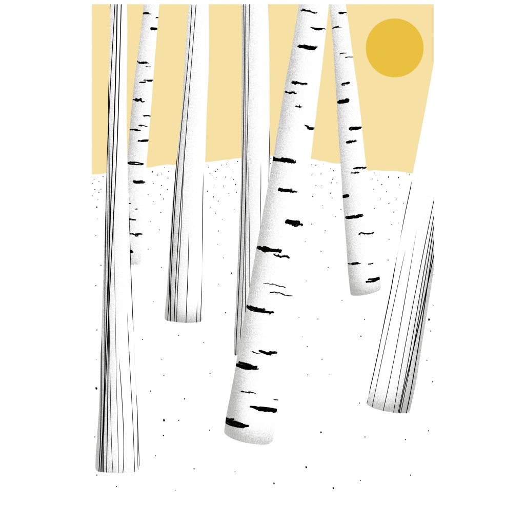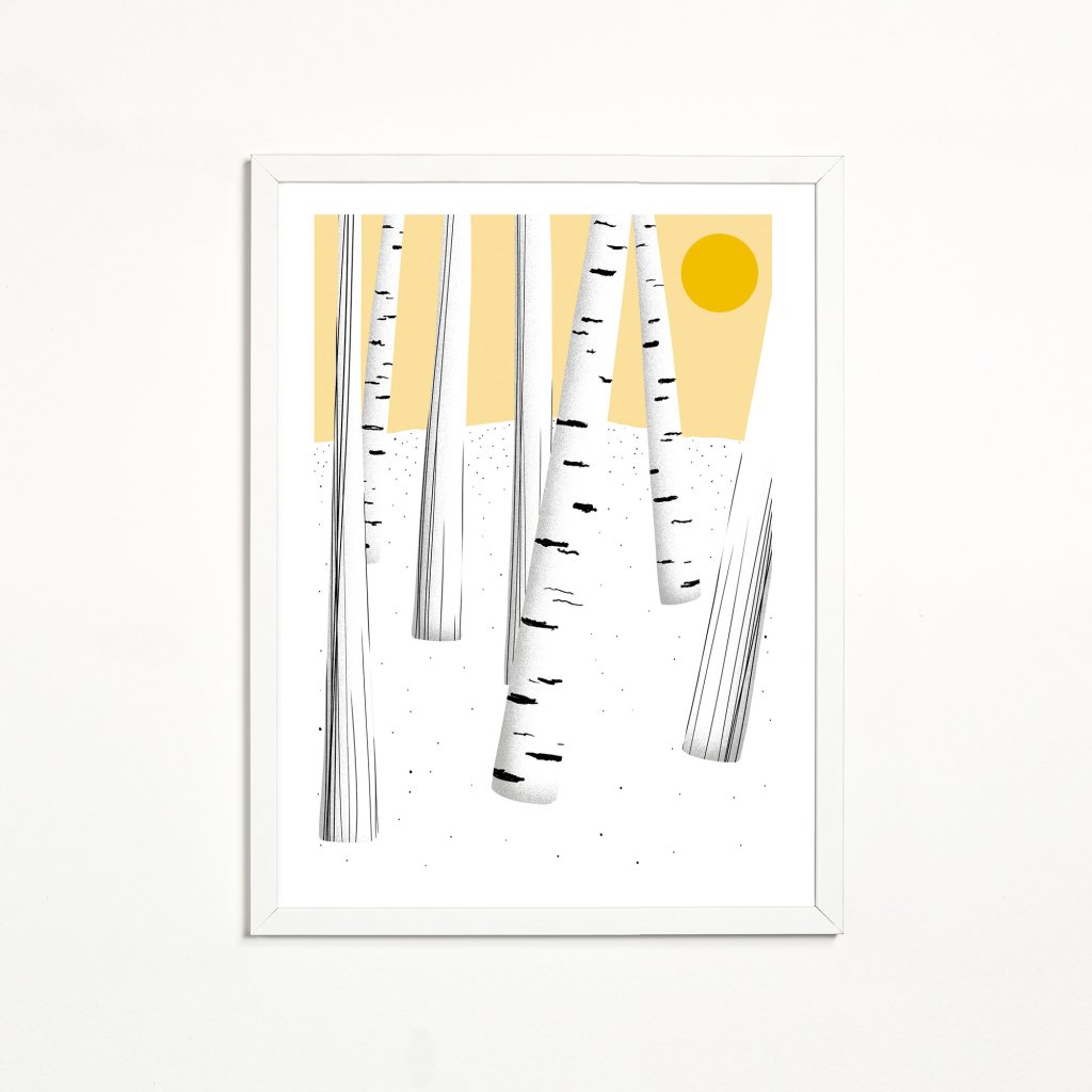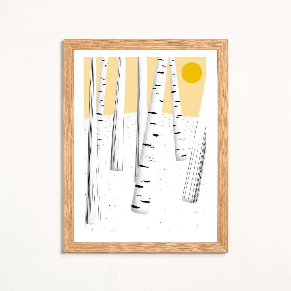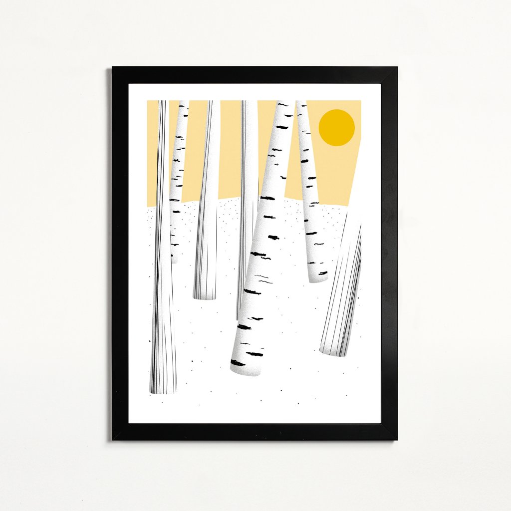 Jednoduchá kompozice vertikálních linií, jemná textura a teplý akcent slunce v pozadí. Redukovaná barevnost nechává vyniknout rytmu lesa a pocitu prostoru mezi stromy. Celek působí lehce, čistě a meditativně. Dílo se hodí do světlých interiérů, ložnic, pracoven nebo míst, kde má obraz spíše zklidňovat a podporovat soustředění.