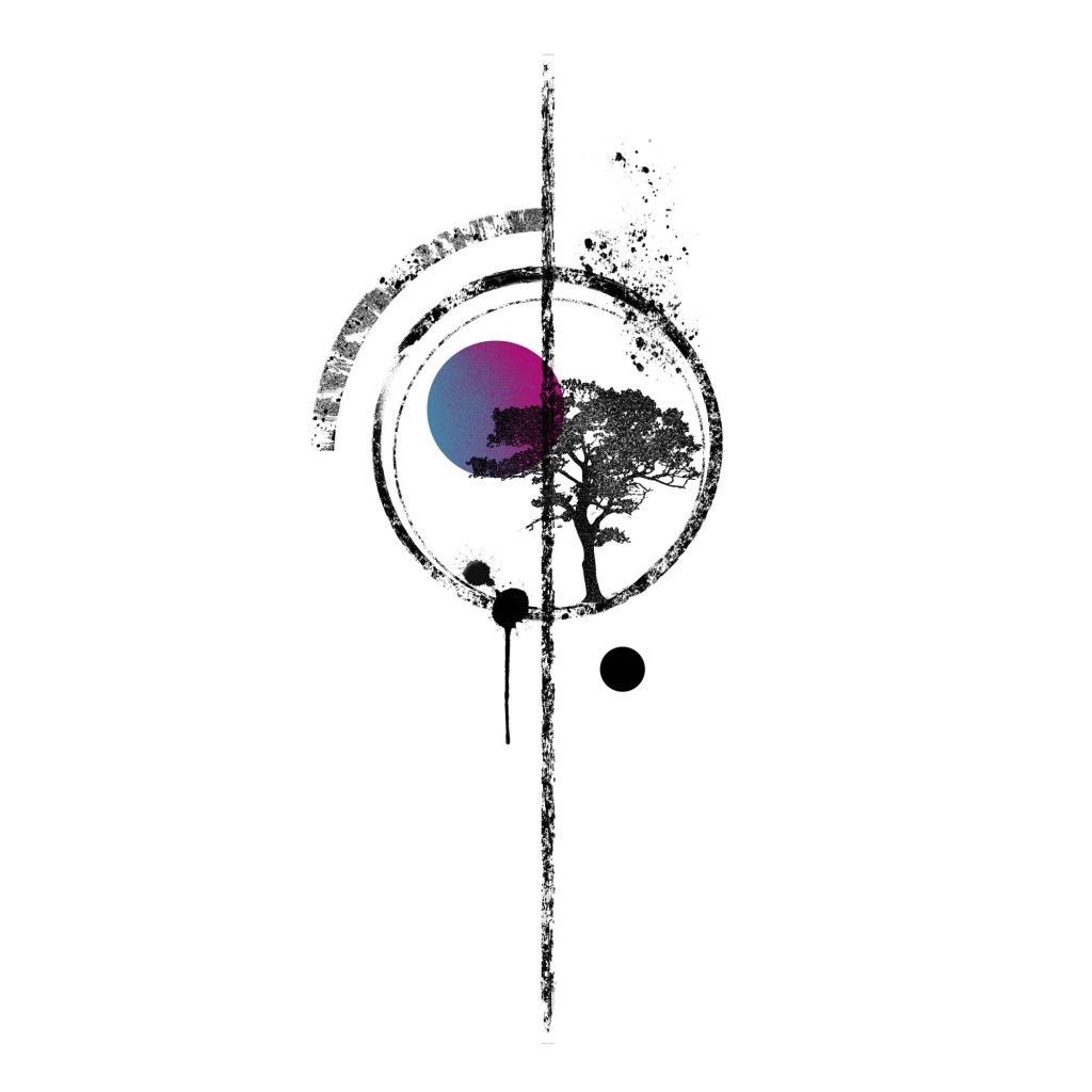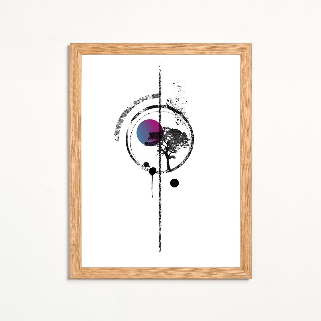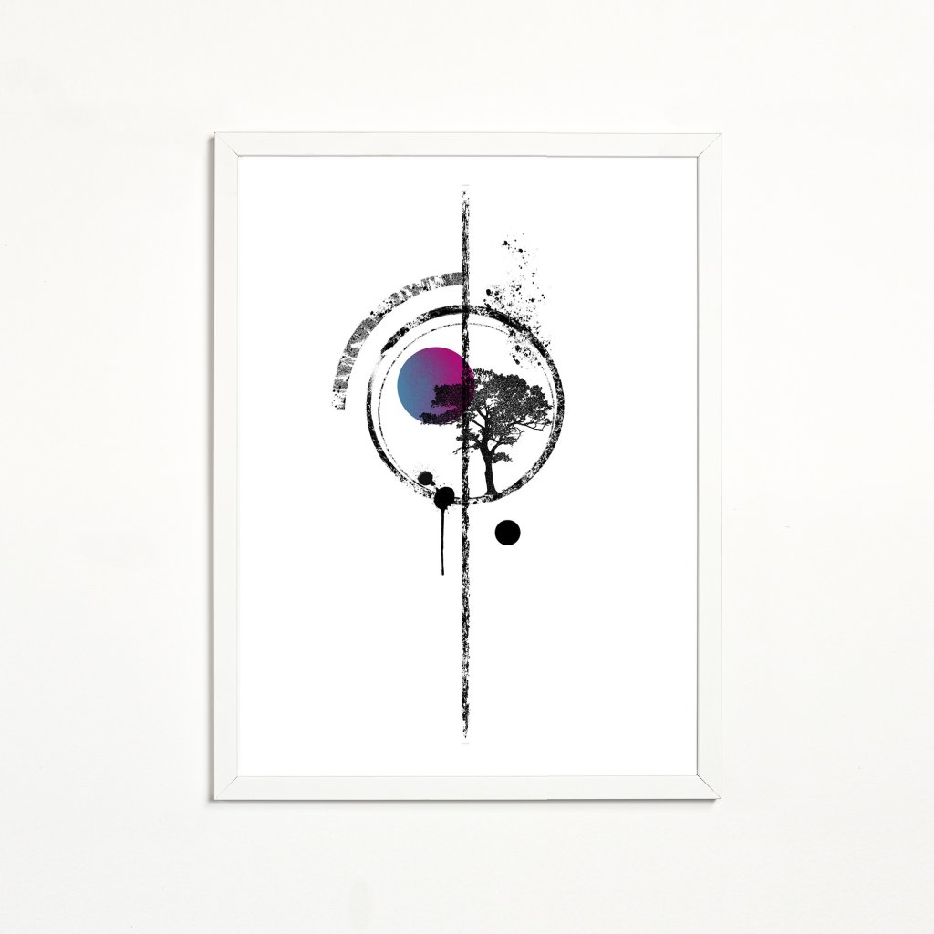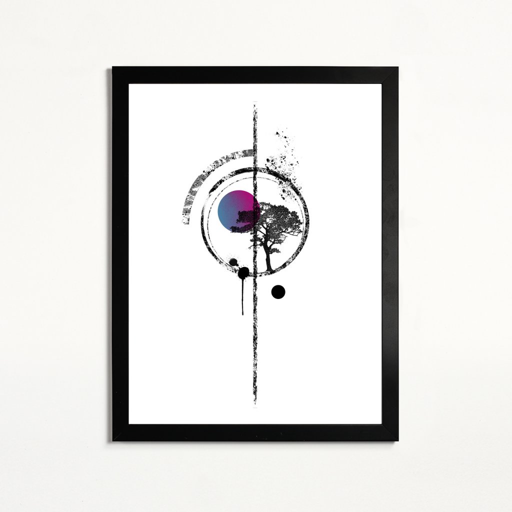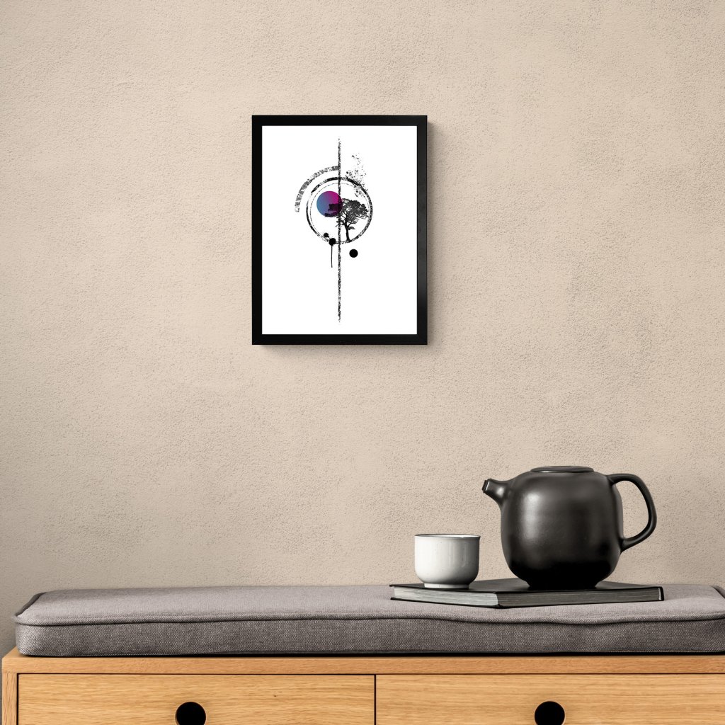 Kruh jako hlavní motiv rámuje strom a barevný dodatek, které dohromady vytvářejí klidný, až meditativní celek. Kombinace černé, bílé a jemné barvy působí vyváženě a nadčasově. Dílo se hodí do obývacího pokoje, pracovny nebo na místa odpočinku.