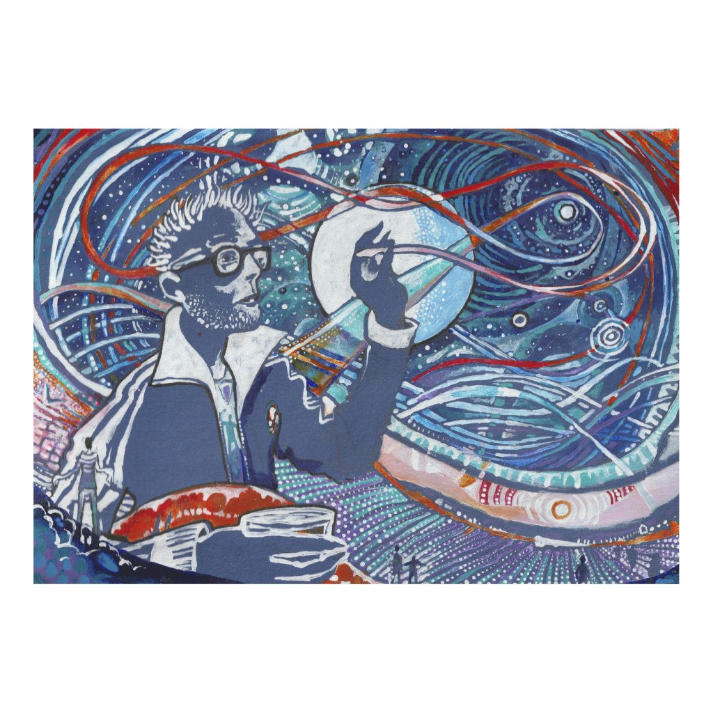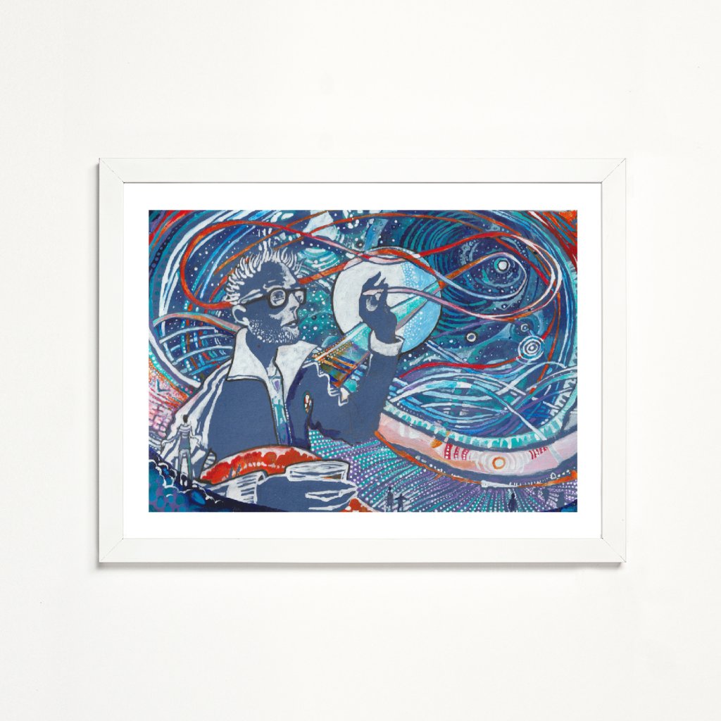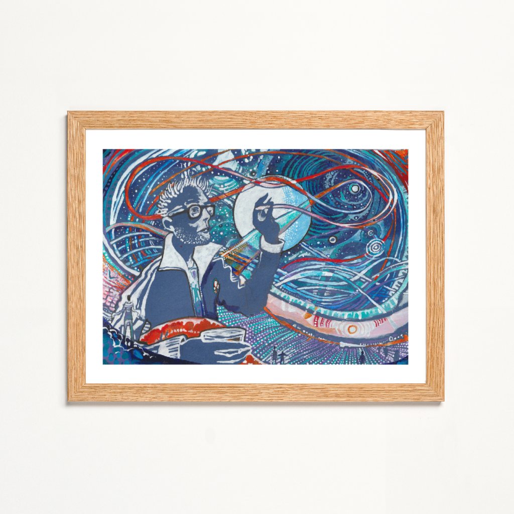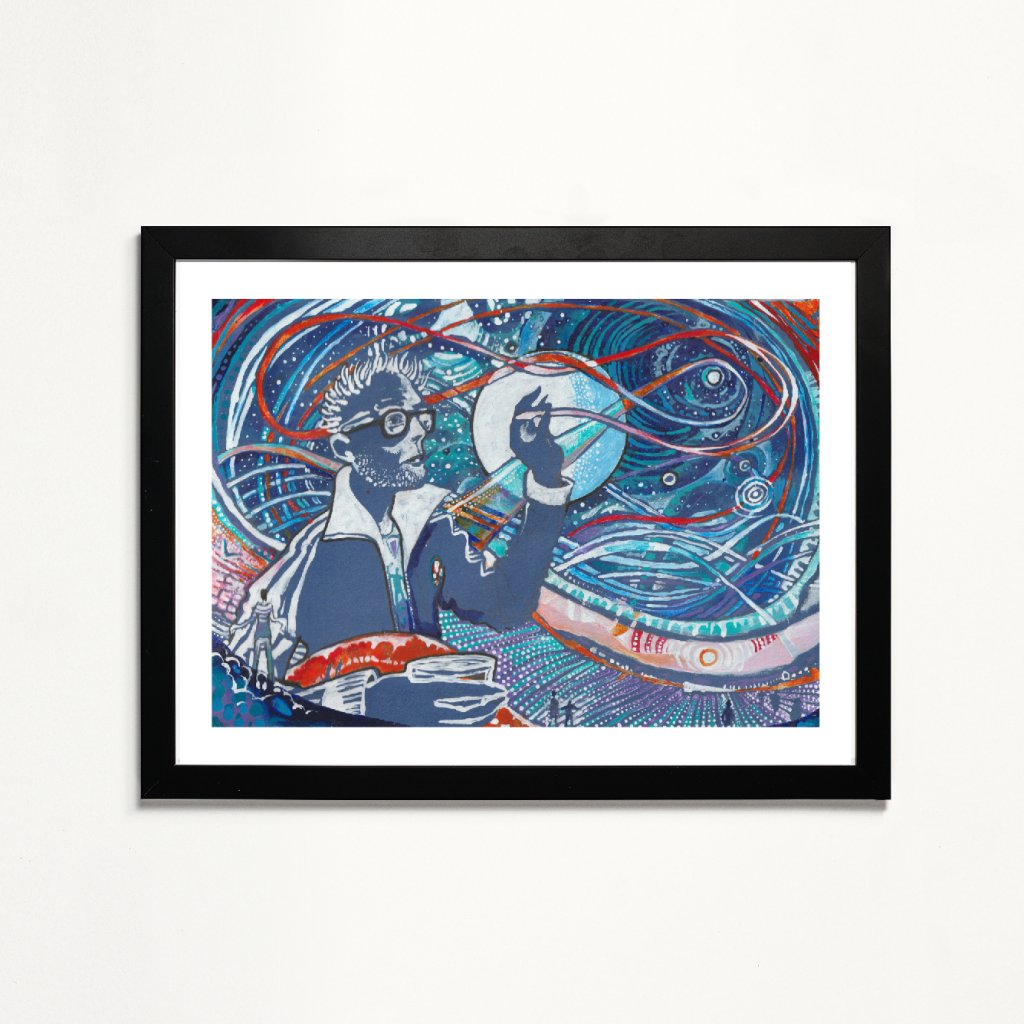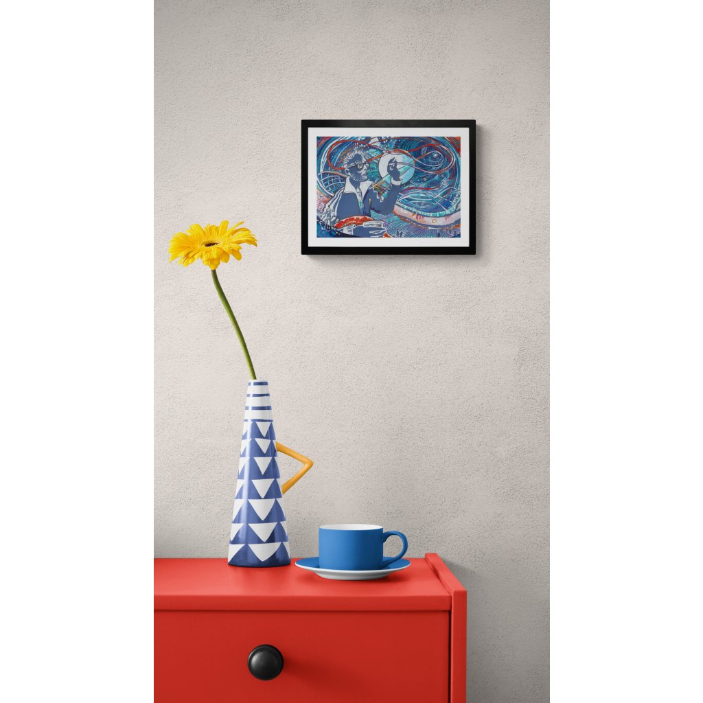 Tento výrazný obraz kombinuje autoportrét s abstraktními liniemi, symbolickými tvary a kosmickou energií, která vzdává poctu indické bohyni ženské kreativní síly Šakti. Bohatá skladba modrých, tyrkysových, bílých a červenooranžových akcentů vytváří dojem proudění, inspirace a mentálního pohybu. Dílo působí odvážně, sebevědomě a velmi živě, takže výborně funguje jako dominantní prvek na stěně.
