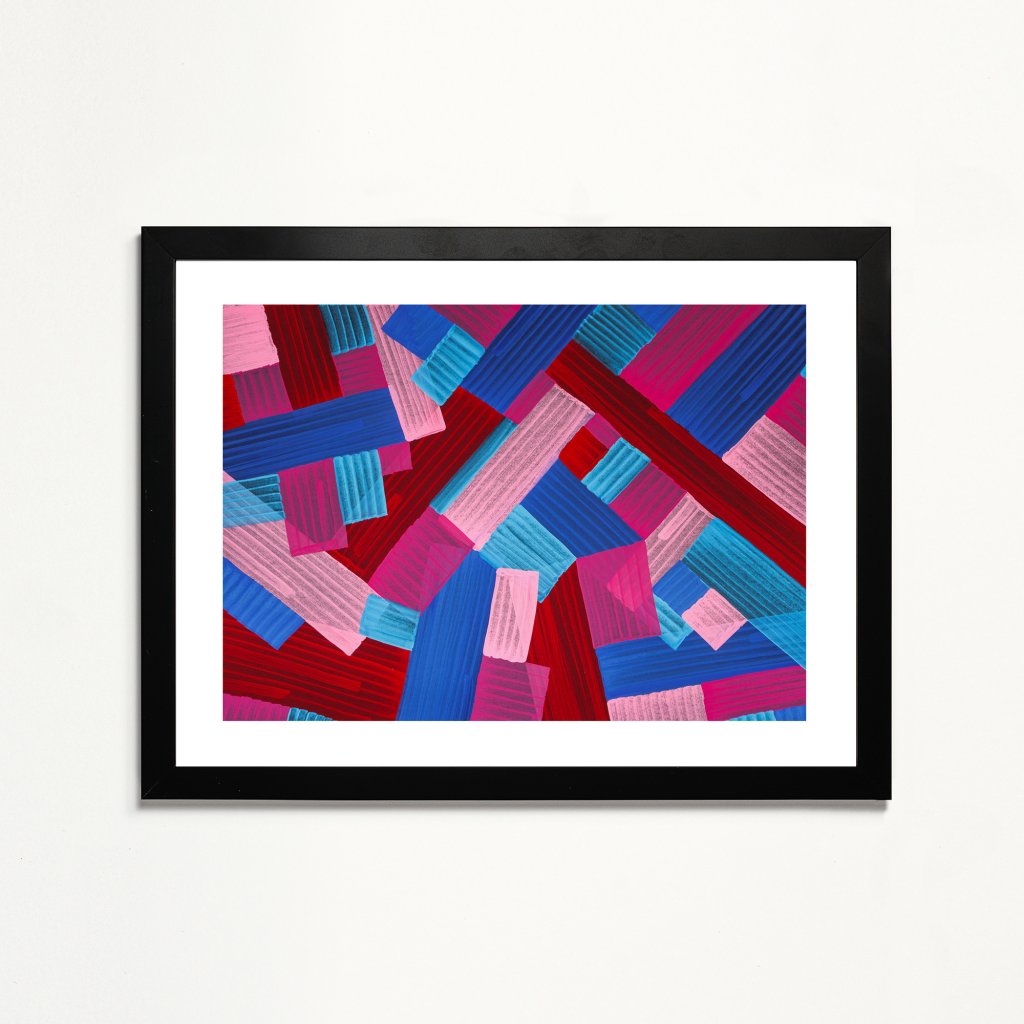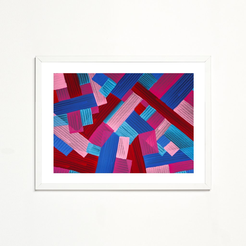 Druhá, ještě o trochu abstraktnější krajina Jana Lamra. Staví na geometrických plochách, průsvitech a kontrastních barvách, které se vzájemně překrývají a vytvářejí pocit hloubky a pohybu. Opakující se tahy evokují terén, architekturu i mapu, aniž by se vázaly ke konkrétnímu místu. Obraz se hodí do všech moderních prostor, kde má fungovat jako silný vizuální akcent bez doslovnosti.