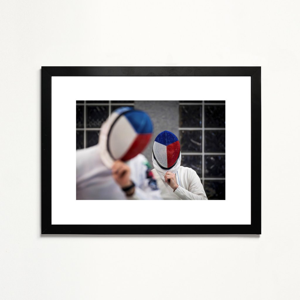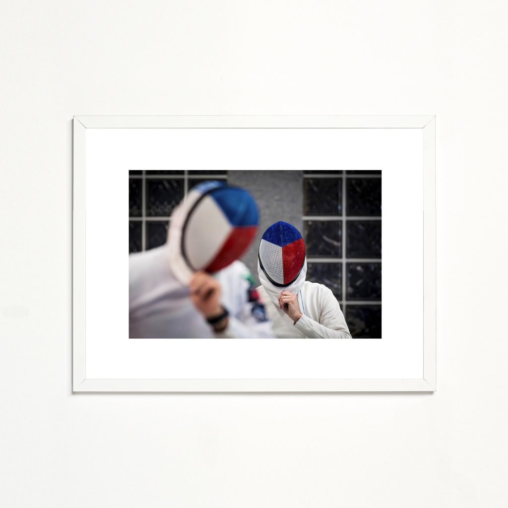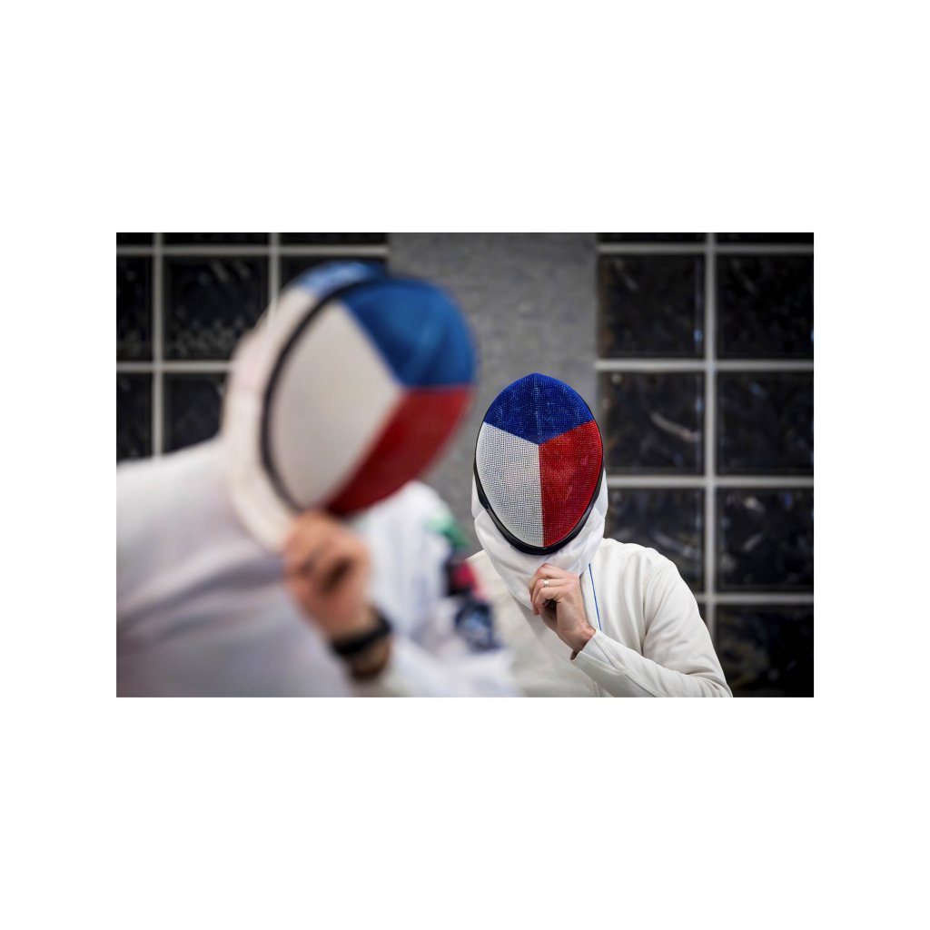 Dva šermíři s maskami zdobenými českou vlajkou vyjadřují klidnou odhodlanost. Tmavé pozadí a měkké osvětlení vytvářejí atmosféru předzápasové koncentrace a respektu k soupeři. Detail rukou a gest dodává fotografii autentický sportovní nádech. Ideální pro fanoušky šermu i jako symbol české sportovní tradice.