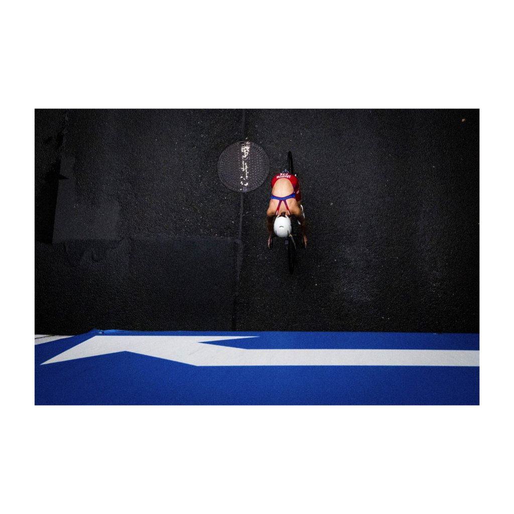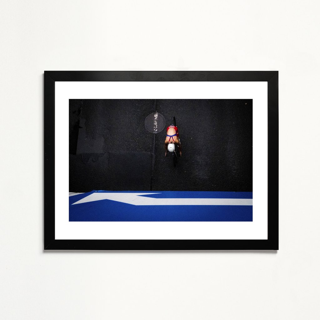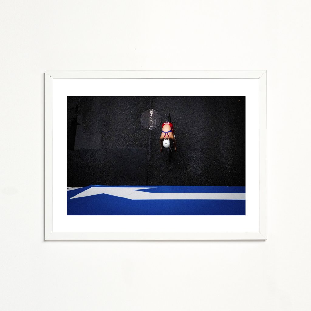 Cyklistka v rychlé jízdě po silnici, kde její červený dres a pokožka vyčnívá proti tmavému povrchu. Bílá šipka na modrém podkladu zesiluje dojem směru a rychlosti, vytvářejíc dynamickou diagonální kompozici. Perfektní pro sportovní prostory nebo motivaci v pracovním prostředí.