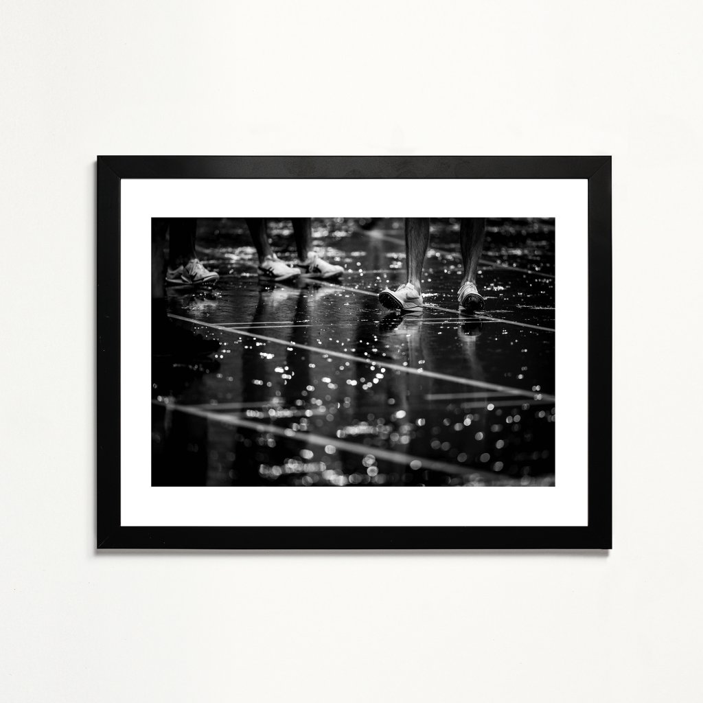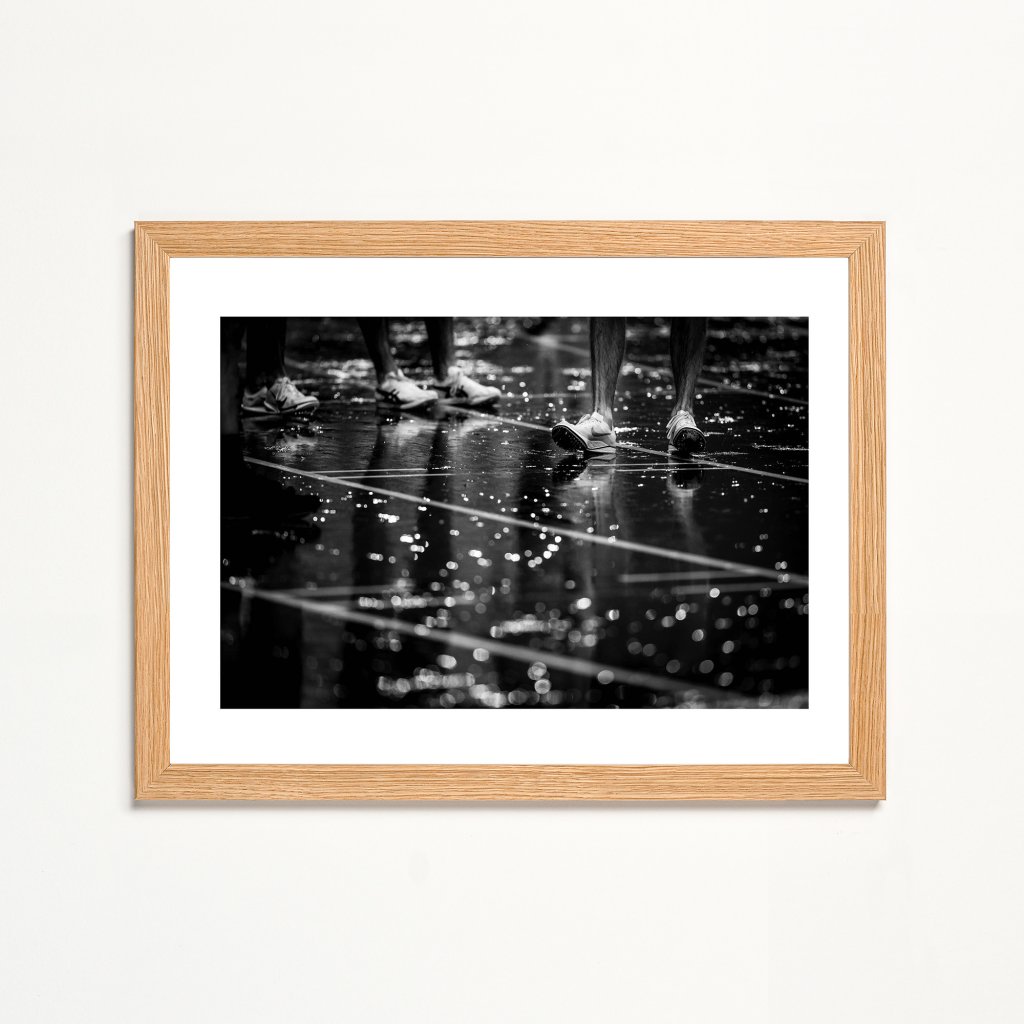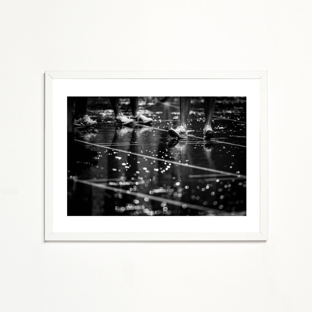 Fotografie běžecké dráhy v dešti a nohou běžců, kteří mají pár minut do startu závodu. Kapky vody a reflexy vytvářejí dramatický kontrast a podtrhují napětí a sportovní soudržnost. Skvělé pro pokoje mladých sportovců, sportovní bary a jiné prostory.