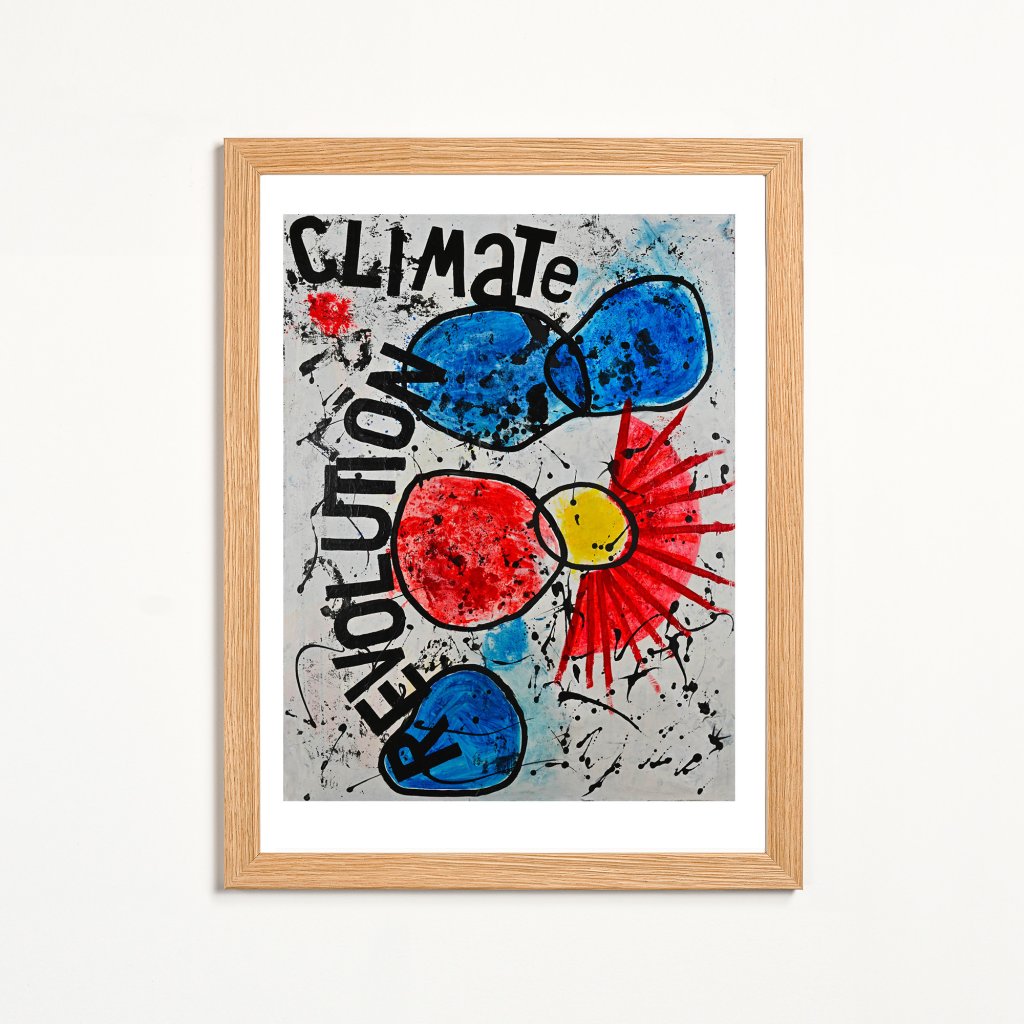Dílo pracuje s výrazným nápisem Climate Revolution jako přímým sdělením, které je dále podpořeno kontrastními barevnými tvary v modré, červené a žluté. Silné černé linie, rozstřiky barvy a dynamické paprsky vytvářejí dojem exploze energie a neklidu. Obraz působí syrově, až protestně, a připomíná vizuální jazyk street artu nebo angažovaného plakátu.
