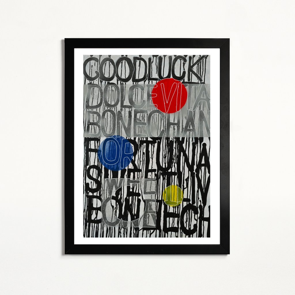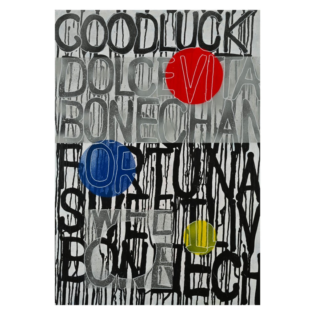 Dílo staví na opakování slov a výrazné typografii, která je částečně překrývána, stéká a mizí v dalších vrstvách. Černobílý základ narušují barevné kruhy v červené, modré a žluté, které fungují jako vizuální orientační body v husté struktuře textu. Stékající barva a syrové provedení odkazují na městské prostředí a plakátovou kulturu. Obraz působí energicky, neuhlazeně a sebevědomě a bude výrazný statementem v současném interiéru.