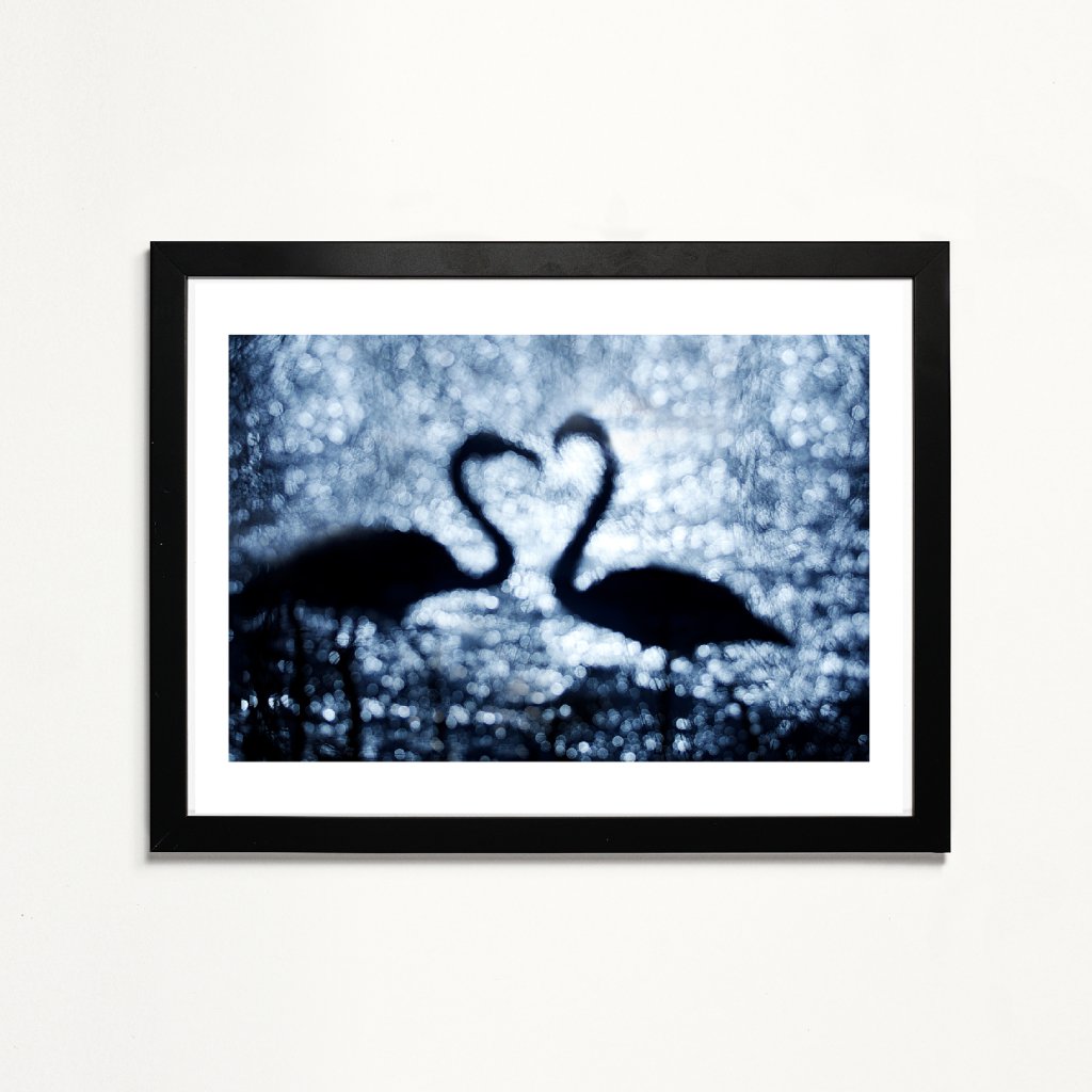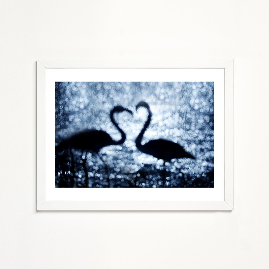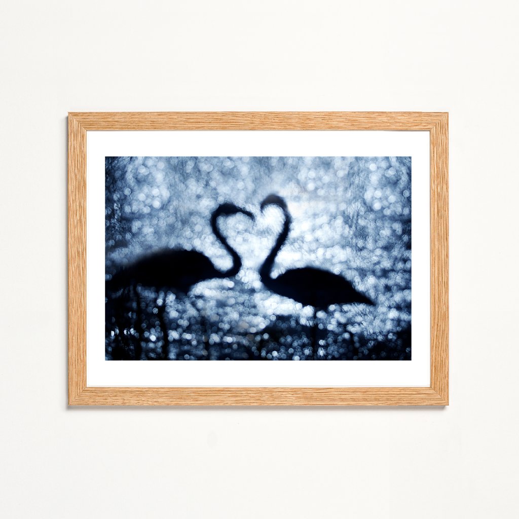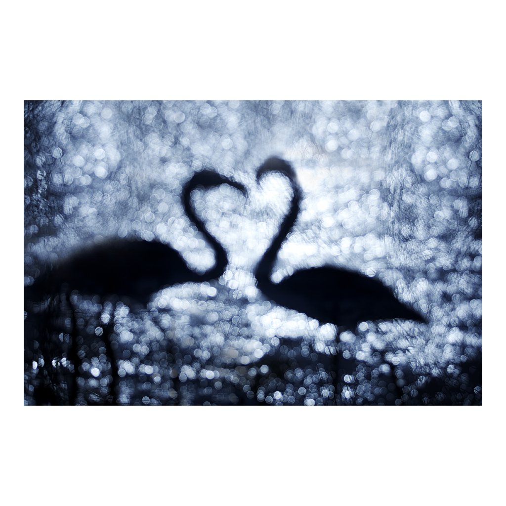 Fotografie pracuje s jemným rozostřením, které proměňuje vodní hladinu v třpytivou abstrakci. Siluety labutí splývají do tvaru srdce, symbolu blízkosti i křehkosti vztahů. Chladná modrá tonalita podtrhuje intimní, téměř snovou atmosféru. Ideální do ložnice, klidového koutku nebo minimalistického prostoru.