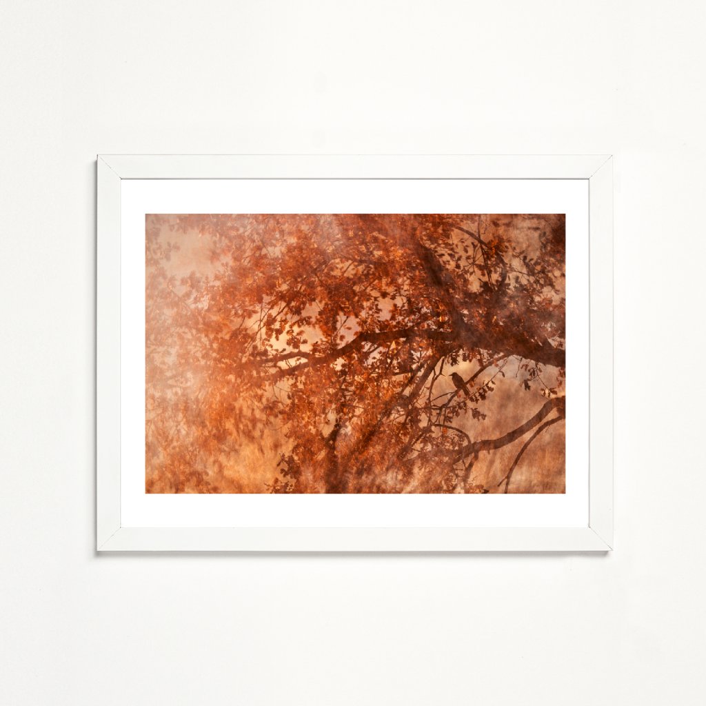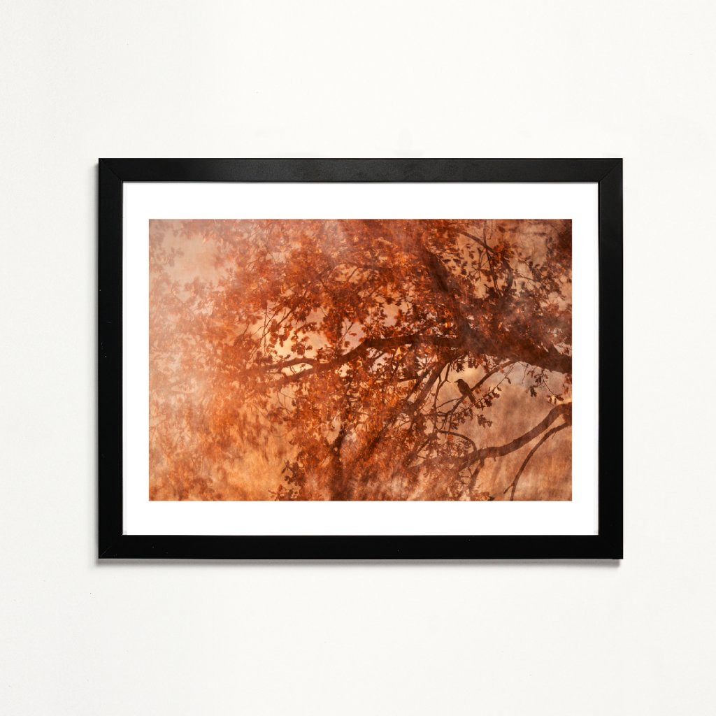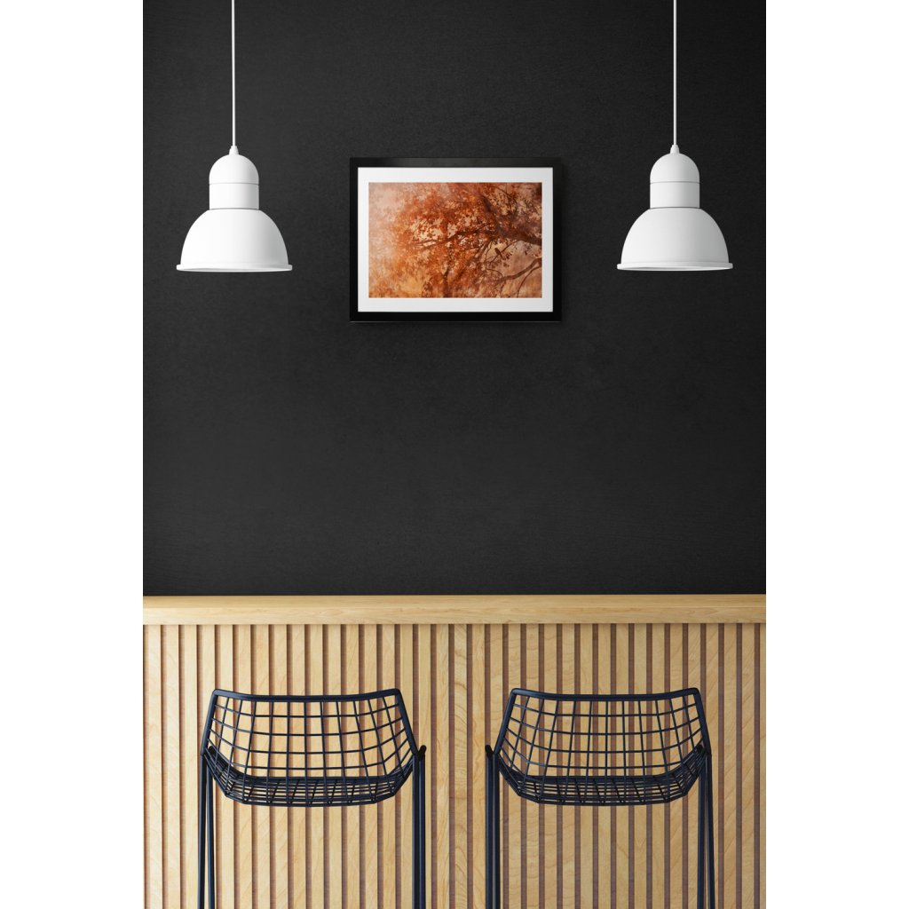 Dílo pracuje s překrytím větví a textur, které vytvářejí téměř malířský efekt plný pohybu. Dominantní oranžové a měděné tóny evokují podzimní světlo a jeho proměnlivost. Silueta malého opeřence dodává scéně příběh a tichý moment zastavení uprostřed větví a listí. Ideální volba do obývacího prostoru nebo místností s teplými materiály, kde podpoří útulnou atmosféru.