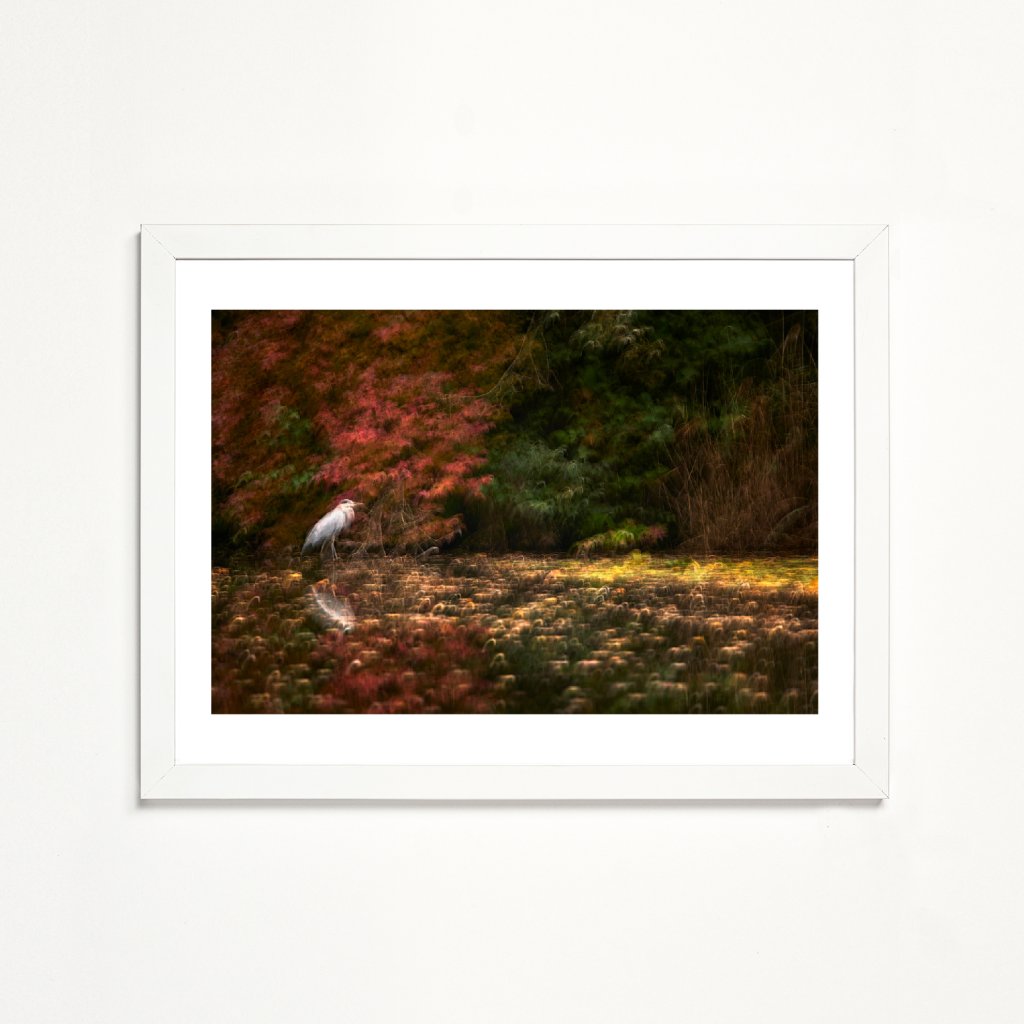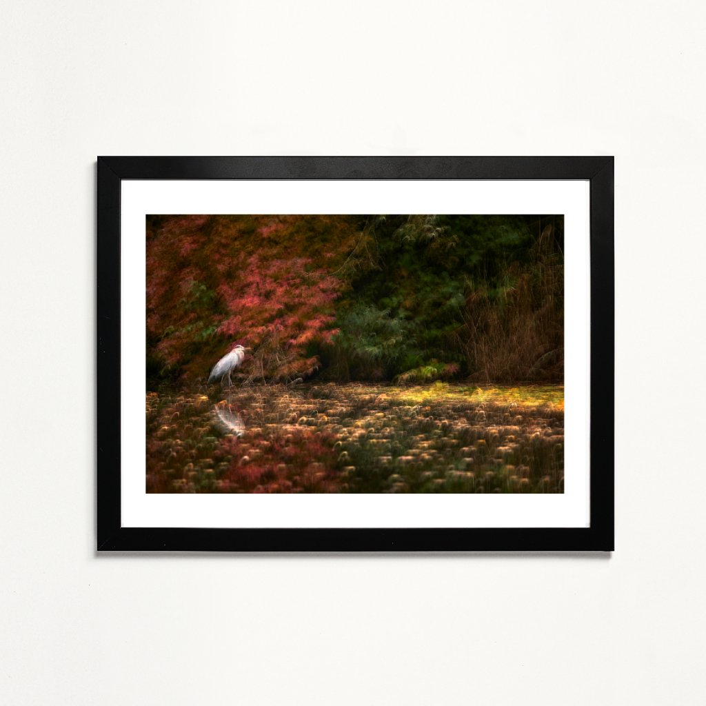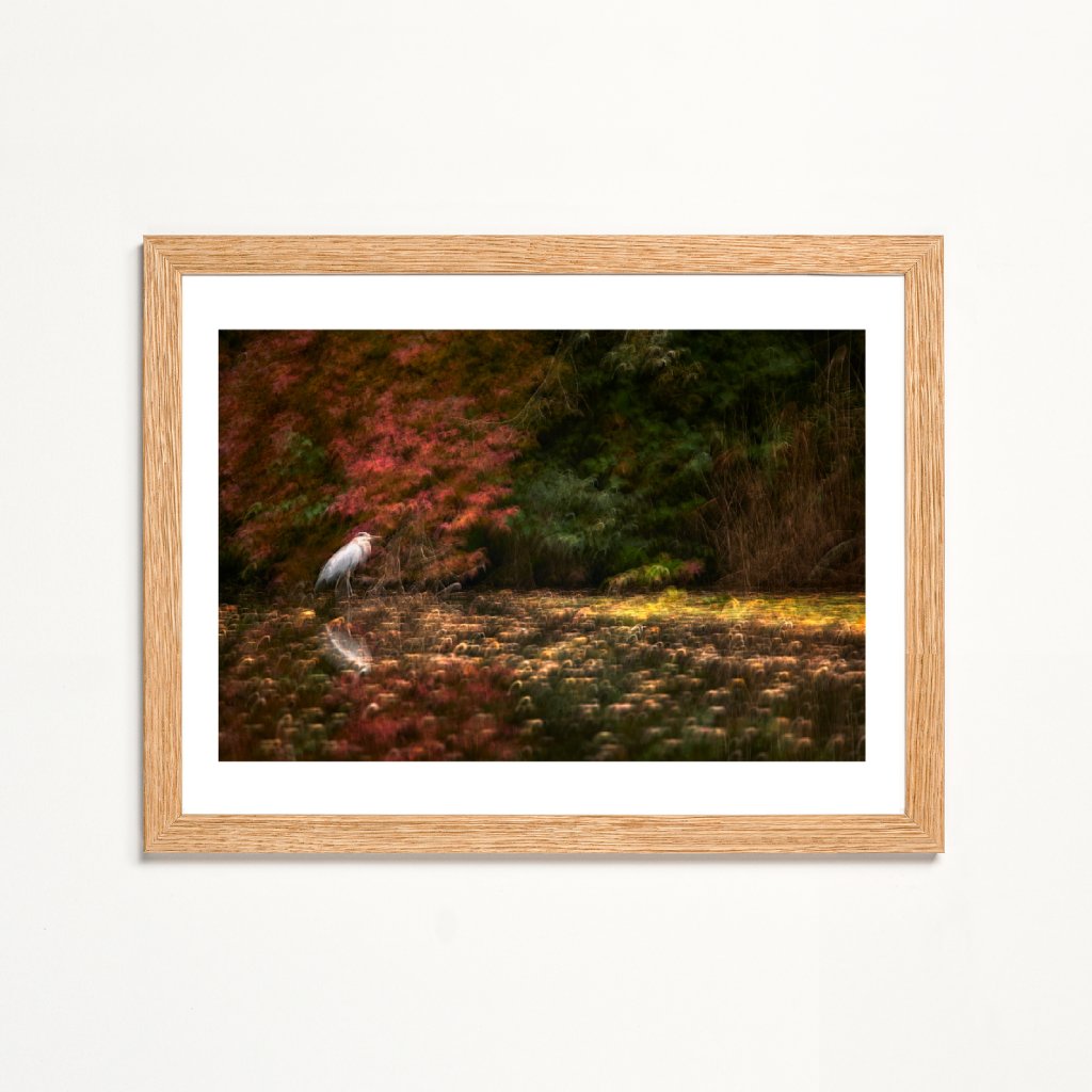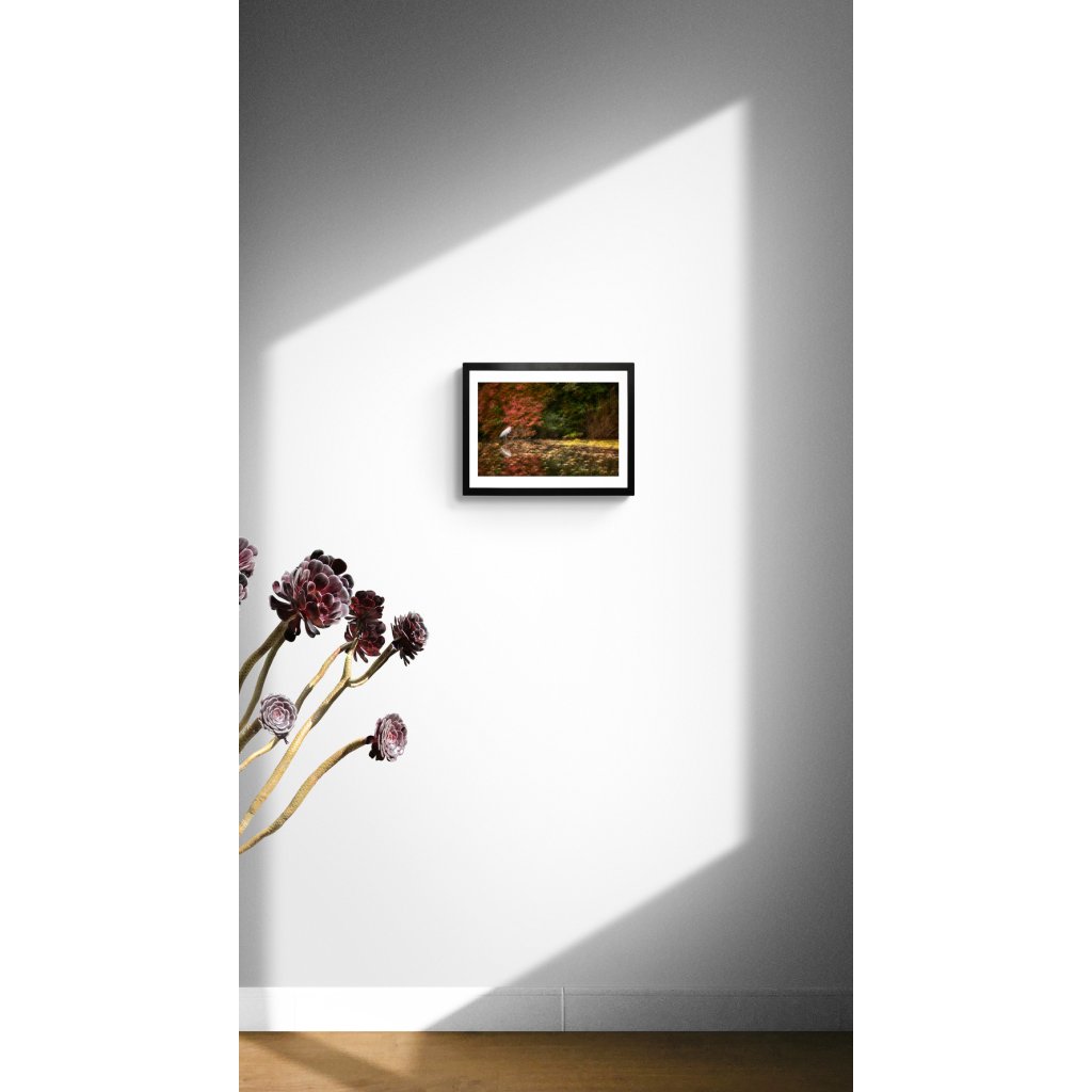 Fotografie spojuje zdánlivě neklidnou přírodu s klidnou přítomností ptáka, čímž vzniká napětí mezi pohybem a tichem. Teplé červené a zelené odstíny podzimu jsou zjemněny technikou ICM (Intentional Camera Movement), která scénu proměňuje v téměř impresionistický obraz. Meditativní kompozice skvěle doplní interiér, kde hledáte rovnováhu mezi energií a klidem.