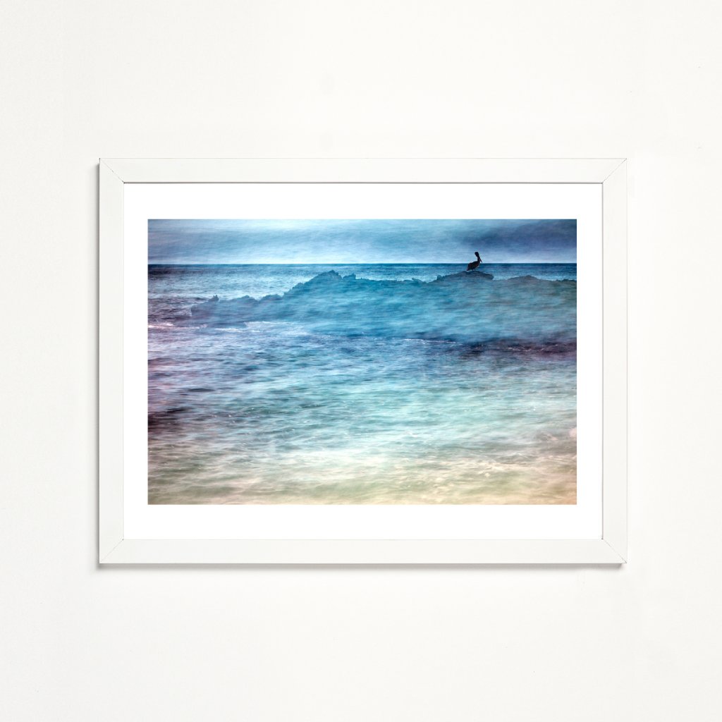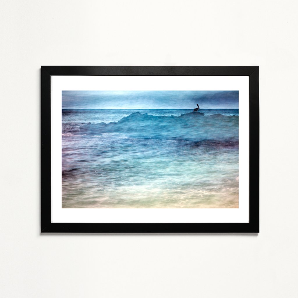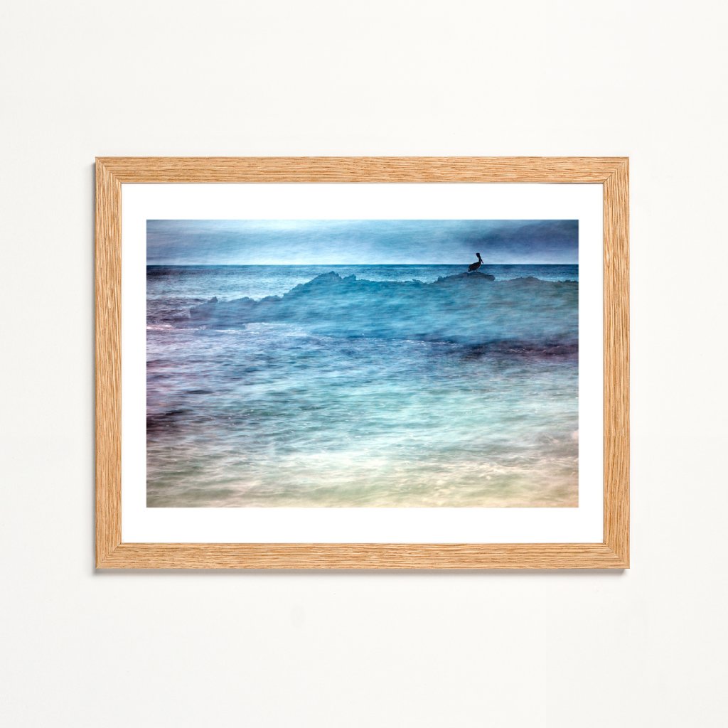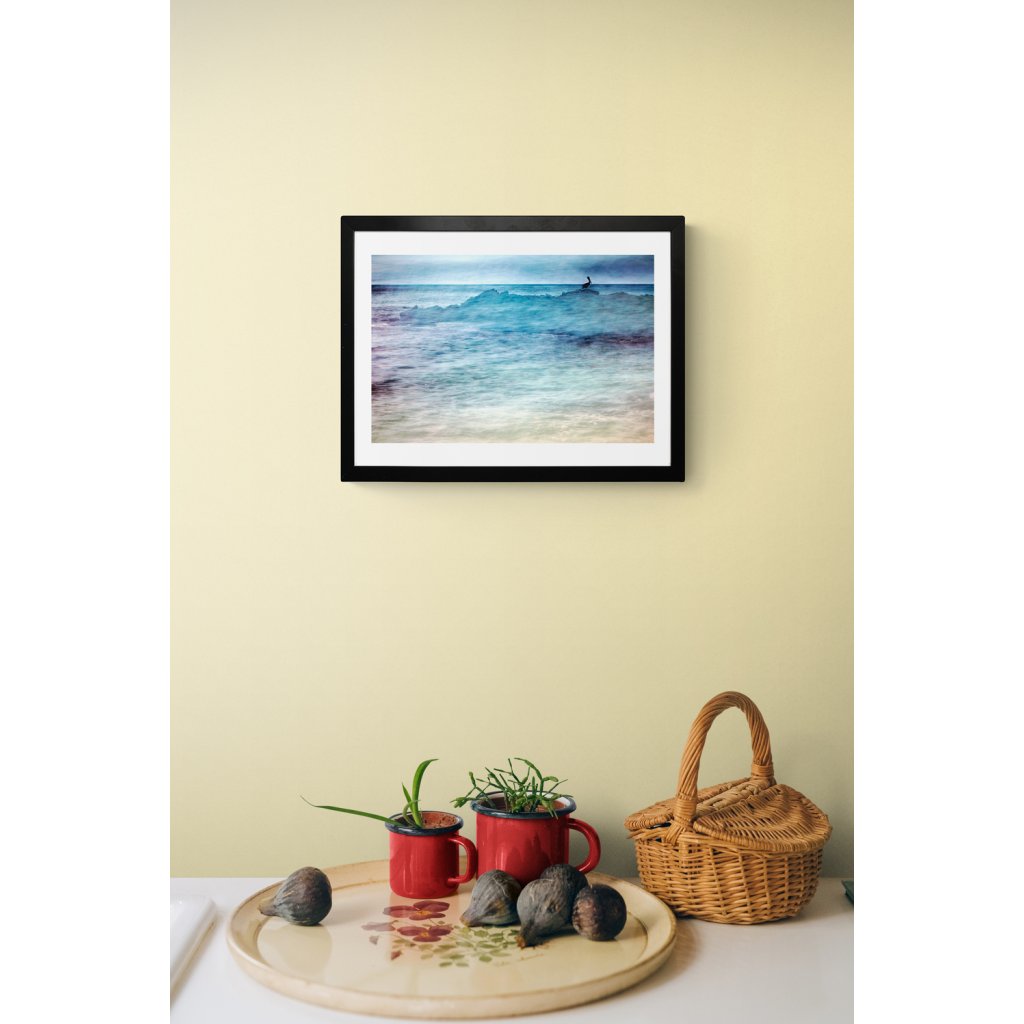 Fotografie s horizontální kompozicí a jemně rozmazanou hladinou moře, která působí téměř étericky. Silueta ptáka na skalním výběžku vytváří silný vizuální kontrast a bere si naši pozornost. Modré a tyrkysové tóny podporují pocit hloubky a nekonečna. Ideální do minimalistických, moderních nebo přímořsky laděných interiérů.