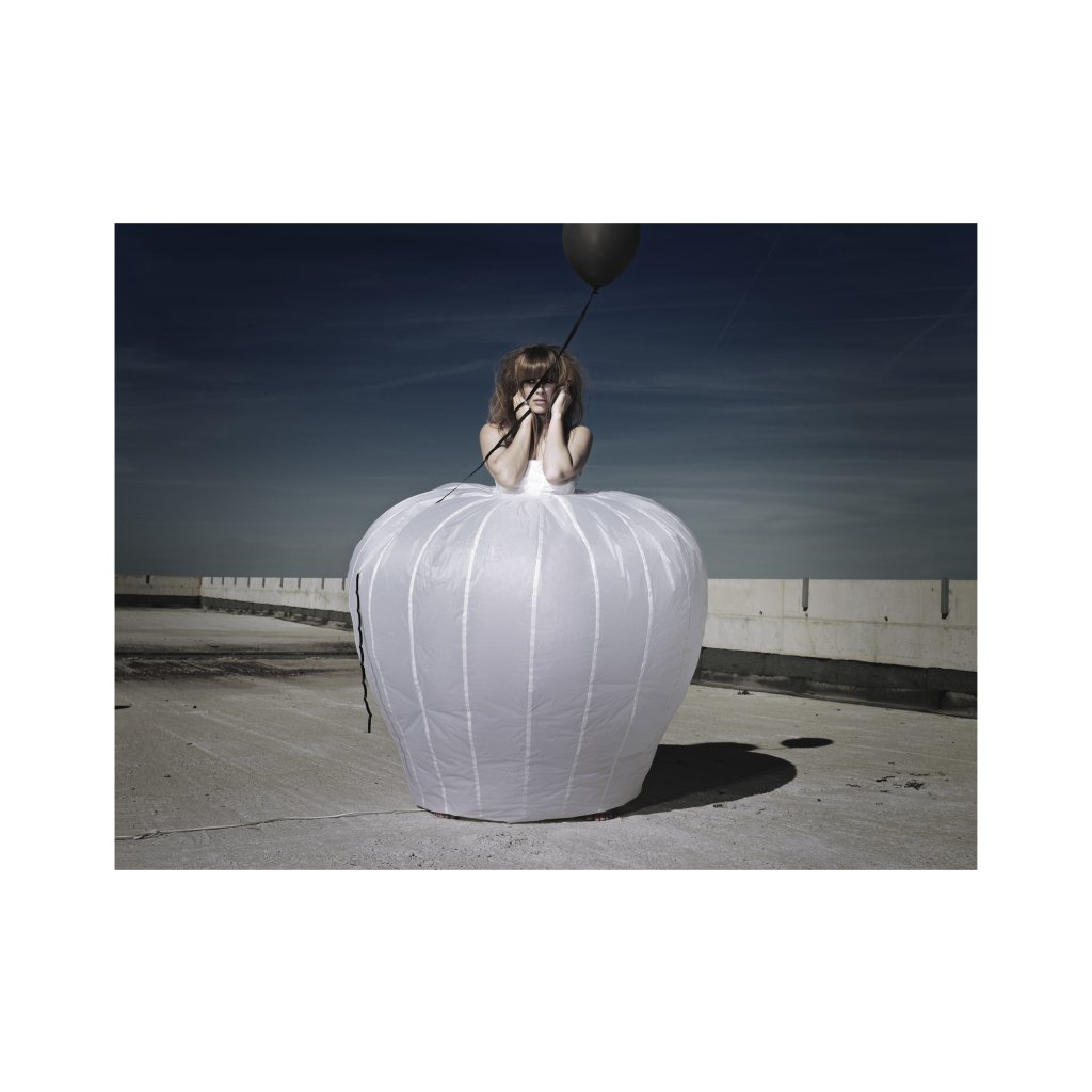 Na prázdném, betonovém prostoru stojí ženská postava zahalená do nepřirozeně nafouklých velkých bílých šatů, jenž připomínají ochranný obal i omezení zároveň. Černý balónek držený nad hlavou působí jako symbol kontroly nebo neustálého tlaku, který je přítomen, ale křehký. Kontrast mezi jemnou bílou formou, tmavým nebem a tvrdým betonovým prostředím vytváří silné napětí a pocit osamění. Fotografie pracuje s minimalismem a symbolikou a nechává prostor pro osobní interpretaci zobrazeného módního modelu i celkového snímku.