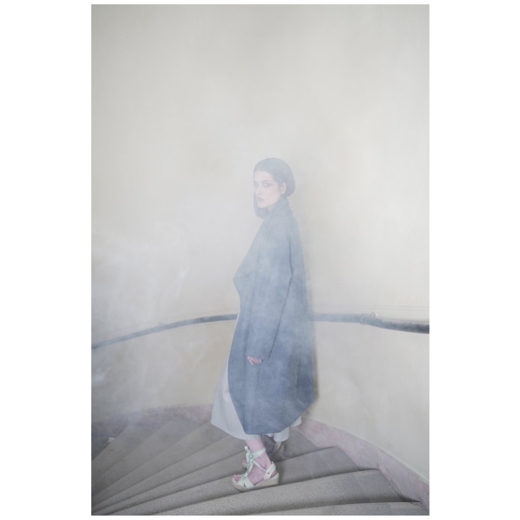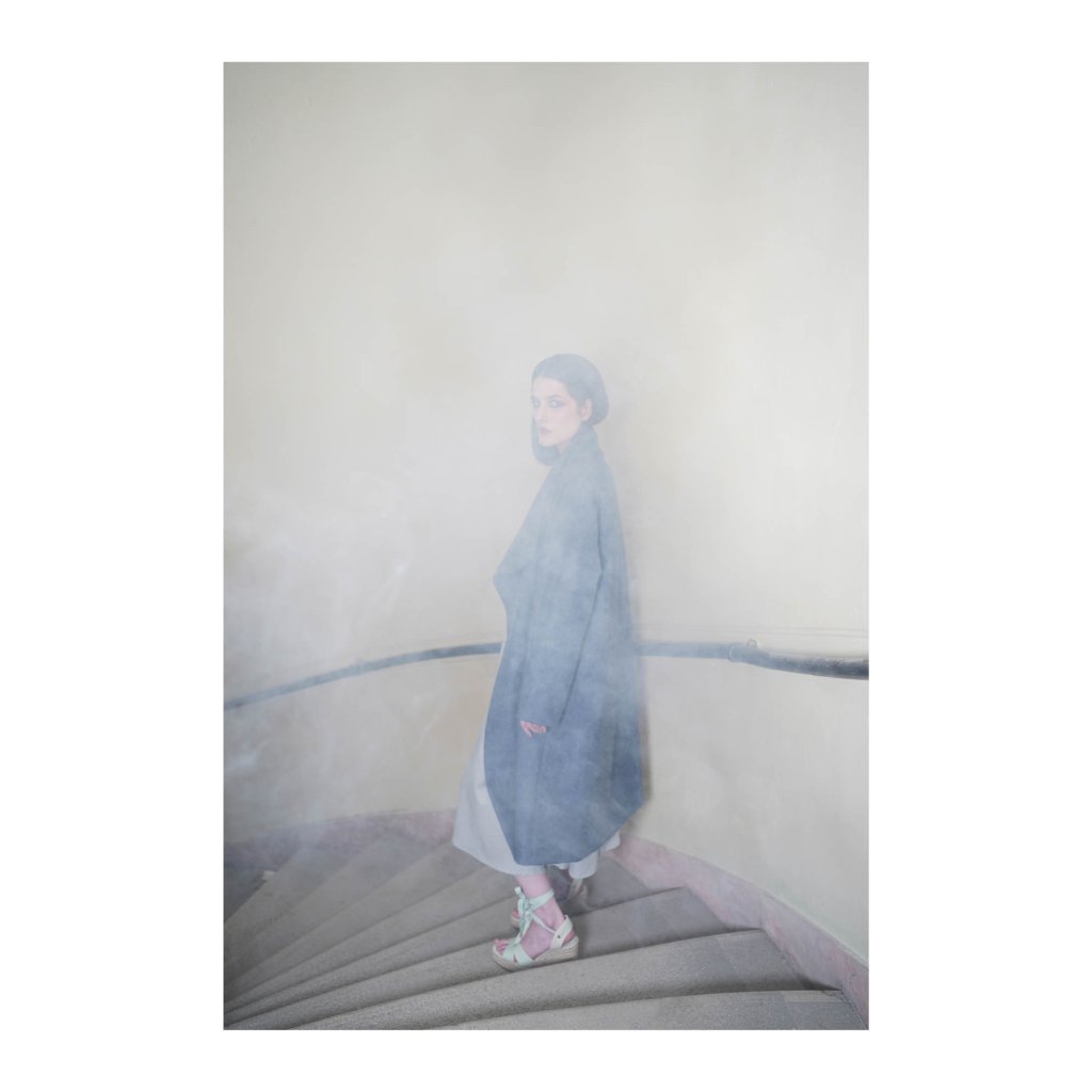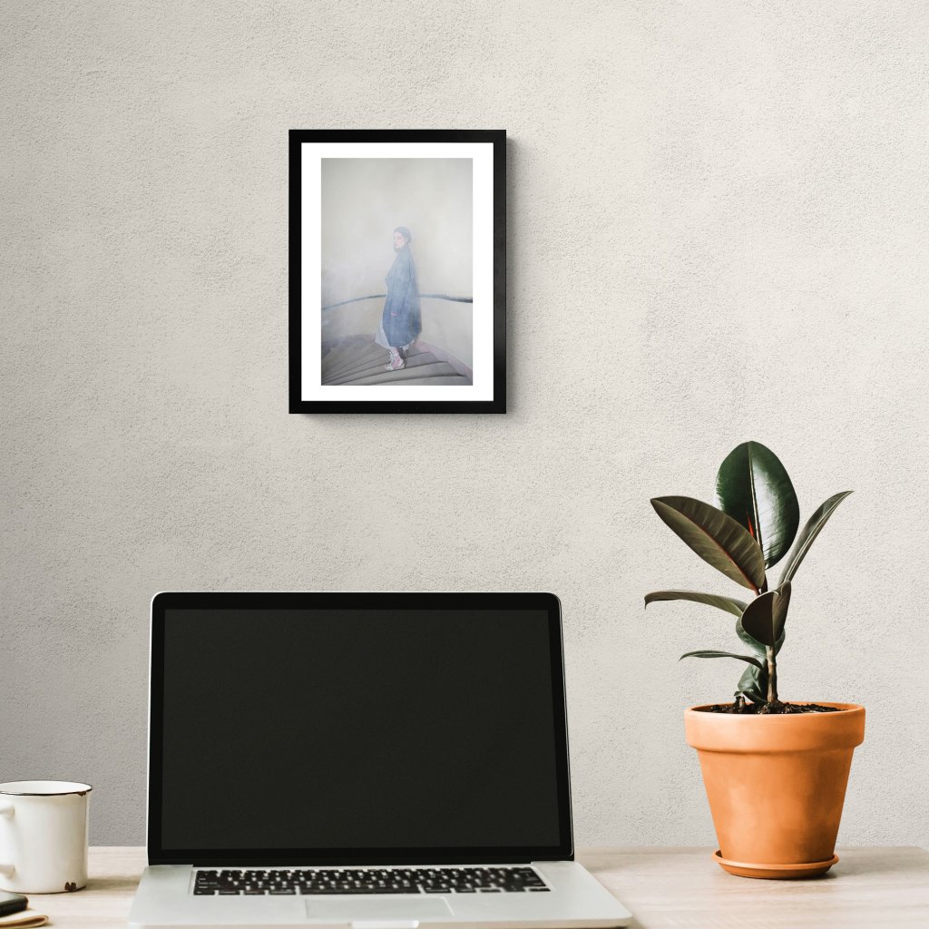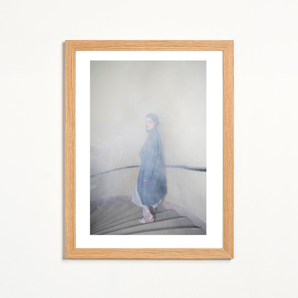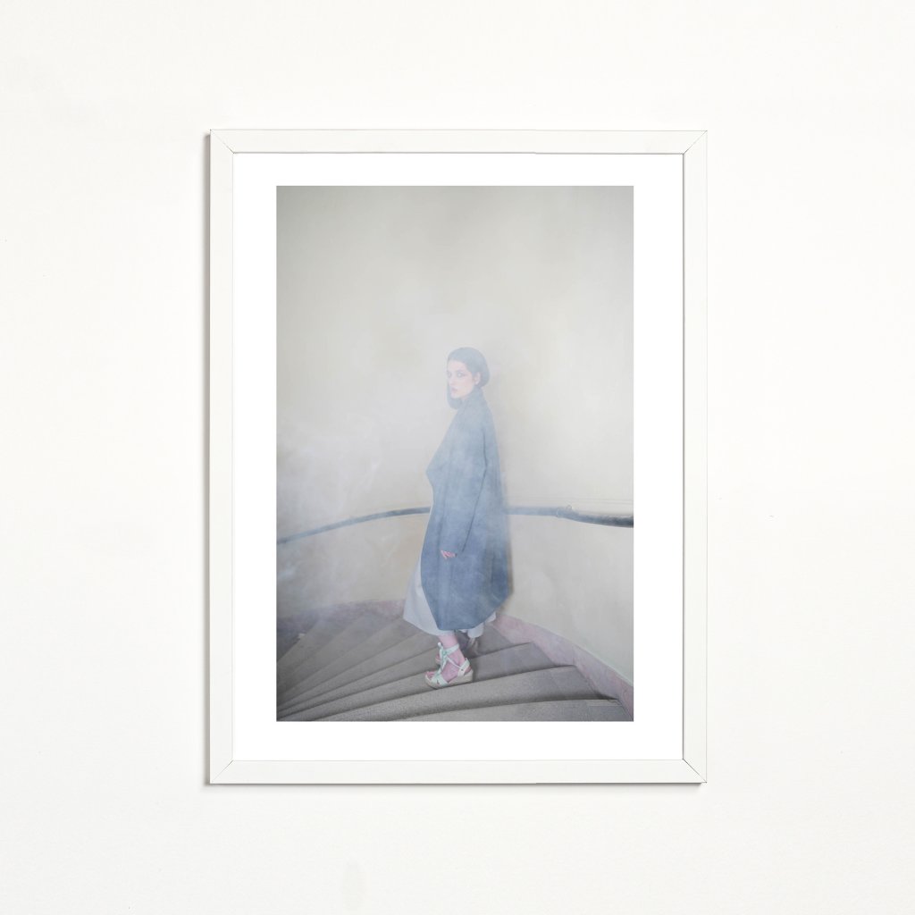 Fotografie pracuje s mlhou, světlem a minimální barevností, která nechává vyniknout tichému napětí celé scény. Žena na schodišti působí křehce a vzdáleně, jako by byla na hraně mezi přítomností a vzpomínkou. Rozostření a kouř vytvářejí pocit nejistoty, zpomalení a vnitřního usebrání, zatímco točité schodiště prostoru dodává jistý řád. Kontemplativní a působivý motiv, který v interiéru vytváří atmosféru ticha a jemné emocionální hloubky.