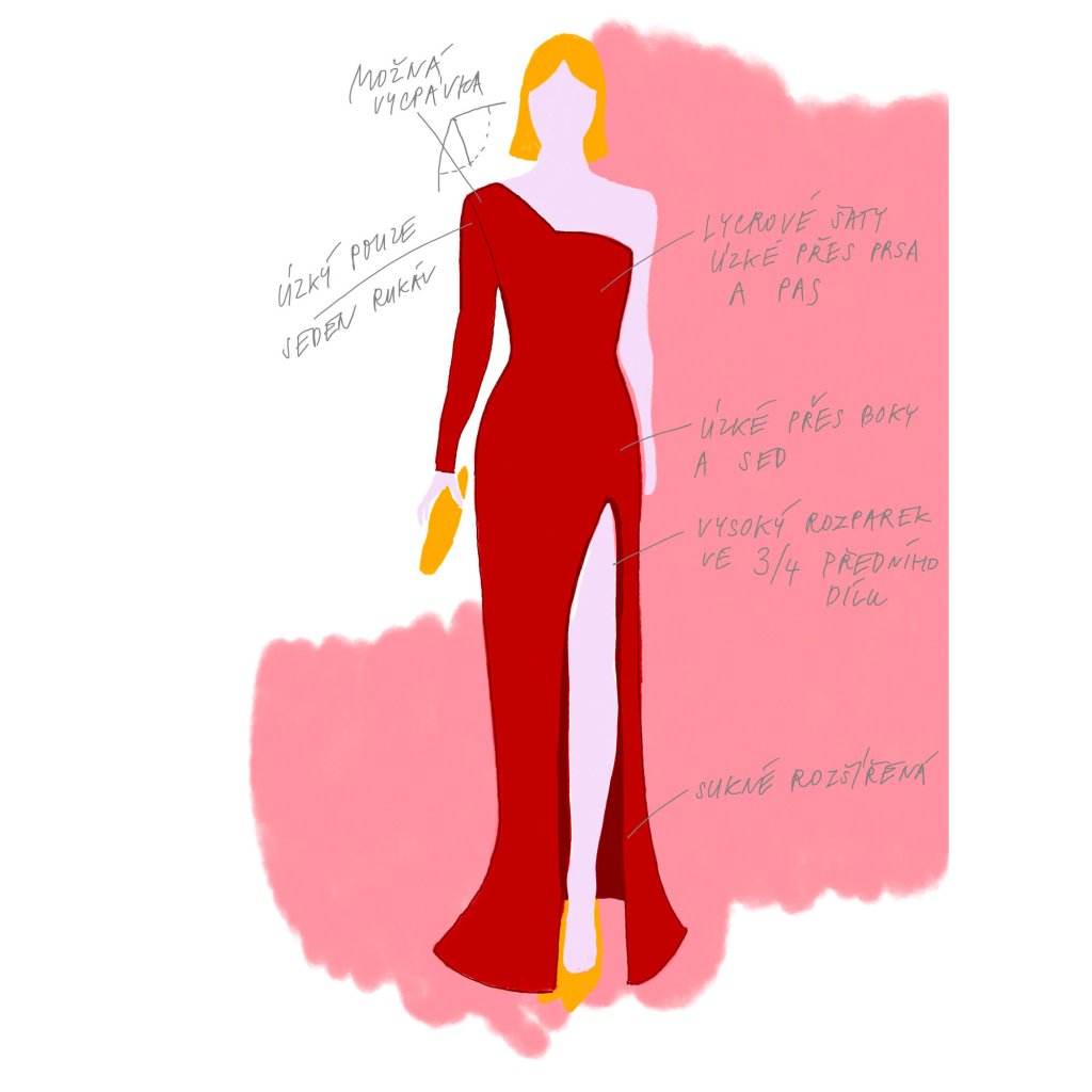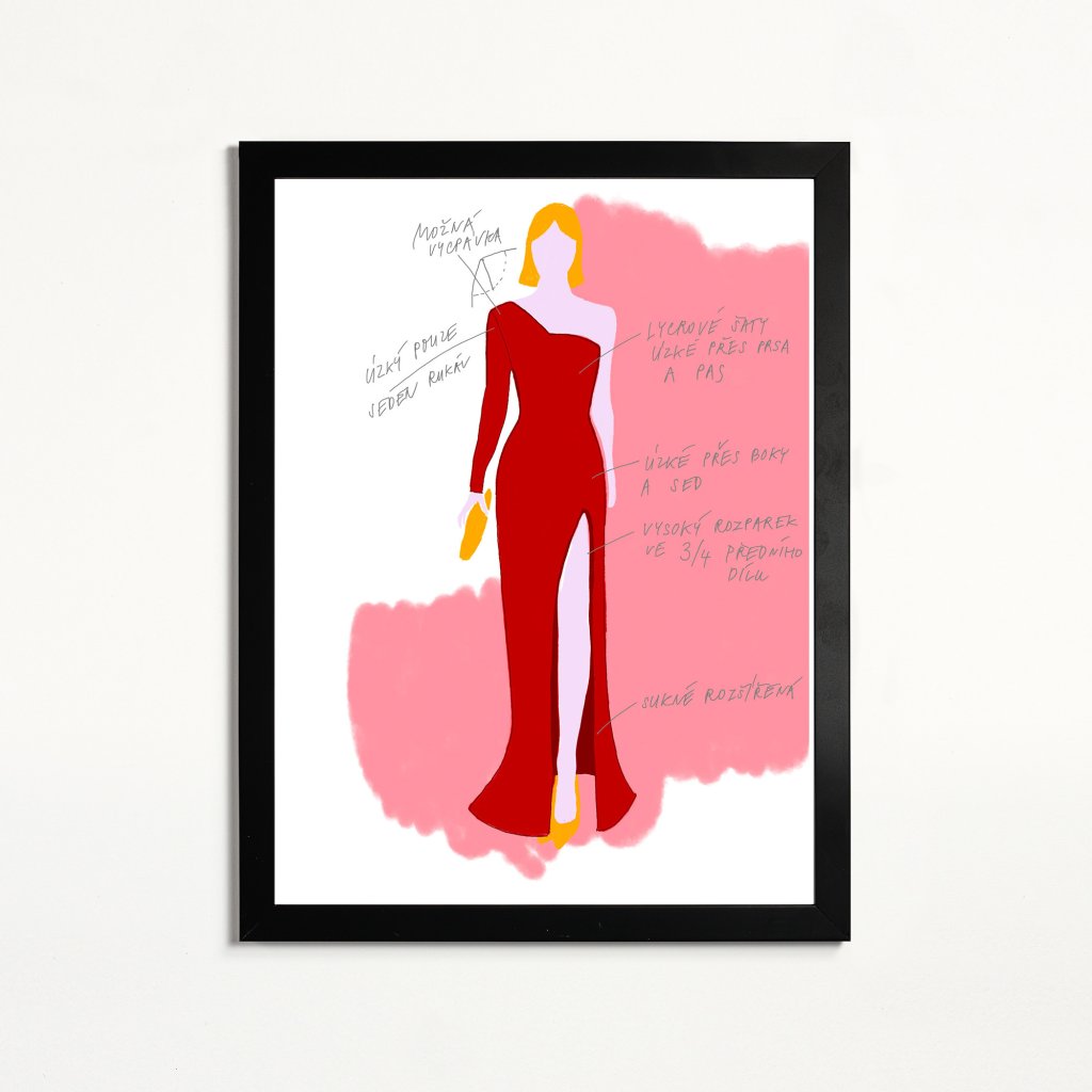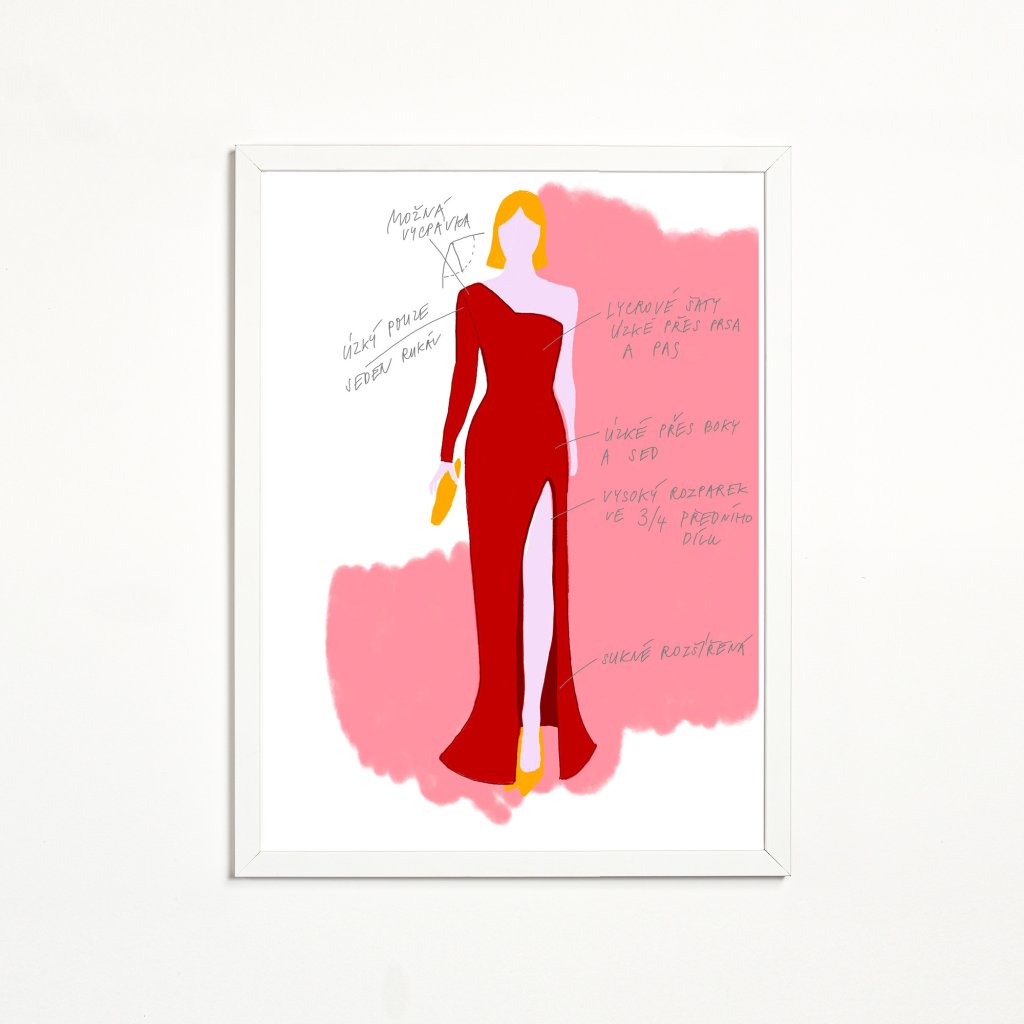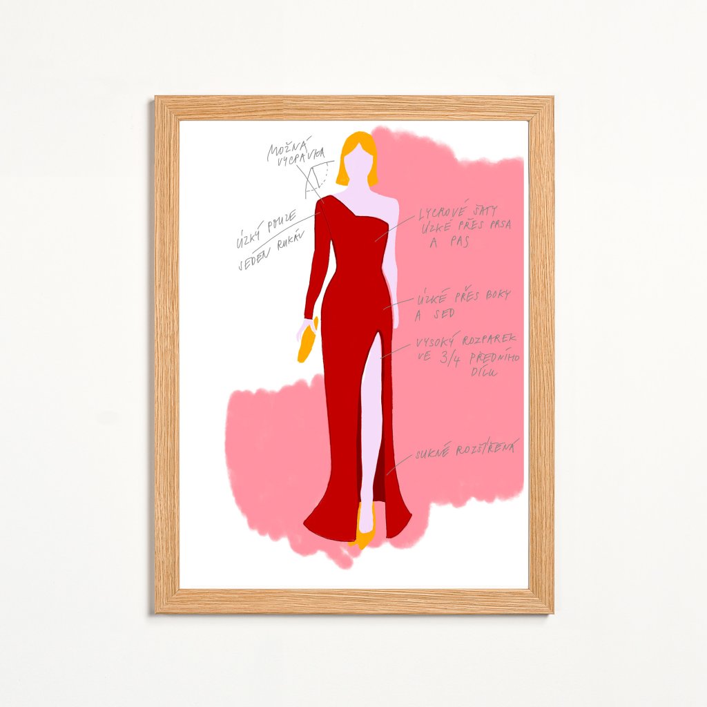 Ilustrace pracuje s čistým tvarem postavy a výraznou červenou plochou šatů, které dominují celé kompozici. Návrhářské poznámky a rukopisné zásahy dodávají obrazu procesní charakter a pocit pohledu do zákulisí tvorby. Kontrast jemného růžového pozadí a syté barvy šatů zvýrazňuje eleganci i kontrolu nad formou. Dílo je nejen skica, ale i samostatný výtvarný objekt, který v interiéru funguje jako subtilní, ale výrazný prvek.