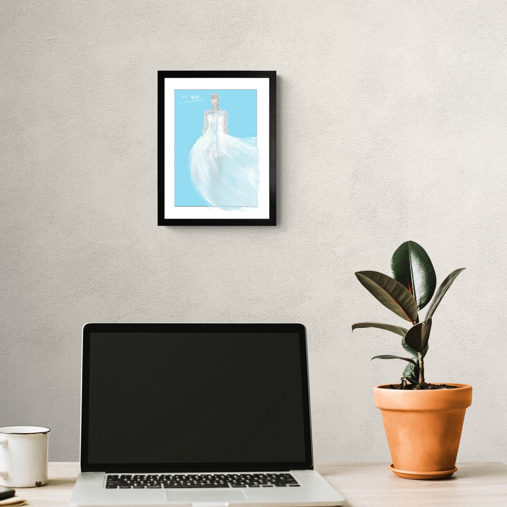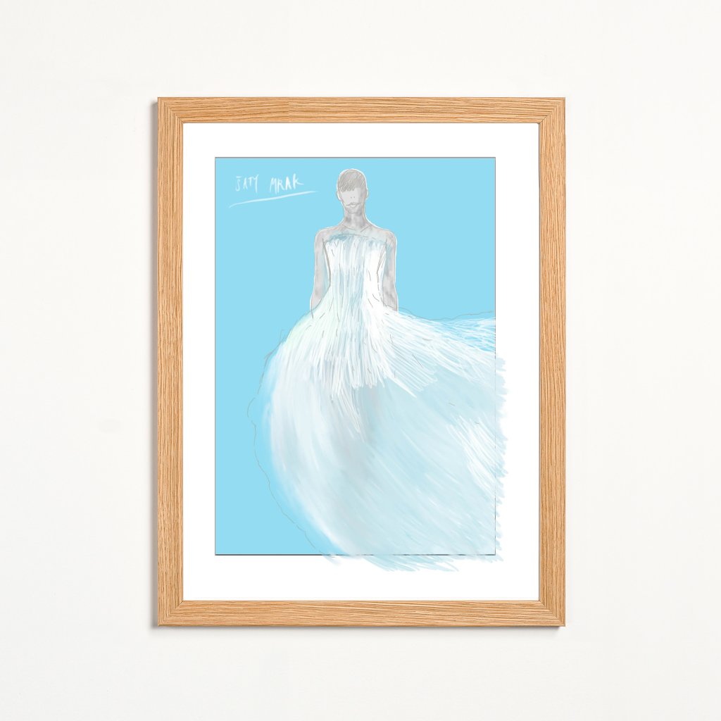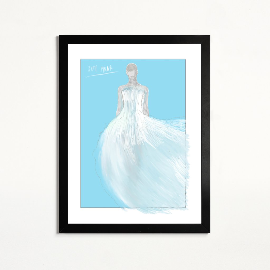 Ilustrace staví na éterické práci s linií a barvou, která nechává siluetu postavy téměř mizet ve splývavé hmotě šatů. Světle modré tóny a rozevlátý tvar vytvářejí dojem lehkosti, klidu a pomíjivosti. Dílo je na pomezí módní skici a volné ilustrace. Celkově působí jemně, vzdušně a přirozeně zapadá do interiérů, které dávají prostor tichým emocím a subtilní kráse.