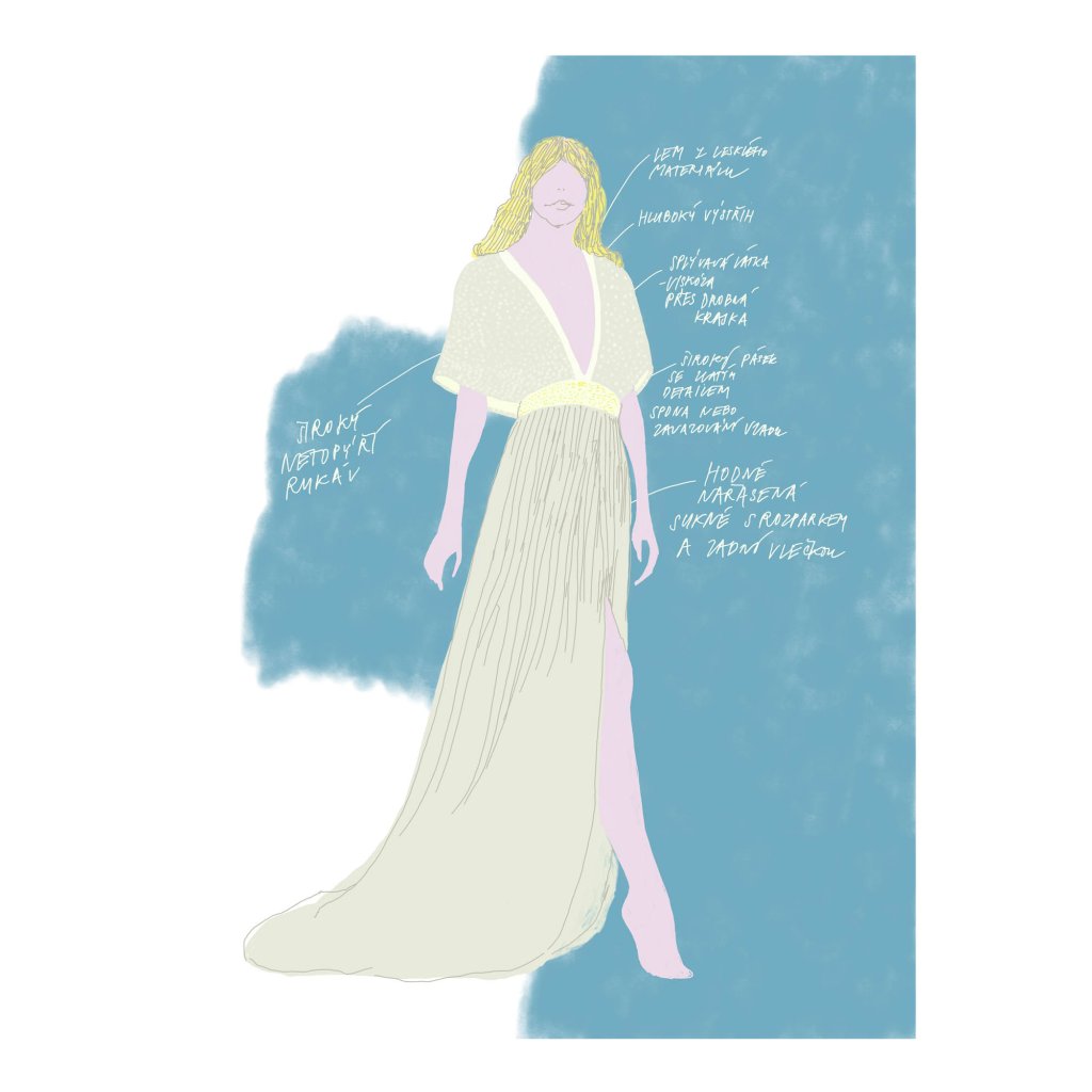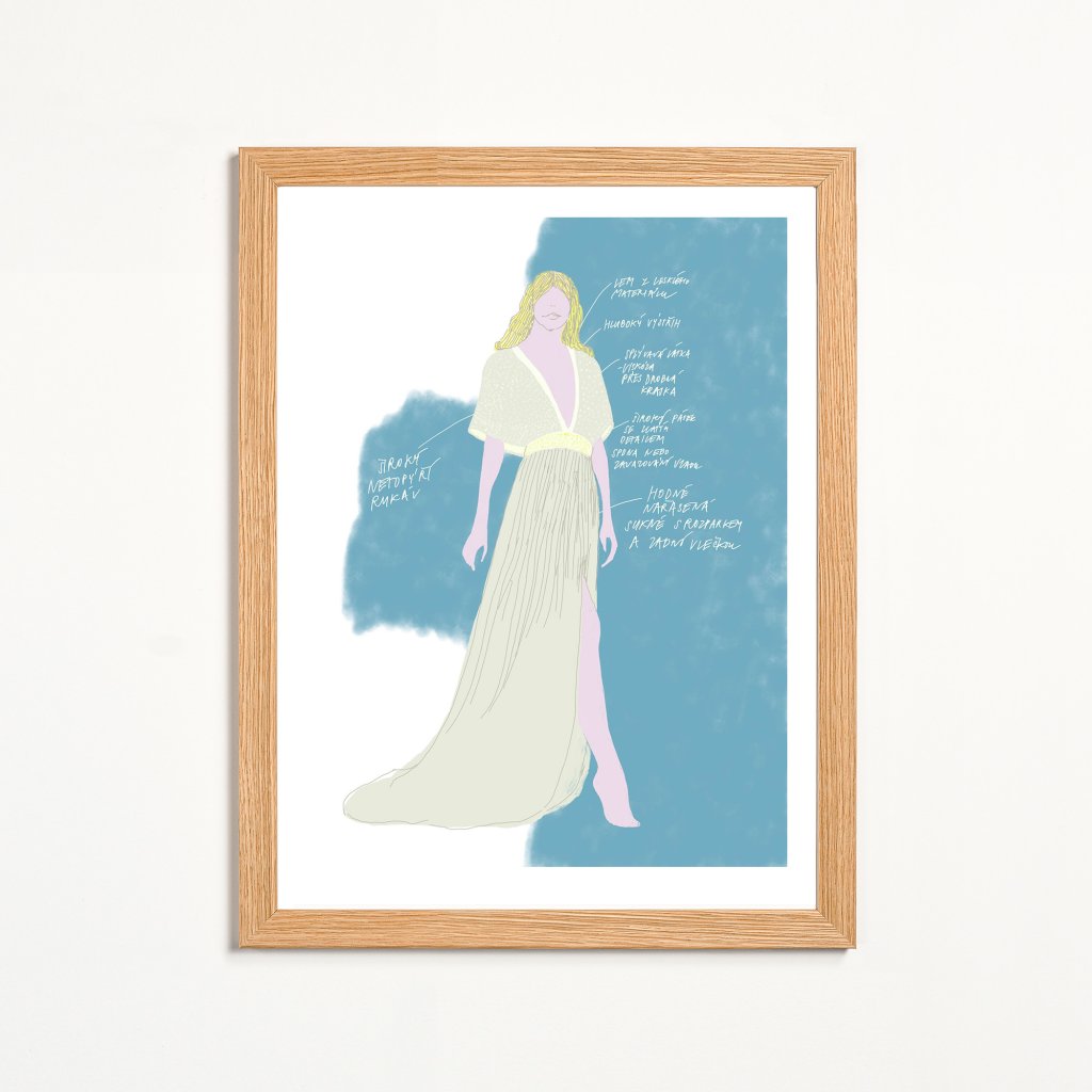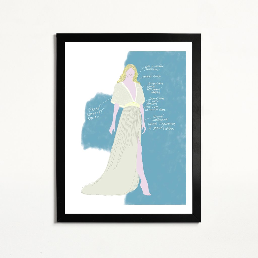 Ilustrace pracuje s měkkou barevnou paletou a splývavou siluetou, která působí jemně, ale sebevědomě. Lesklé vrstvy, nařasená sukně a jemně naznačené detaily vytvářejí dojem pohybu a tiché elegance. Poznámky návrhářky dodávají obrazu intimní charakter. Celek vyzařuje lehkost, snovost a jemnou romantiku, která v prostoru působí klidně a nenuceně.