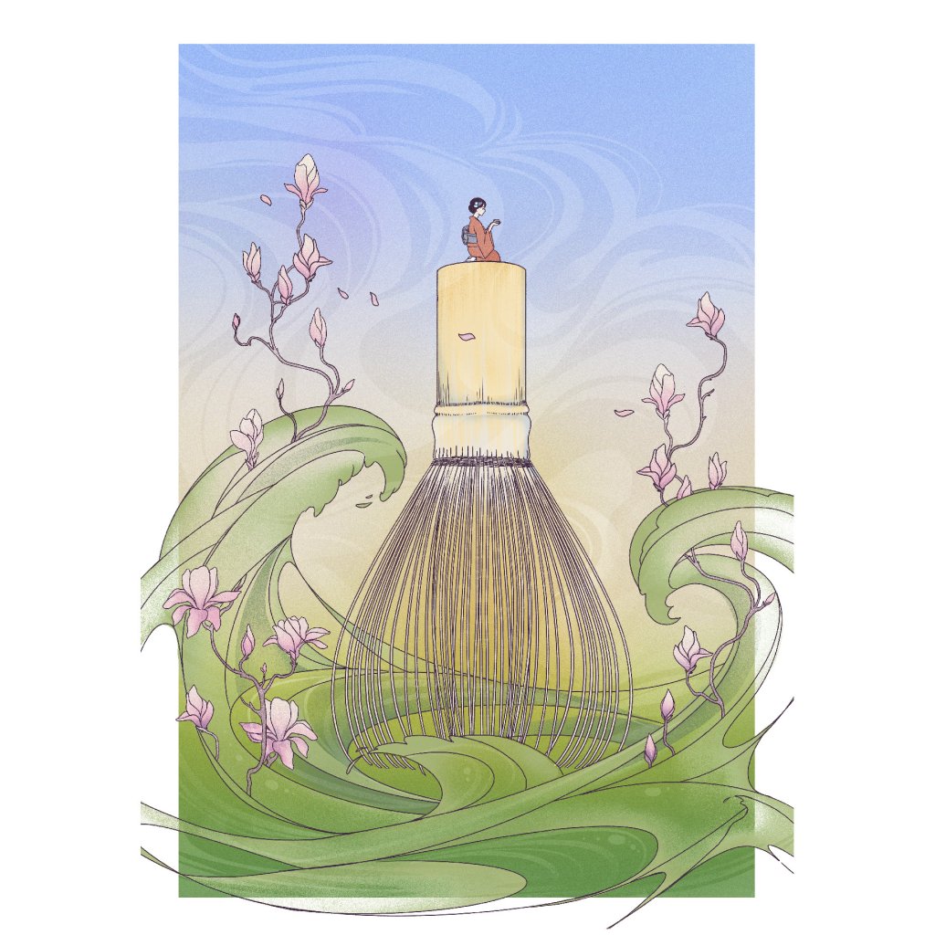 Motiv čajové metličky proměněné v krajinu působí meditativně a jemně zpomaluje tempo vnímání. Plynulé linie, měkké barvy a květinové detaily vytvářejí harmonickou scénu, která evokuje rovnováhu a vnitřní klid. Ilustrace spíše naznačuje, než vysvětluje, a právě tím získává svou sílu. Hodí se do prostoru, kde má obraz uklidňovat, kultivovat atmosféru a přirozeně dotvářet prostředí bez zbytečné okázalosti. Přirozeně doslova stvořený pro kvalitní čajovny nebo prodejny čaje.
